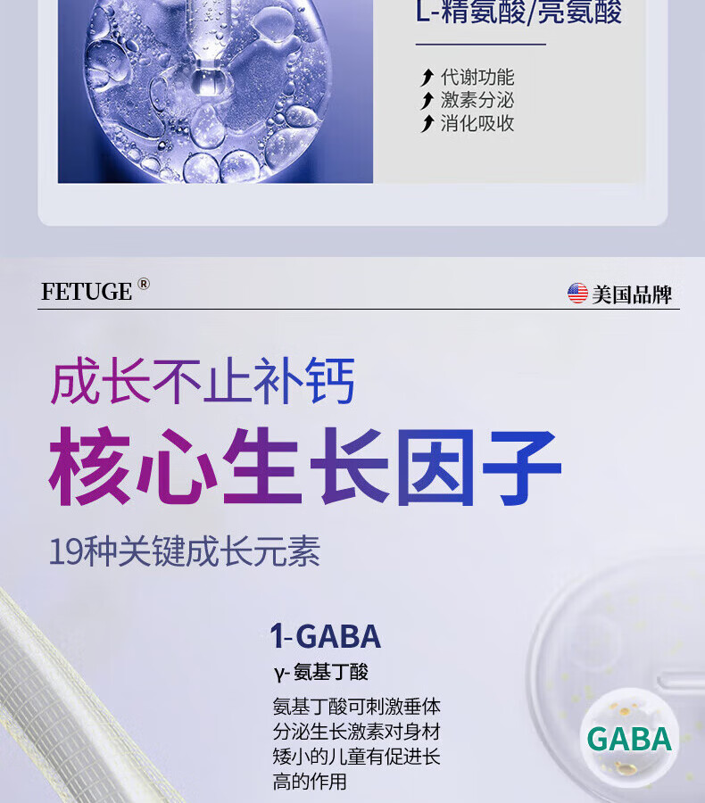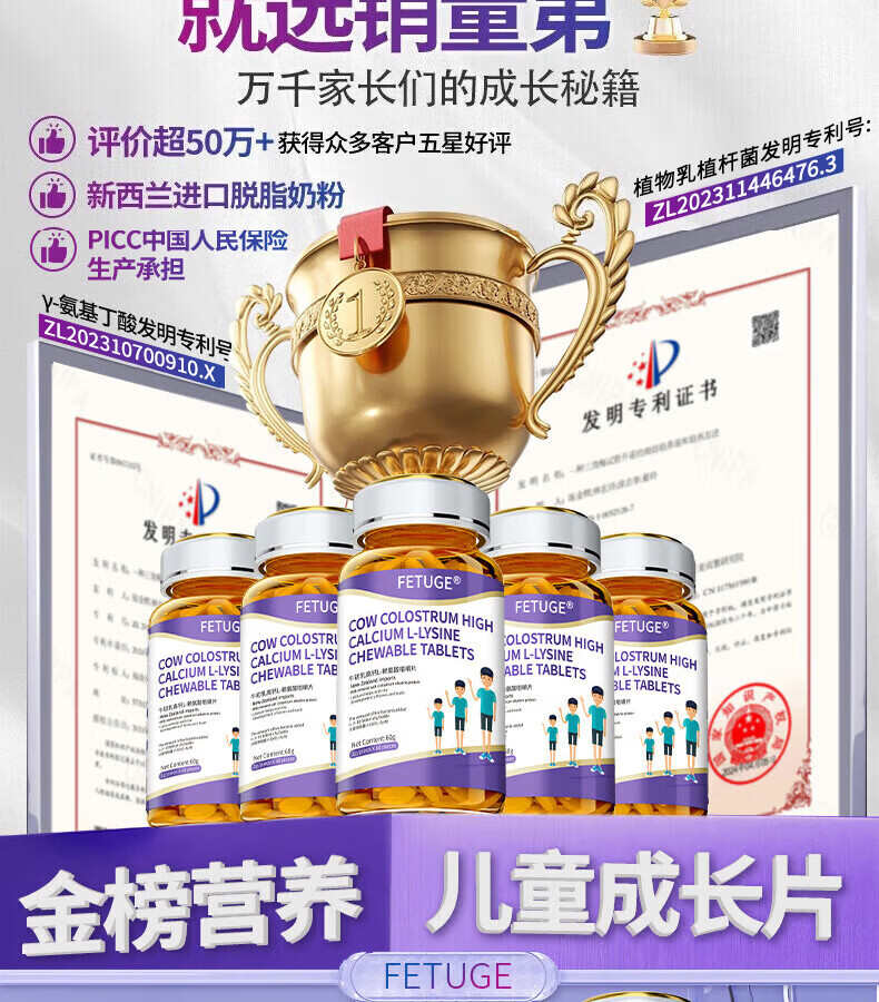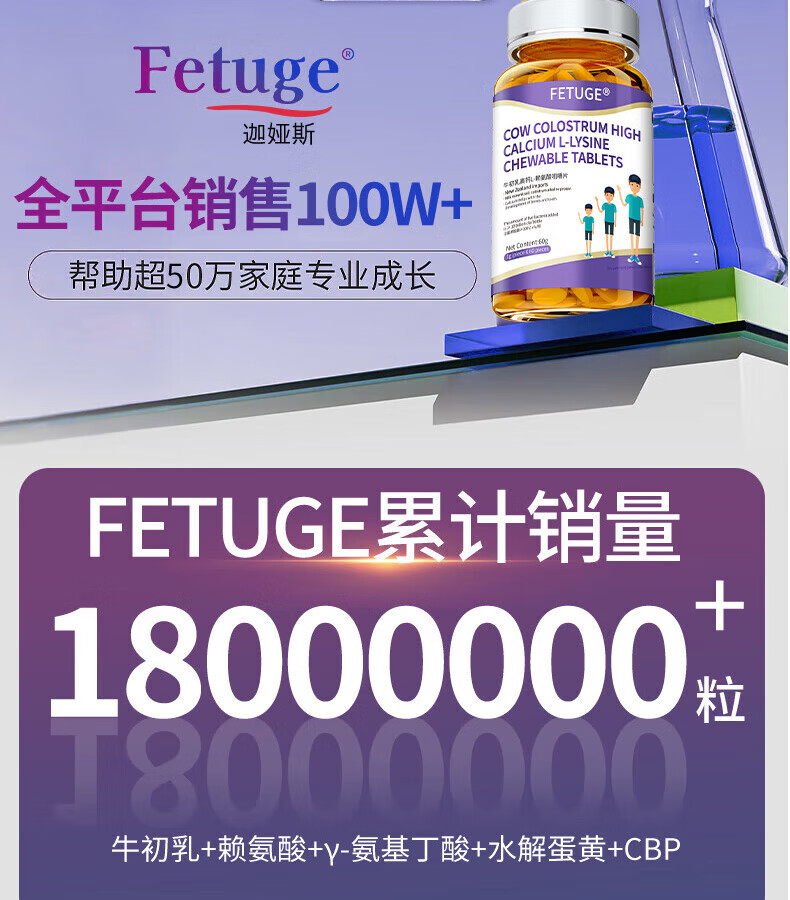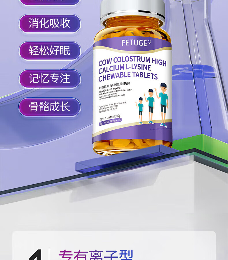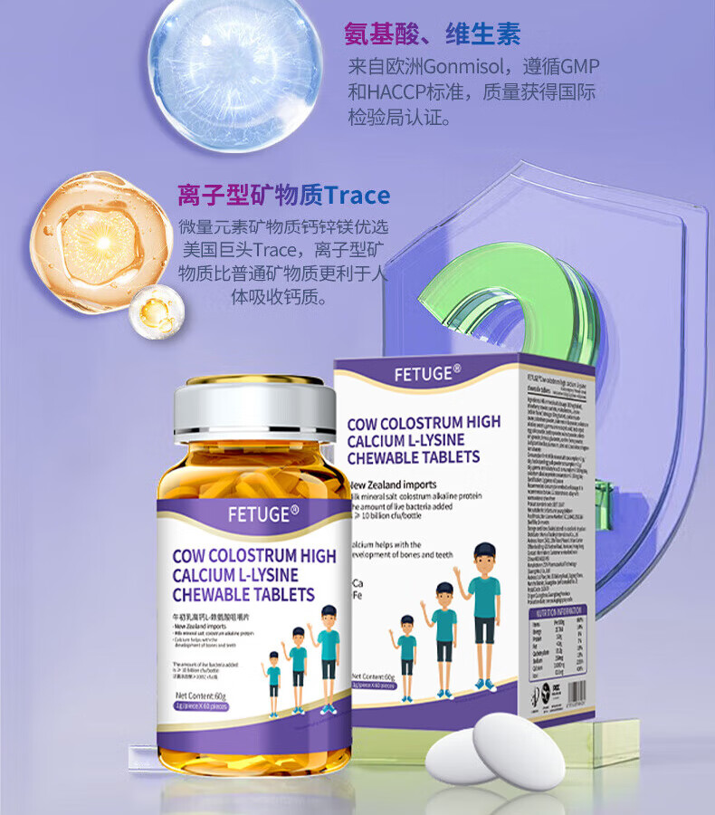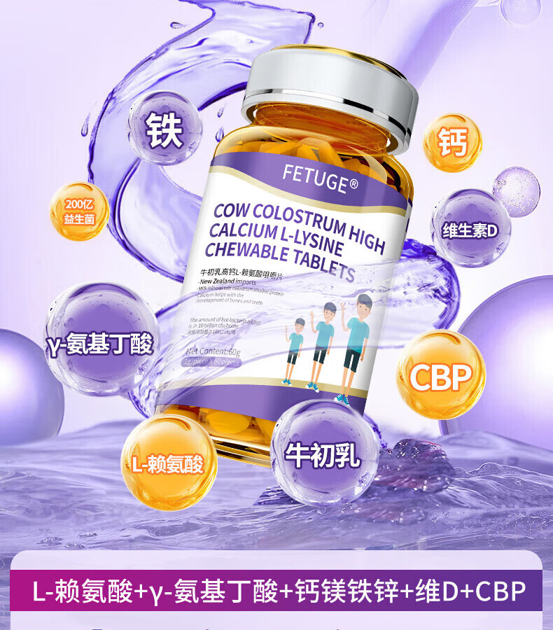FETUGE牛初乳成长赖氨酸助长高钙铁锌氨基丁酸γ儿童青少年生长素钙片 三瓶进阶装【买二送一】 60粒*3瓶