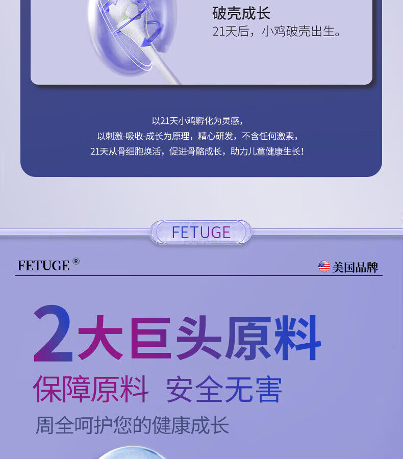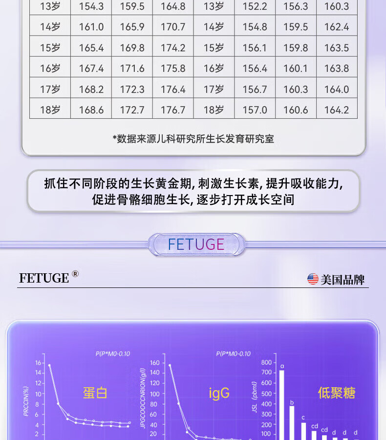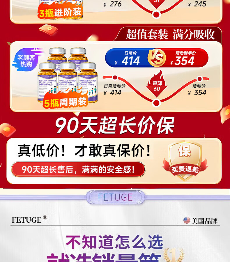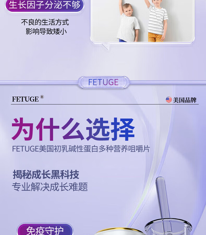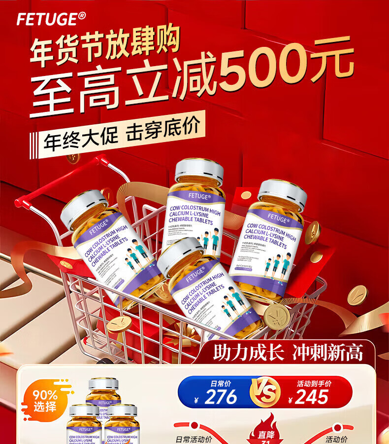 FETUGE牛初乳成长赖氨酸助长高钙铁锌氨基丁酸γ儿童青少年生长素钙片 三瓶进阶装【买二送一】 60粒*3瓶