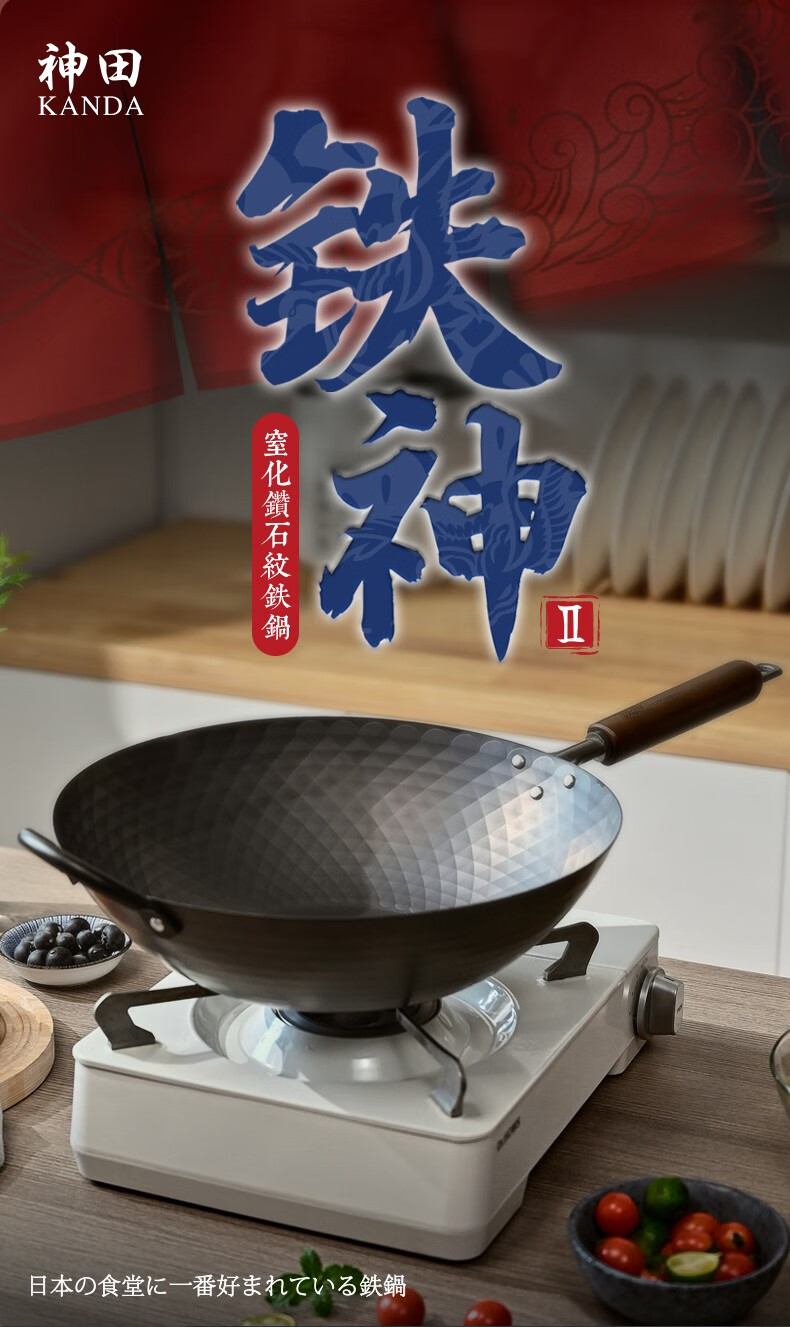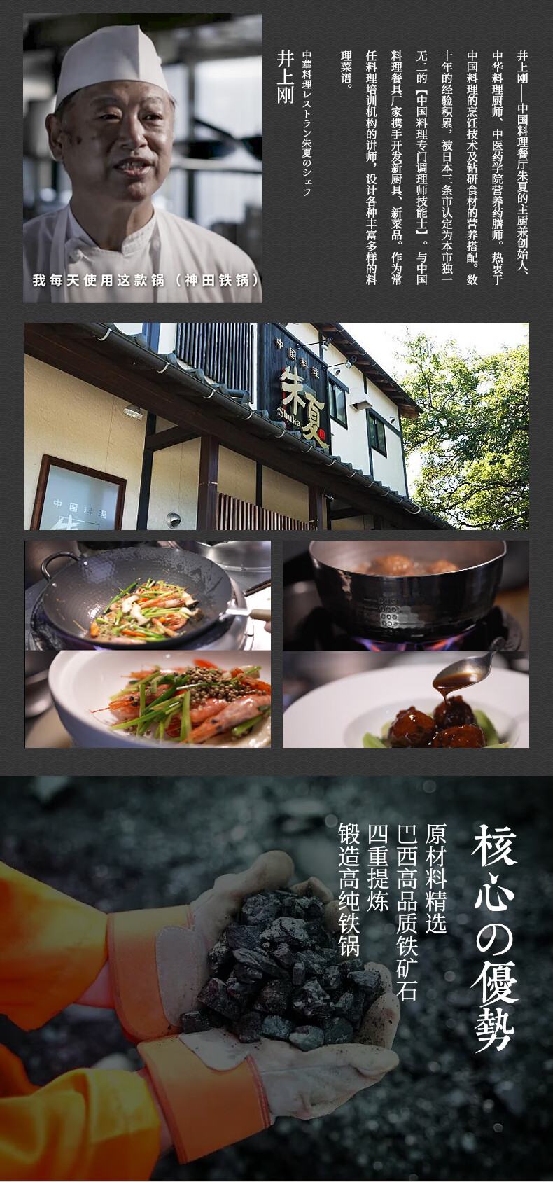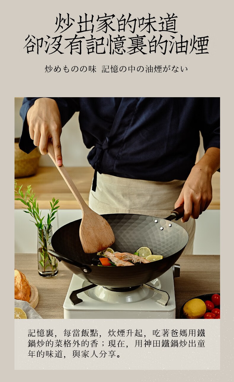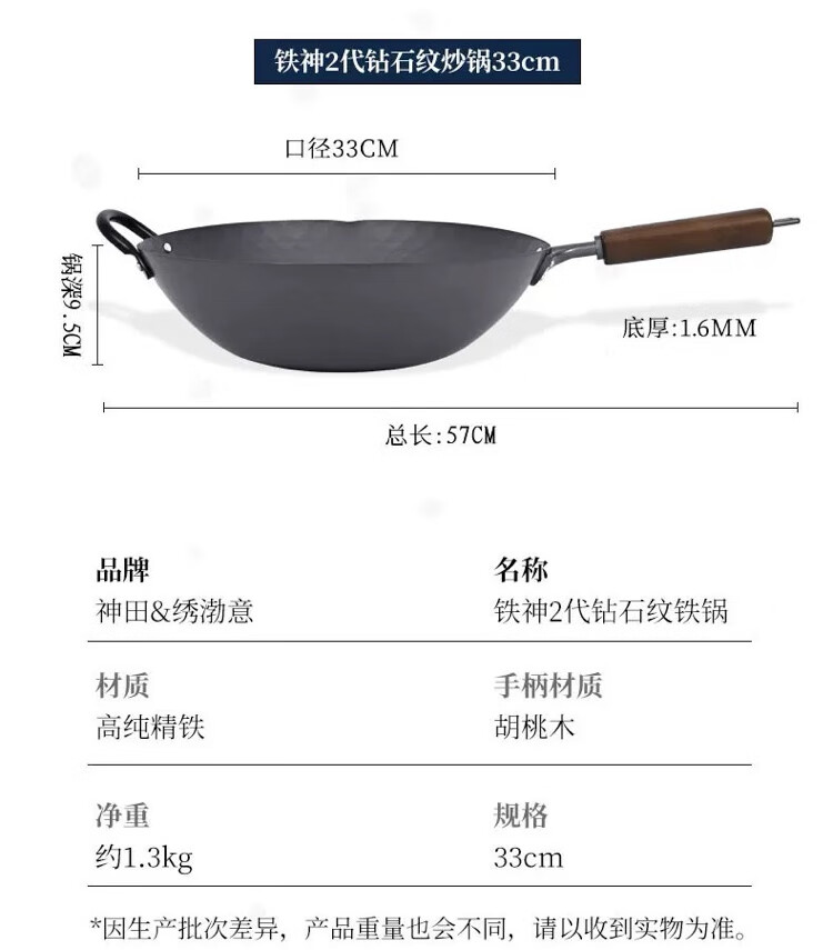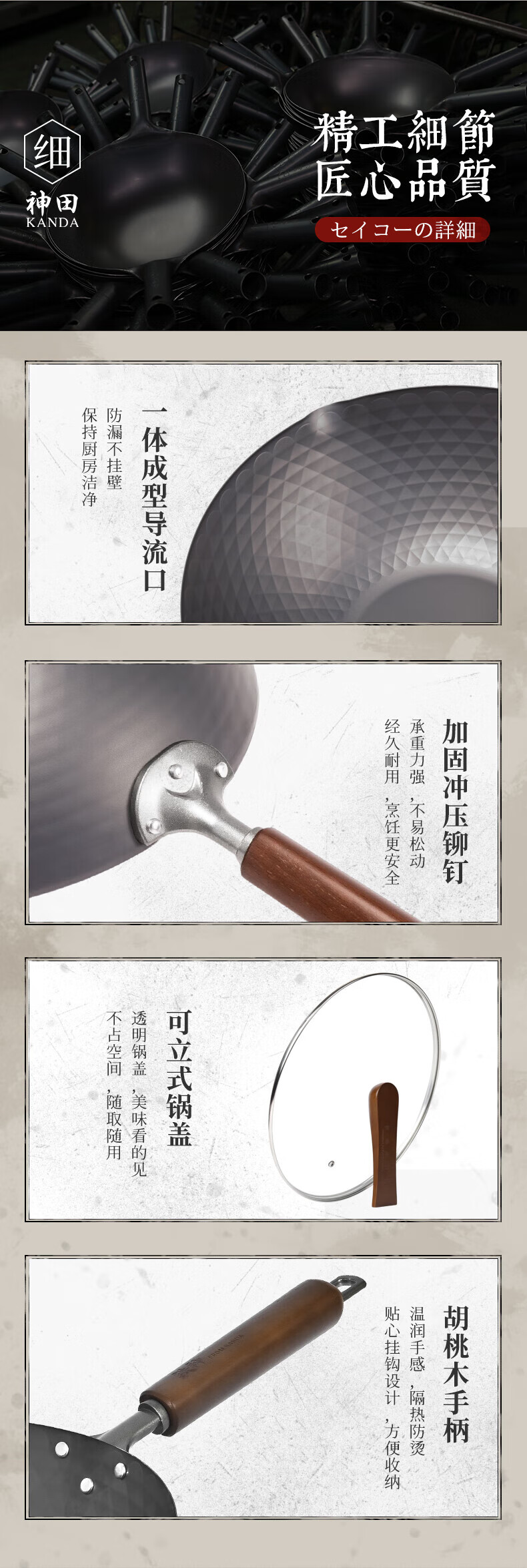 神田日本神田铁锅纯铁锅无涂层不易粘锅不易生锈平底炒锅家用炒菜锅 神田钻石纹铁锅(含玻璃盖) 33cm