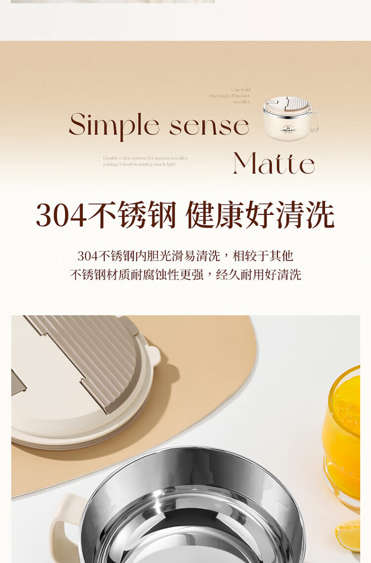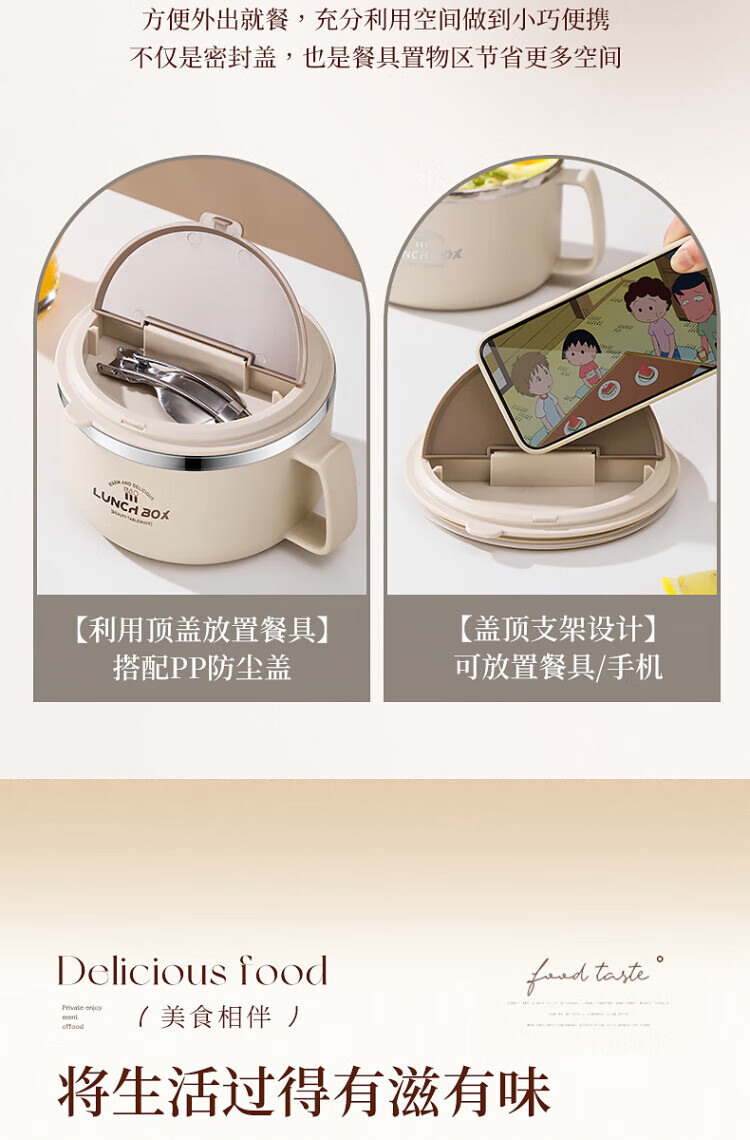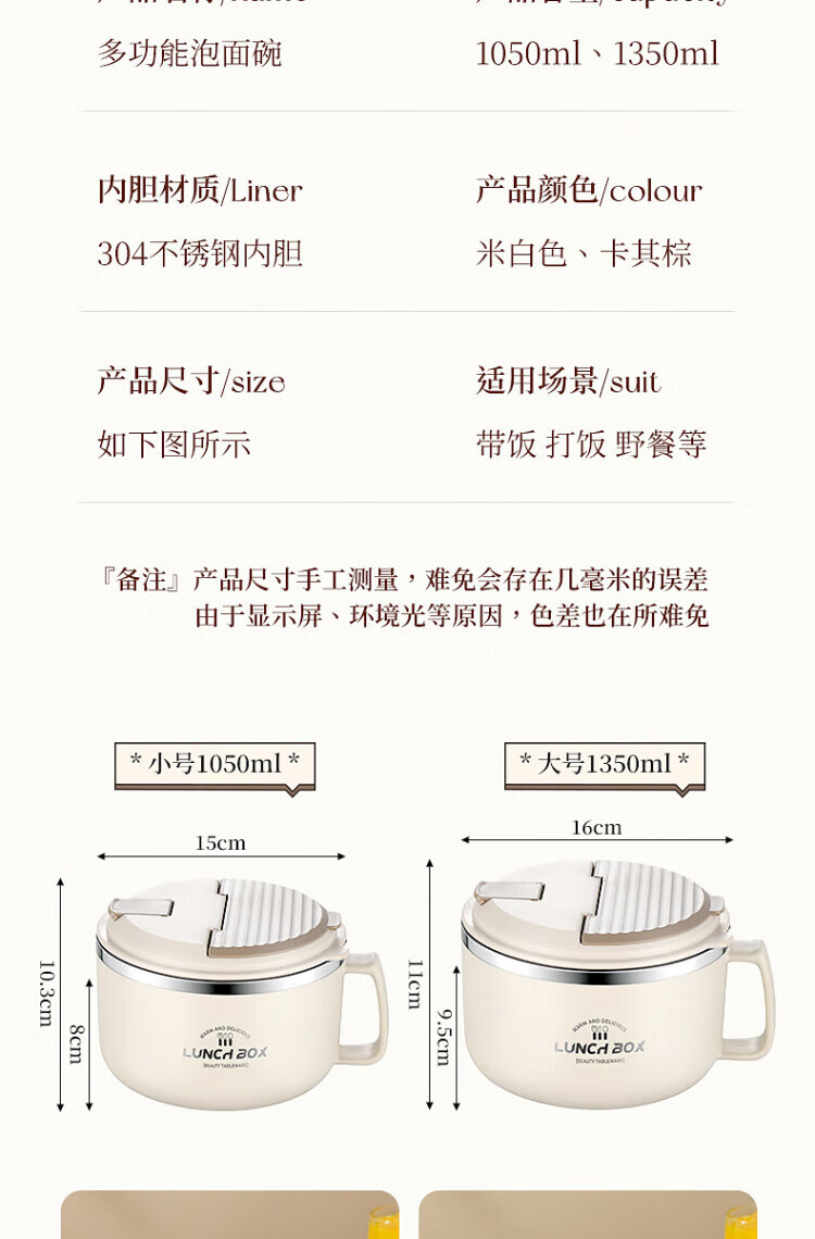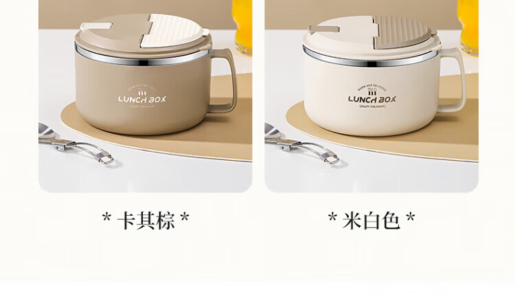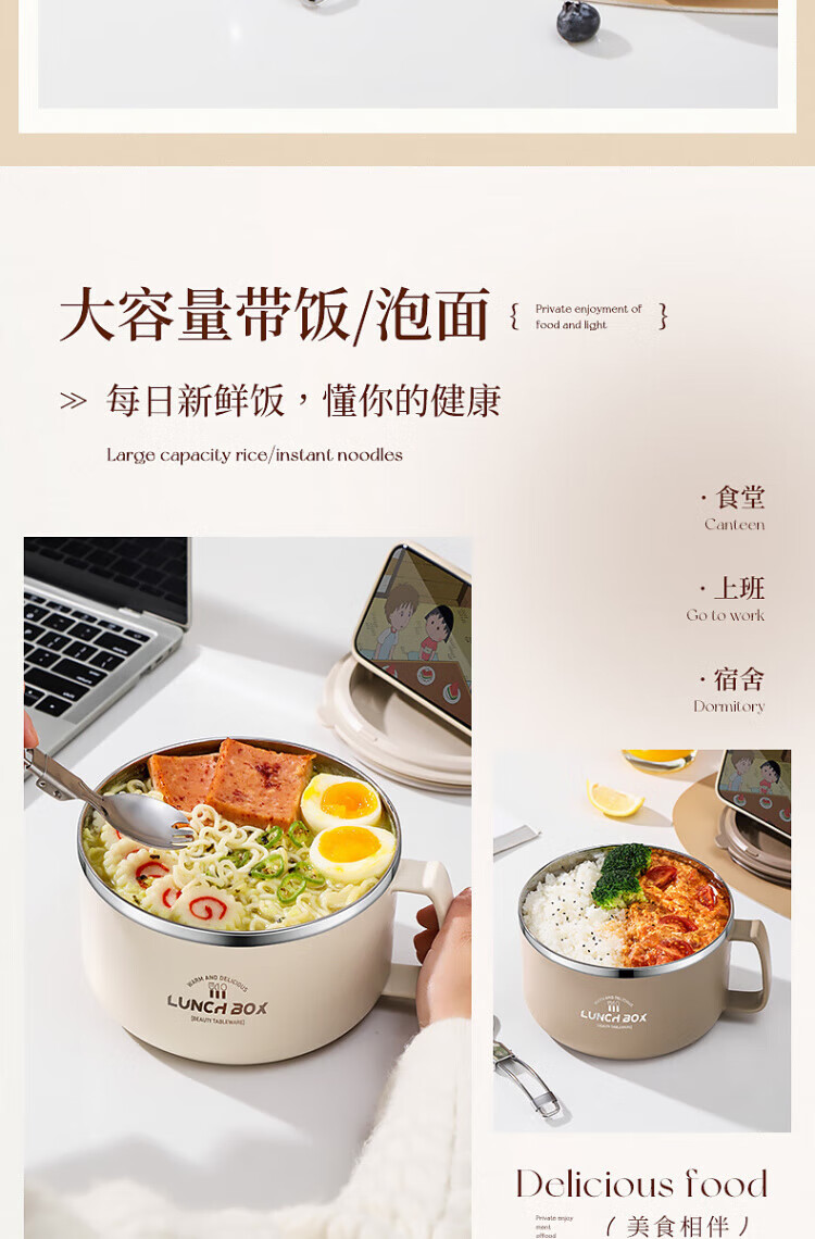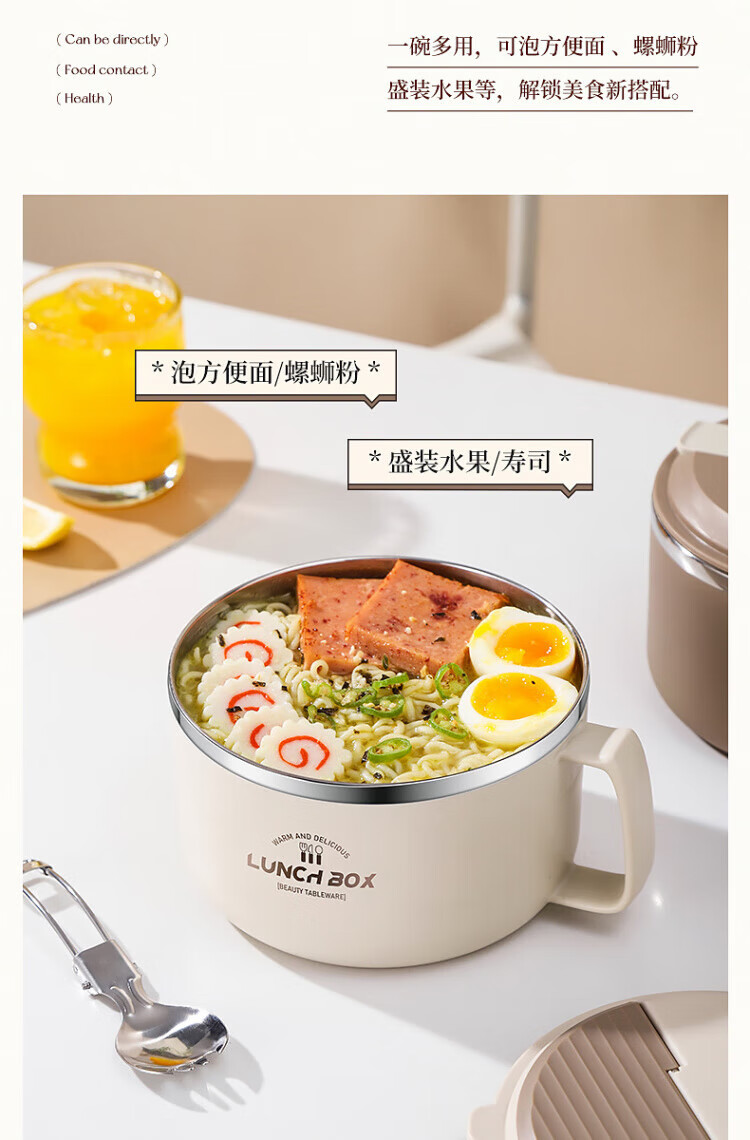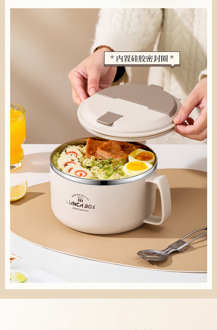 WCZ德国304不锈钢泡面碗带盖碗宿舍用学生方便碗泡面神器饭吃盒碗筷 米白色多用碗小号1050ml