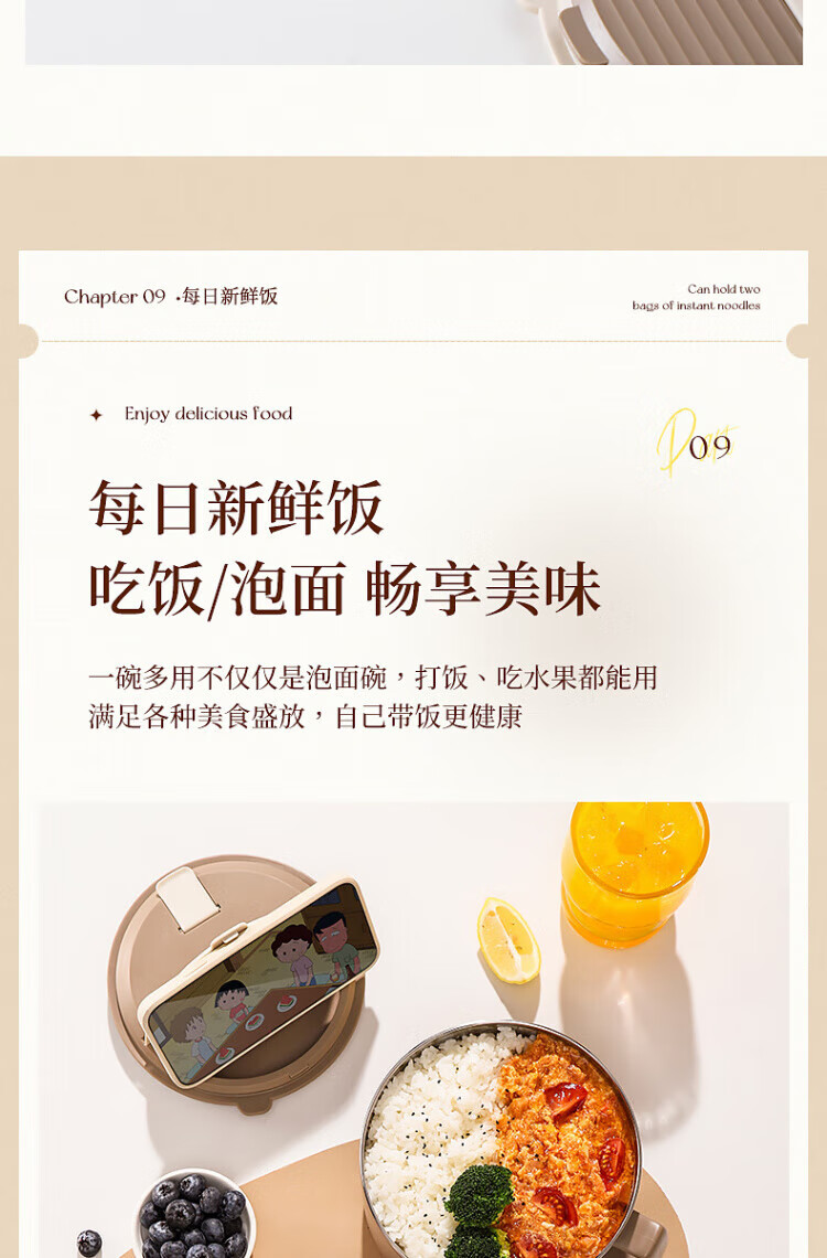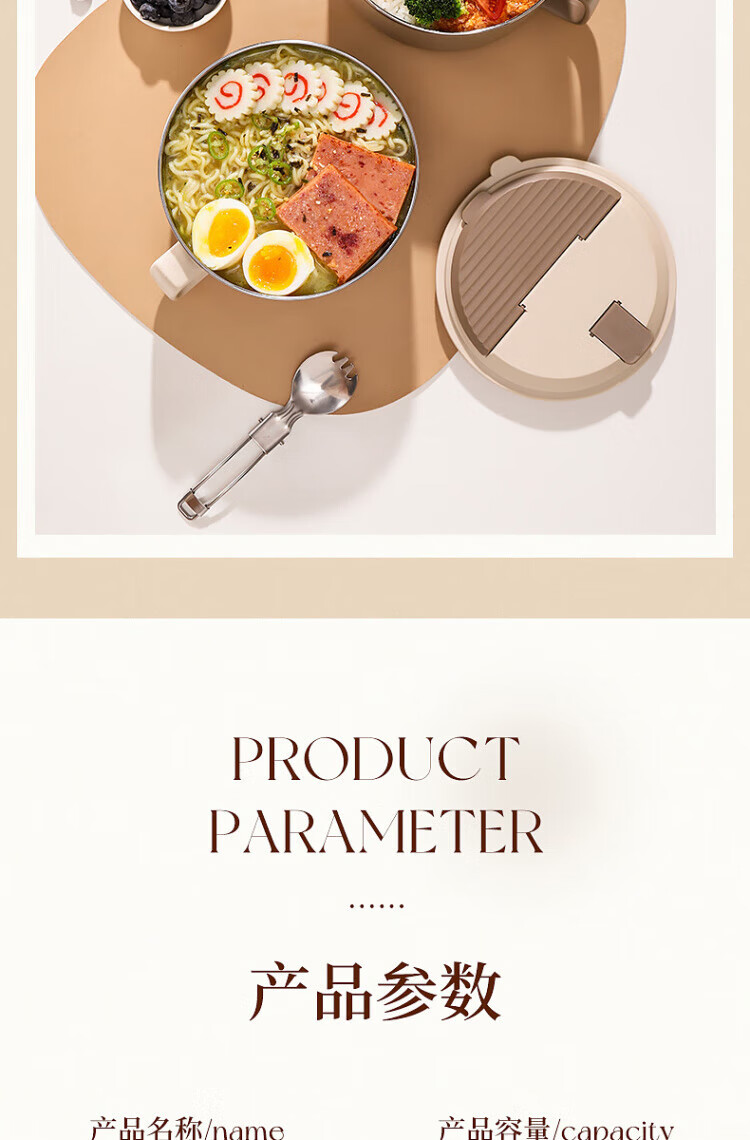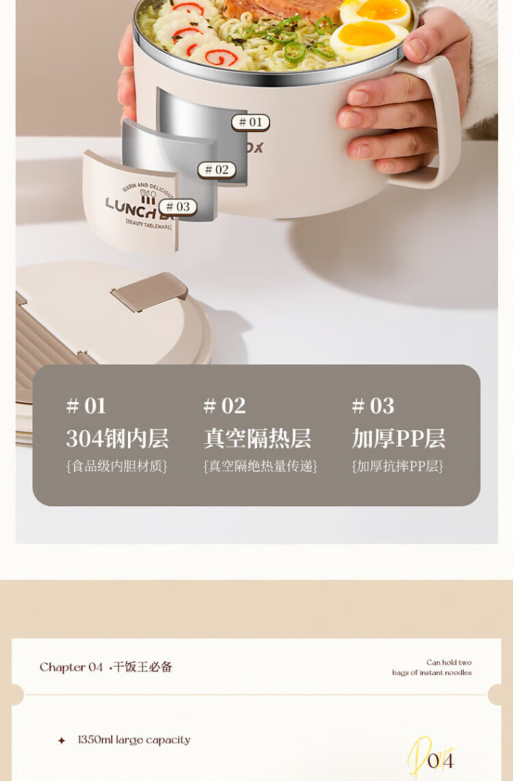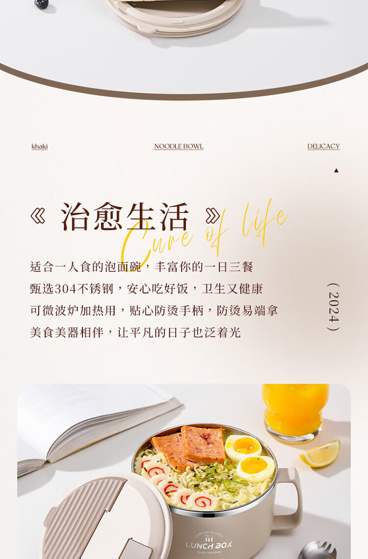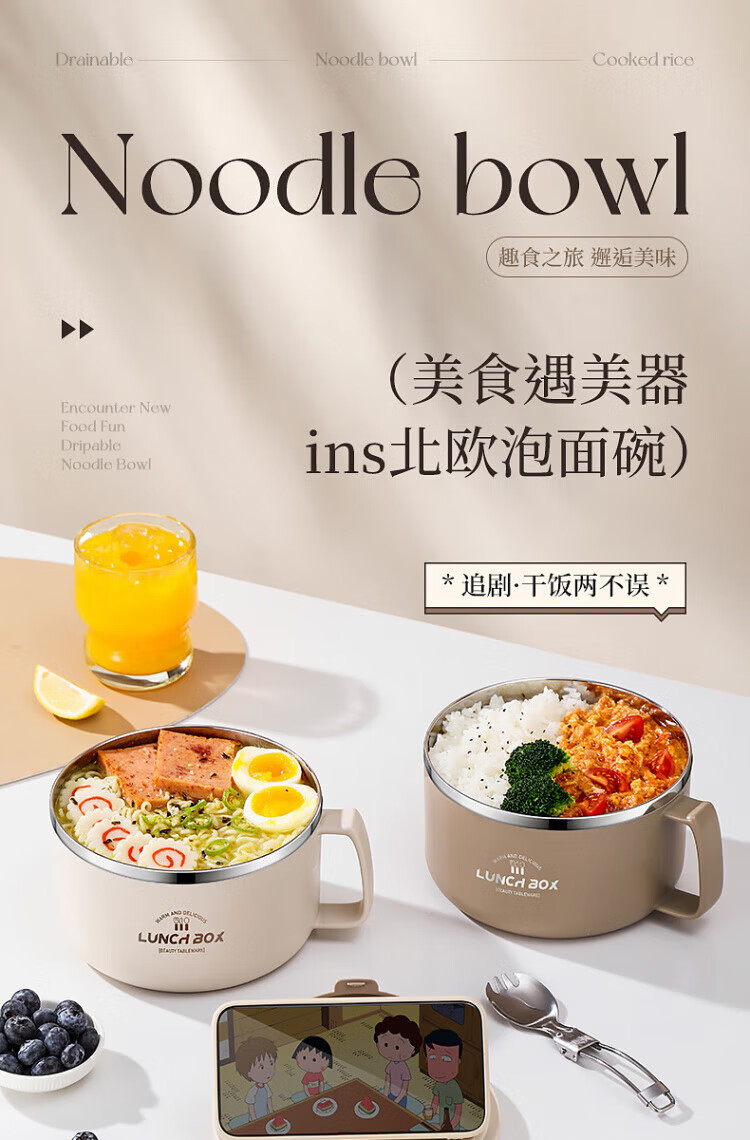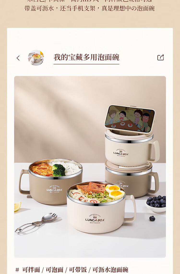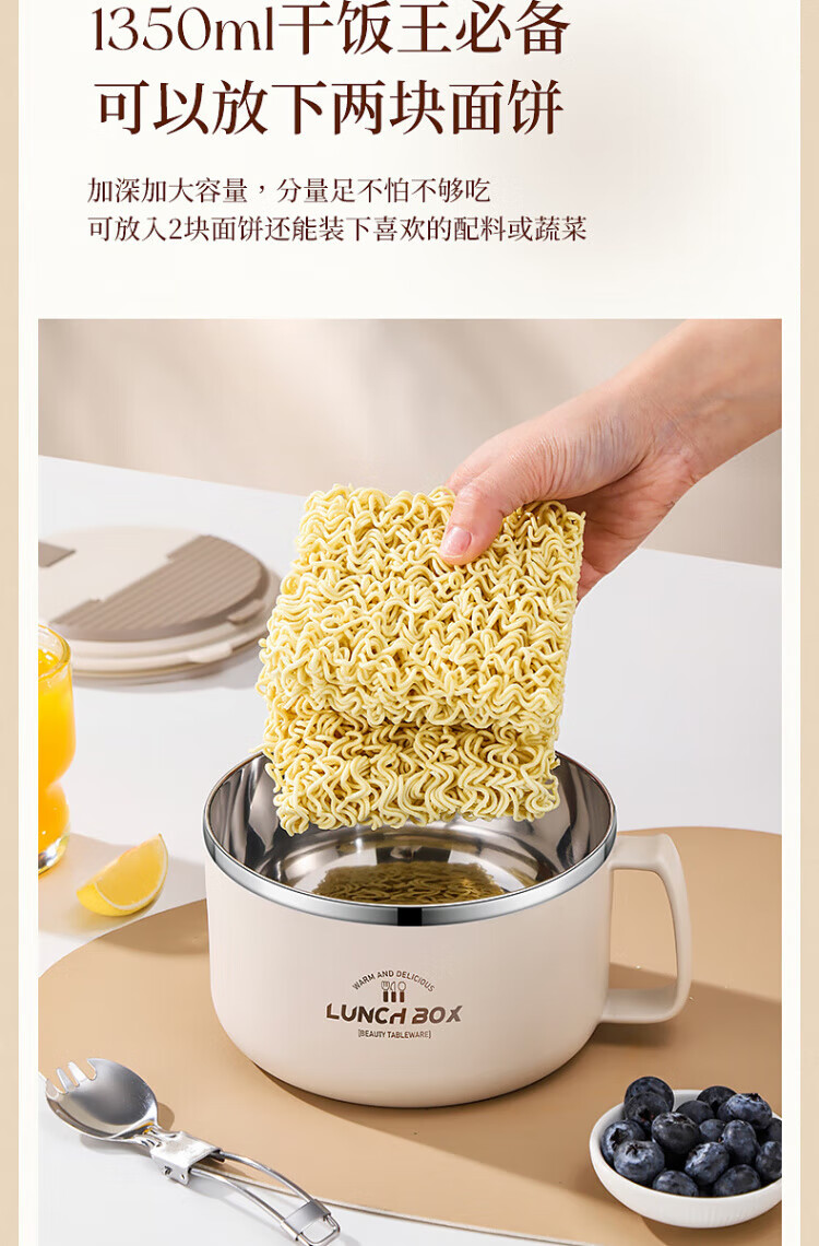 WCZ德国304不锈钢泡面碗带盖碗宿舍用学生方便碗泡面神器饭吃盒碗筷 米白色多用碗小号1050ml