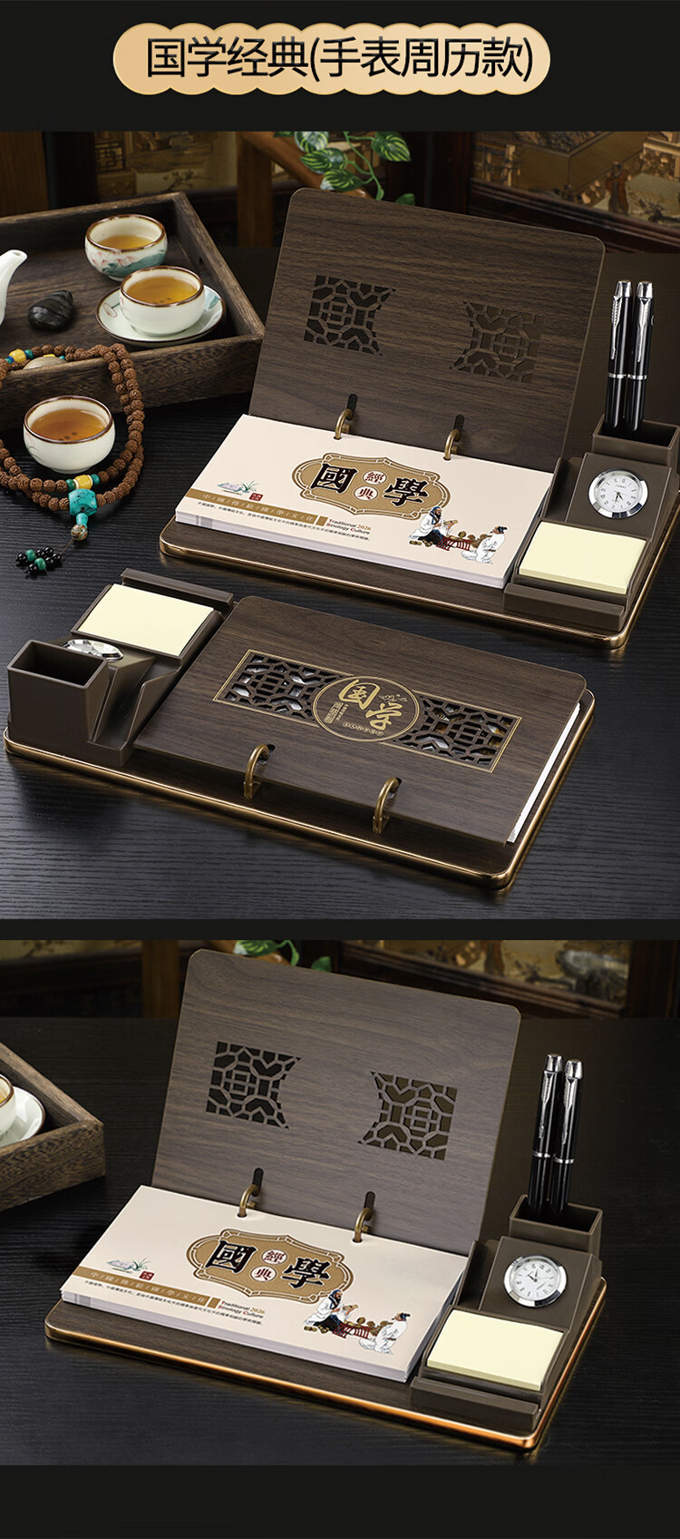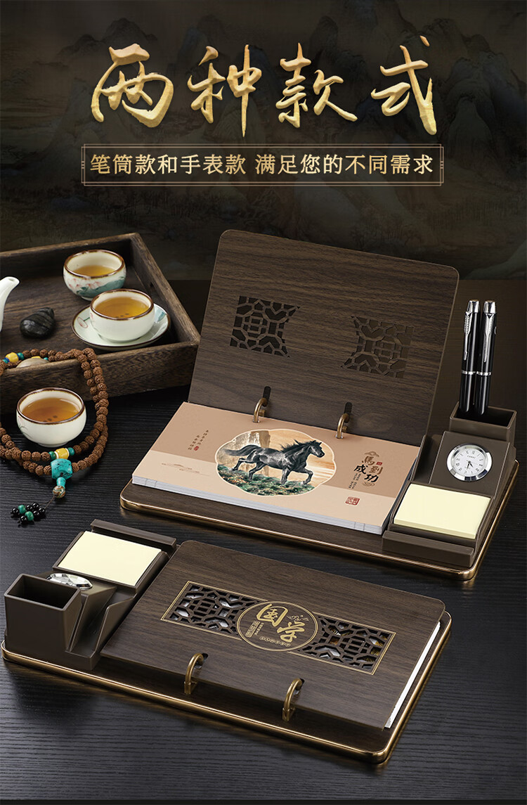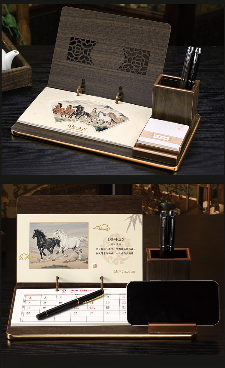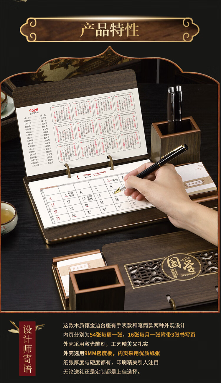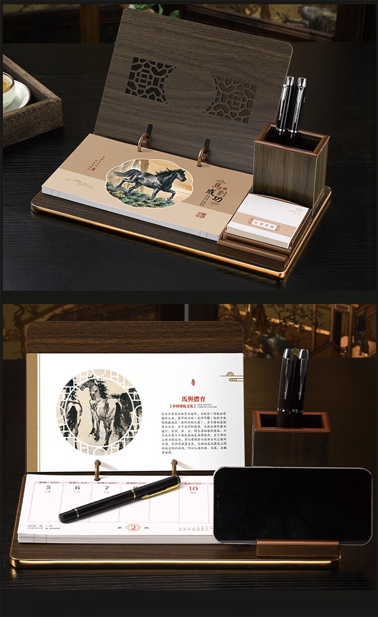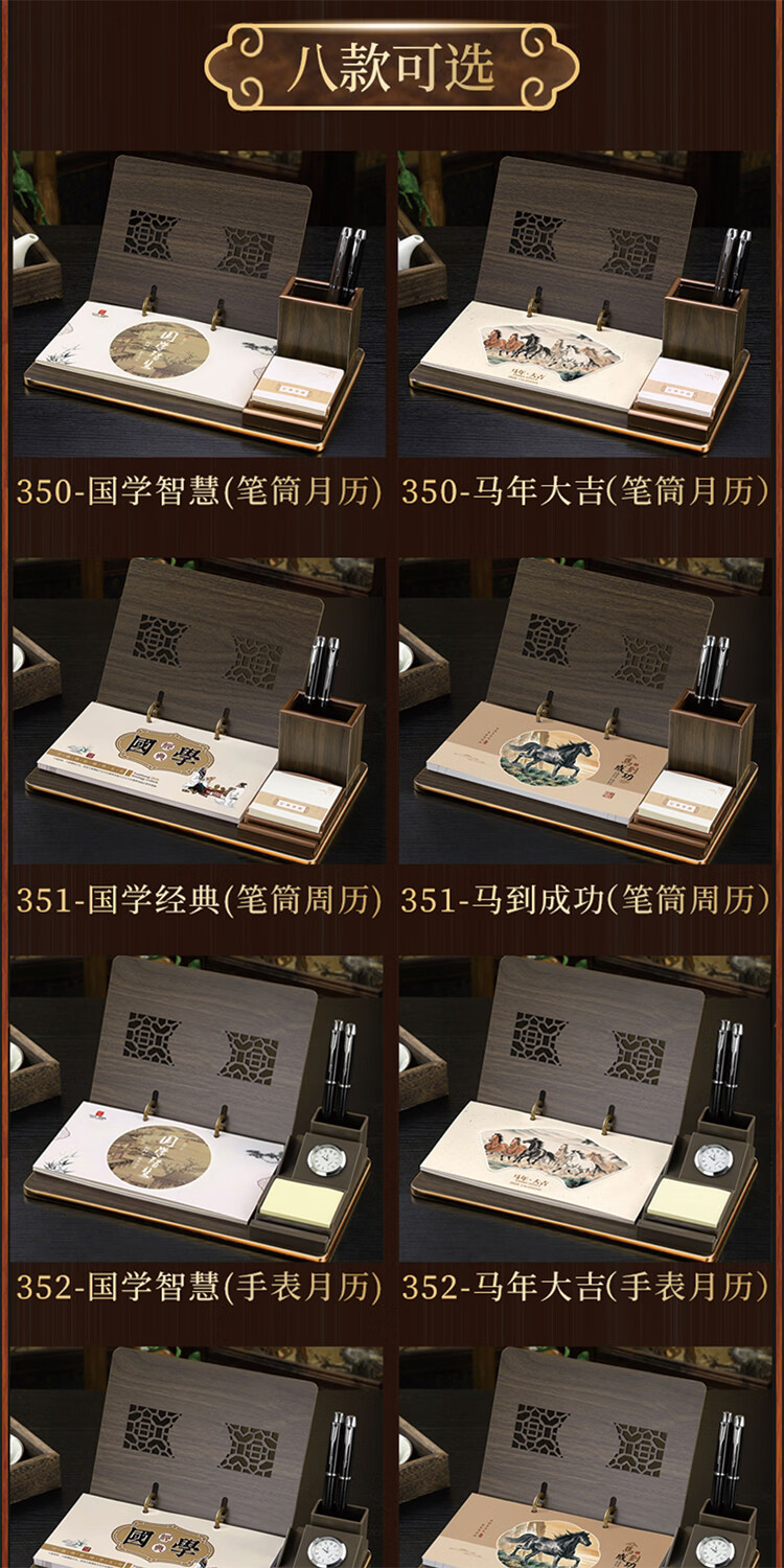 筏芯台历2026年新款手表笔筒周历办公室木质桌面记事创意时钟日历马年商务办公台座摆件企业订制logo 国学经典-手表笔筒款(54张周历款)