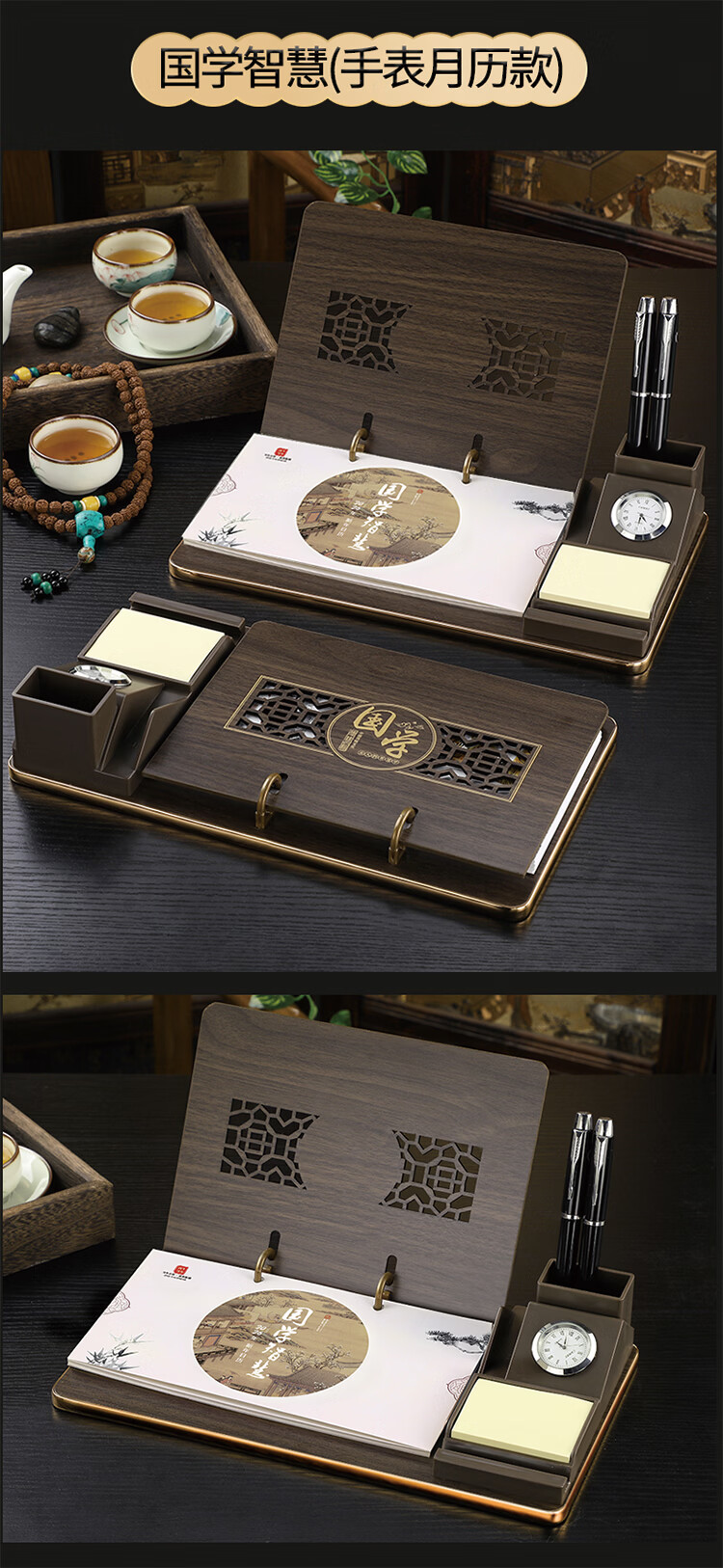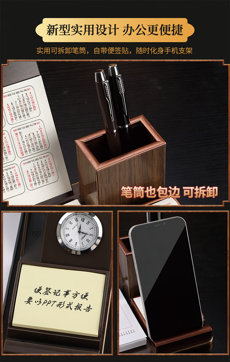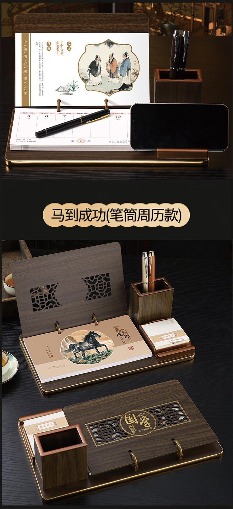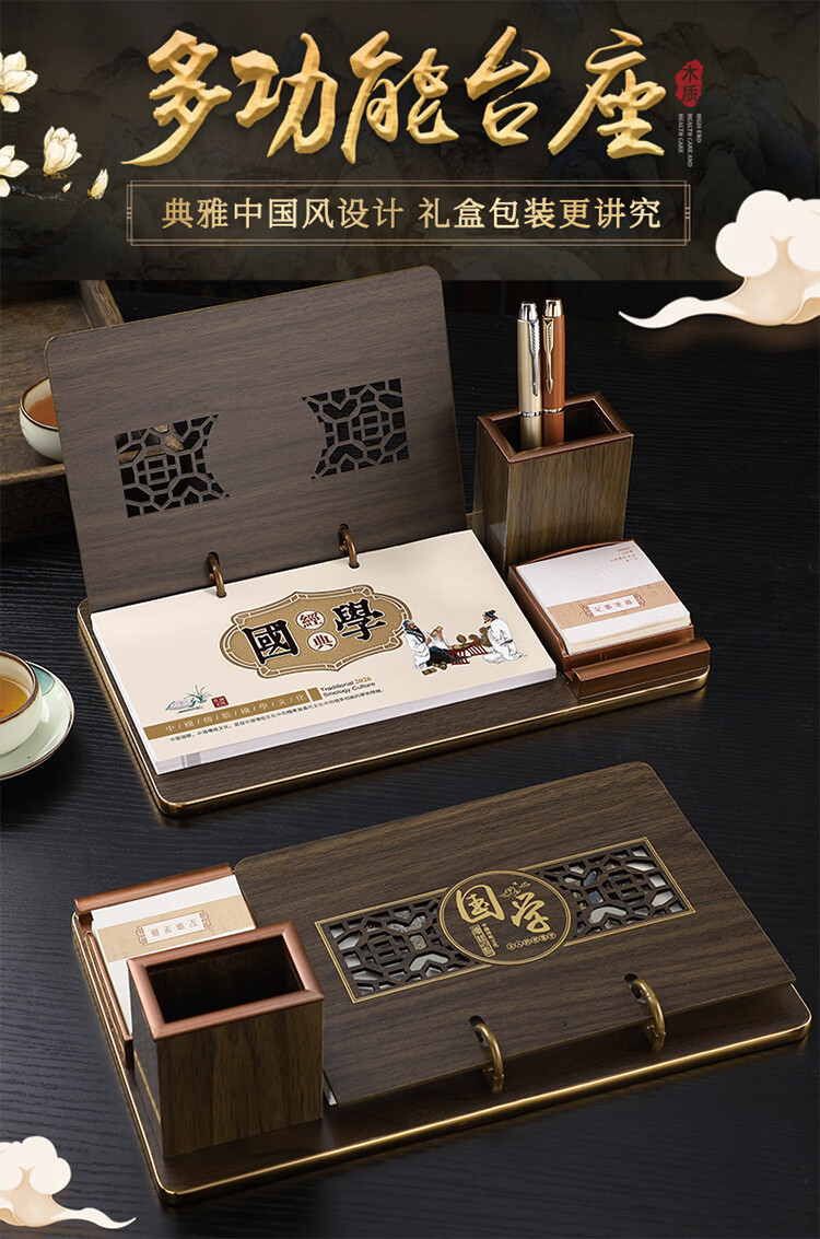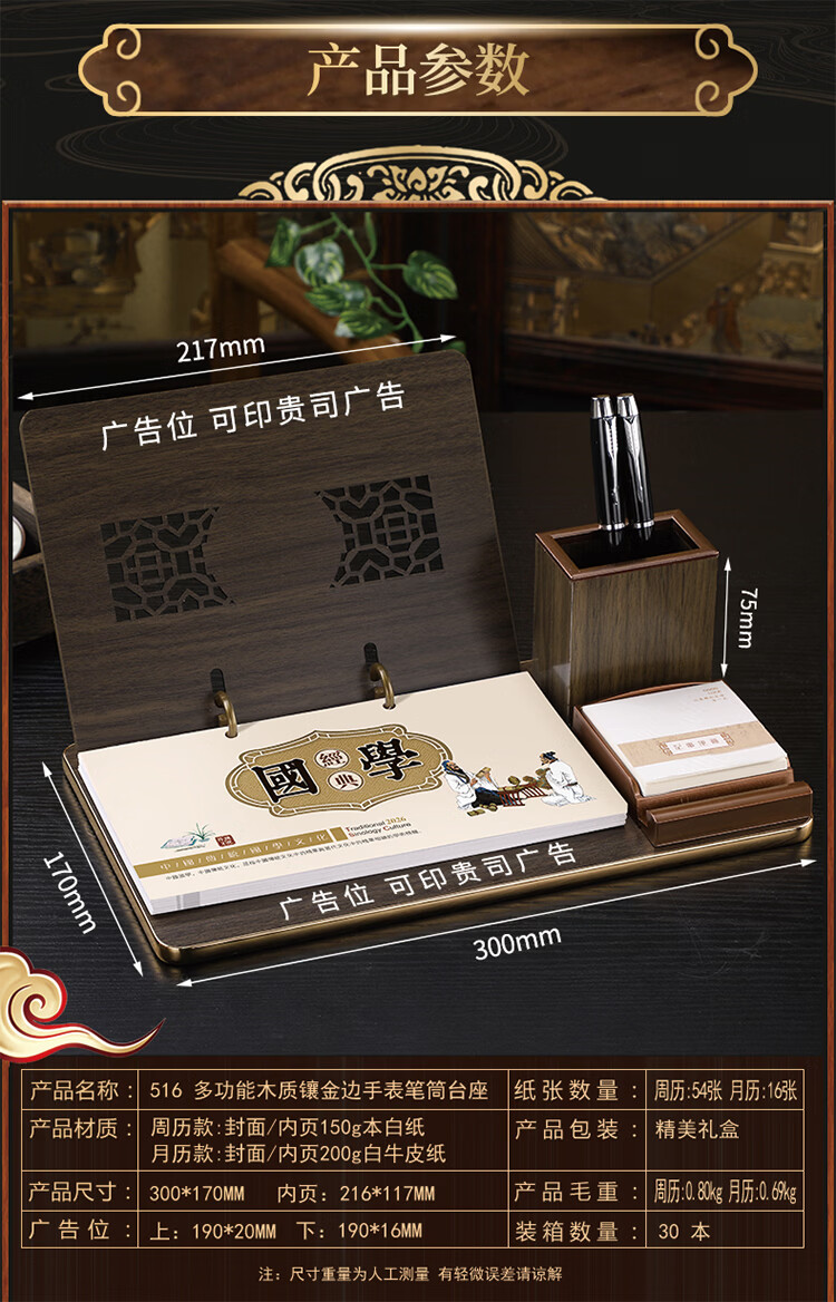 筏芯台历2026年新款手表笔筒周历办公室木质桌面记事创意时钟日历马年商务办公台座摆件企业订制logo 国学经典-手表笔筒款(54张周历款)