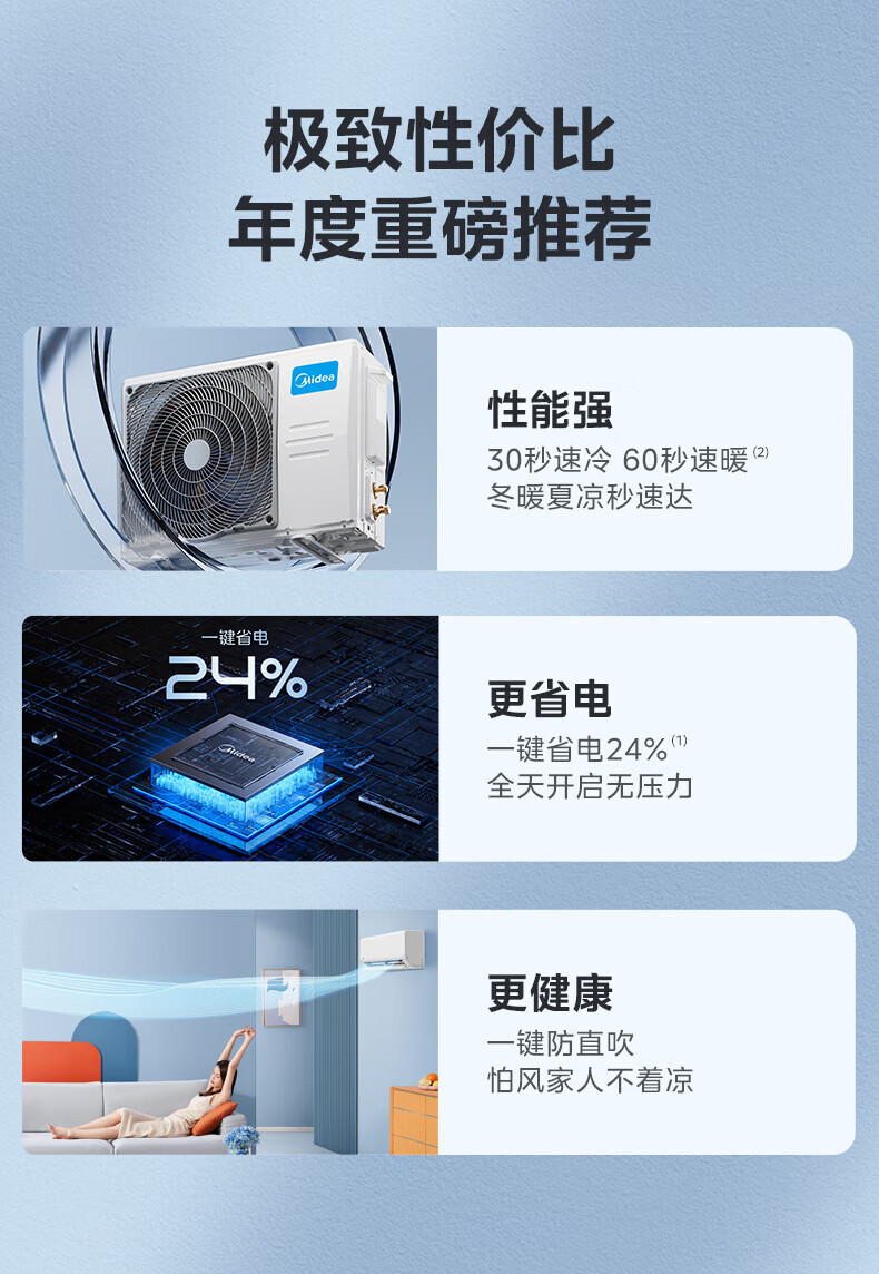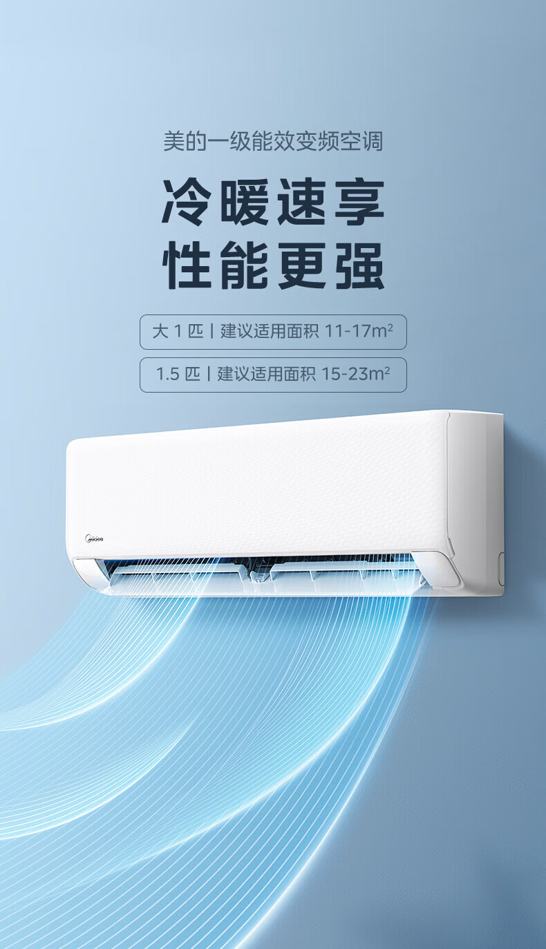 美的(Midea)制冷王空调挂机大1.5/1匹 极速冷暖 新一级能效 空调补贴20%以旧换新 壁挂式节能低噪家用卧室挂机 大1匹 一级能效制冷王