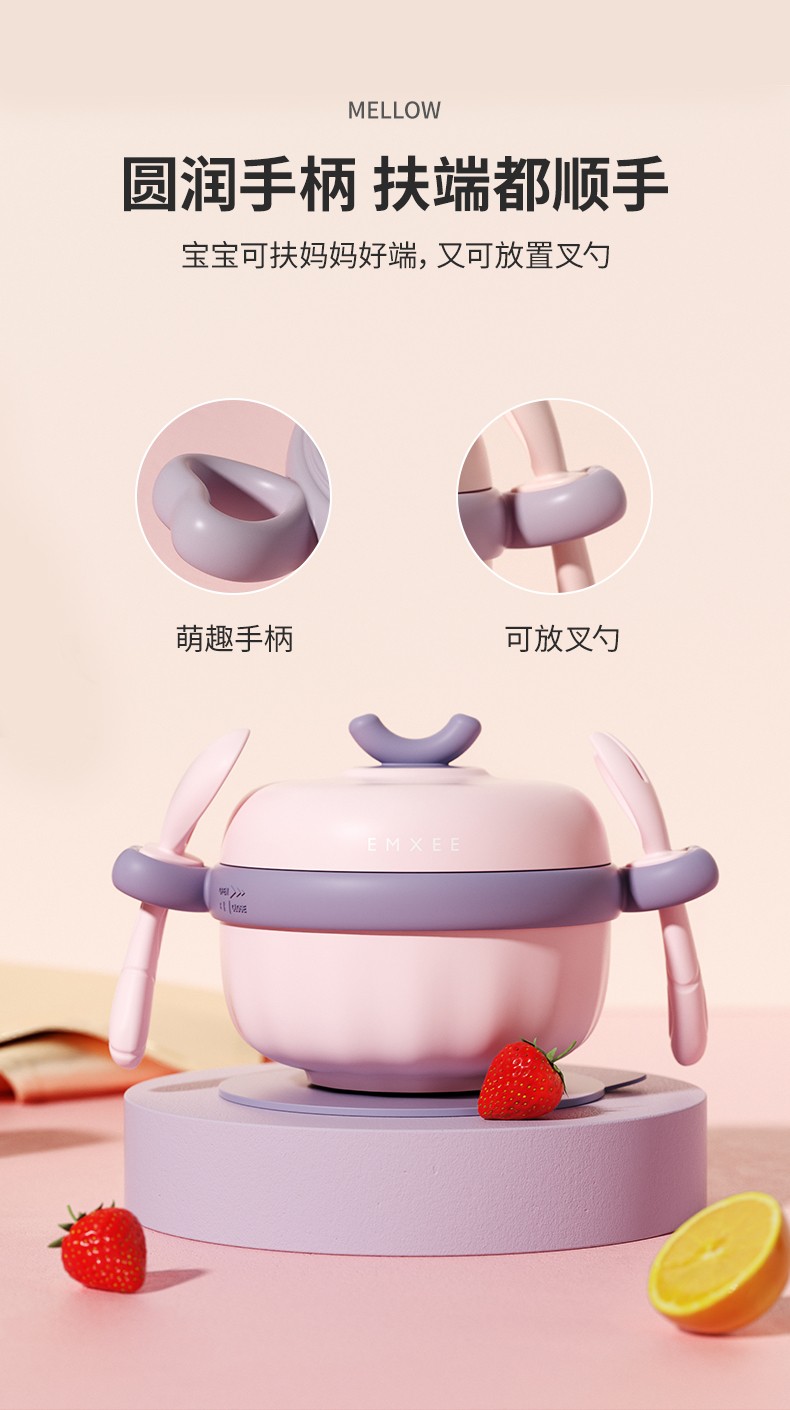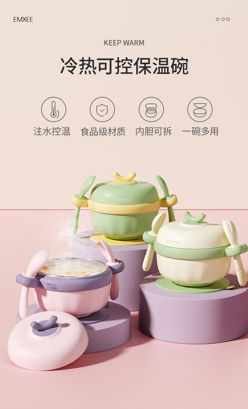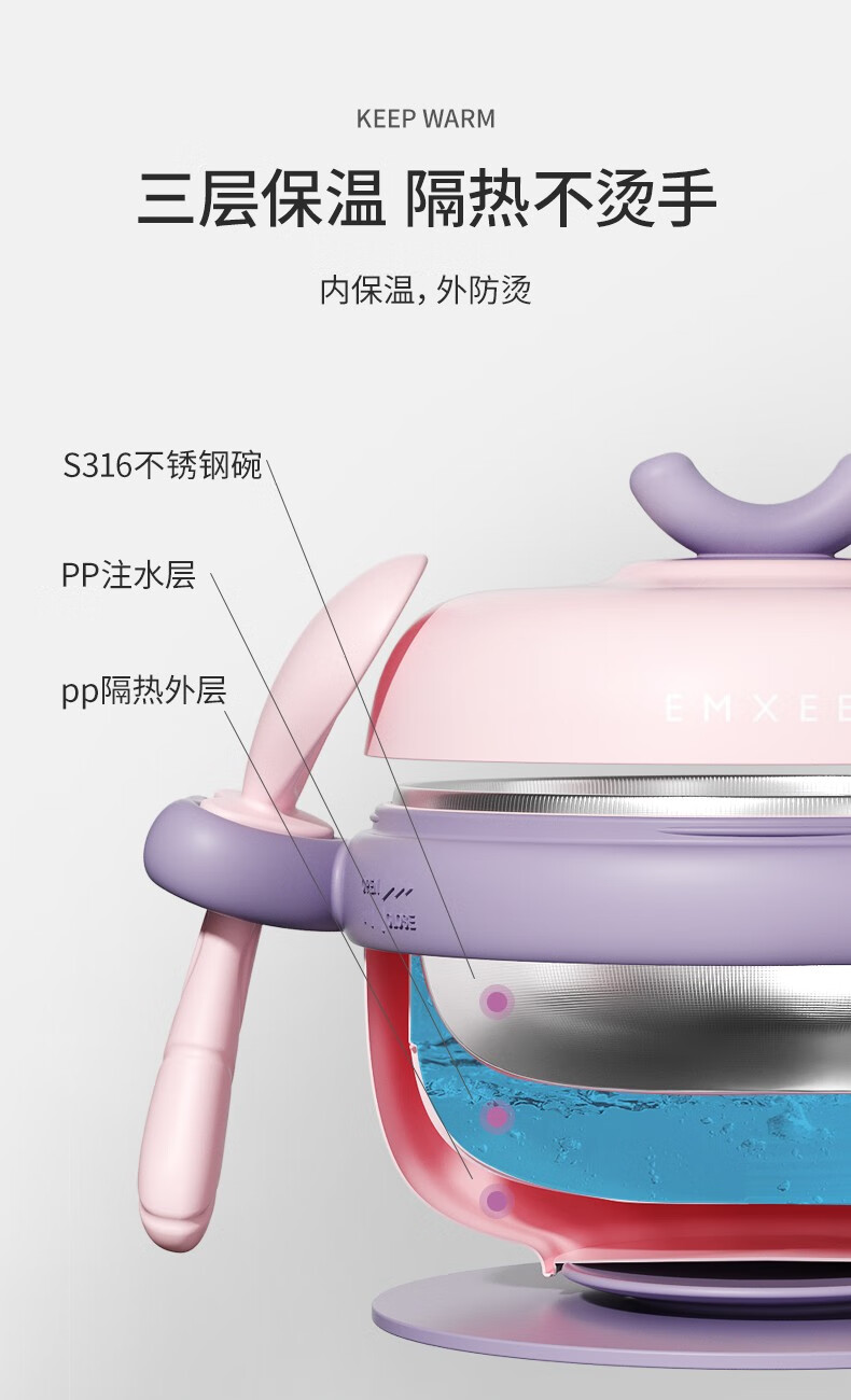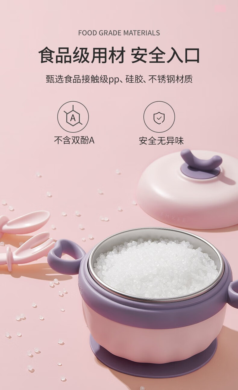 嫚熙(EMXEE)儿童餐具 婴儿注水保温碗 宝宝防摔可拆卸碗吸盘碗辅食碗勺3件套 落英缤纷