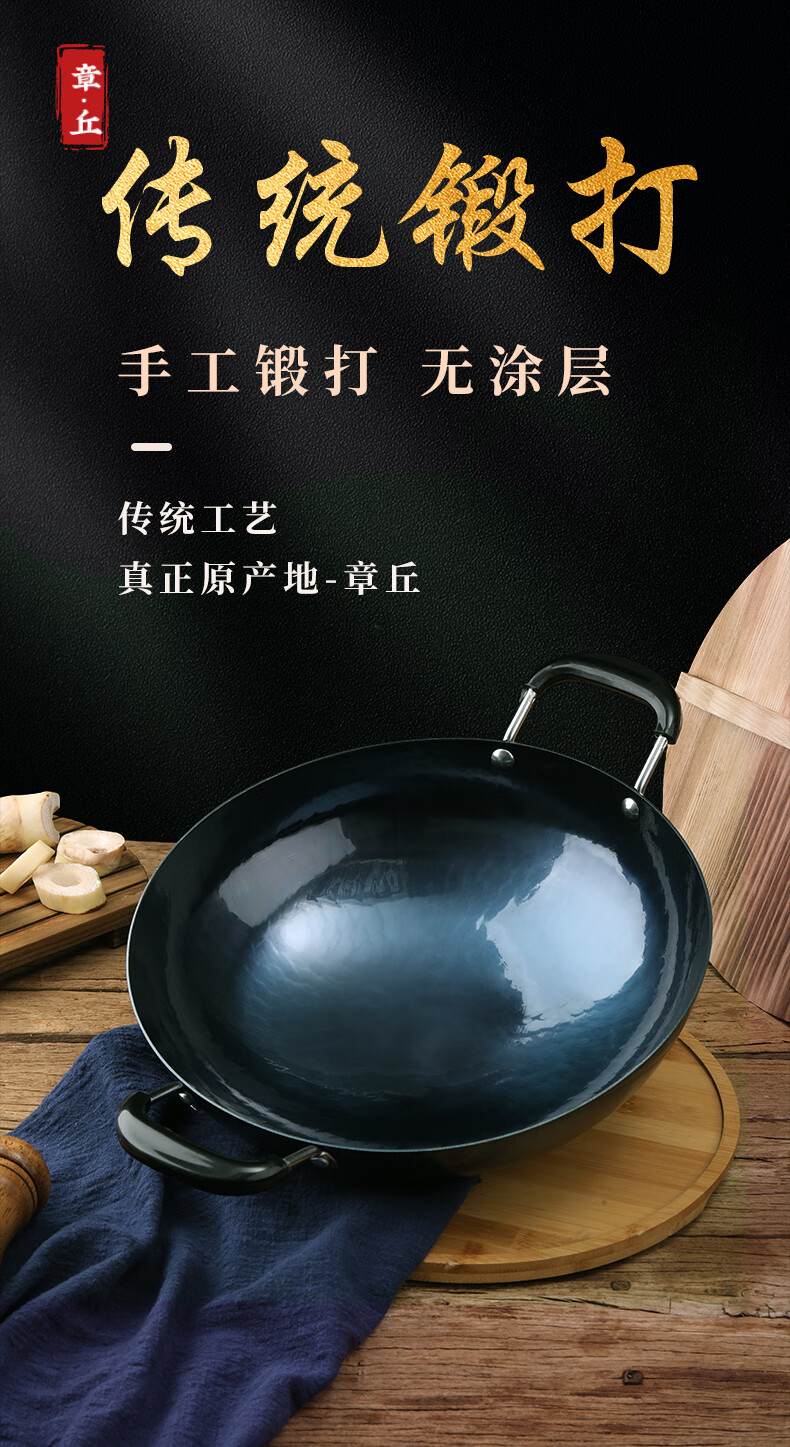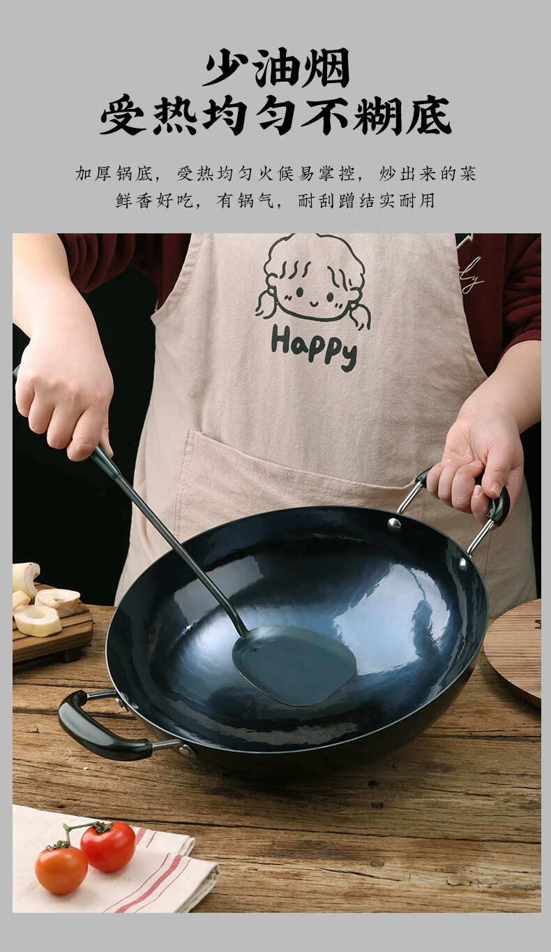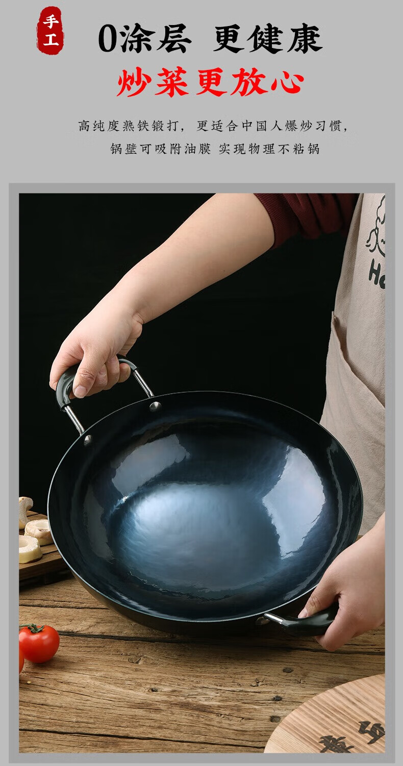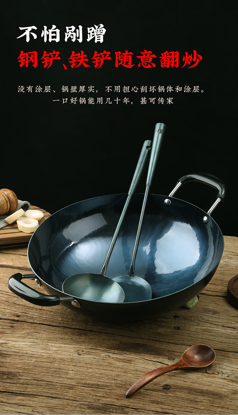 谭铁匠正宗山东章丘老式手工双耳大铁锅不易粘家用炒菜锅熟铁炒锅无涂层 双耳鱼鳞铁锅【已开锅】2-4人适用 32cm