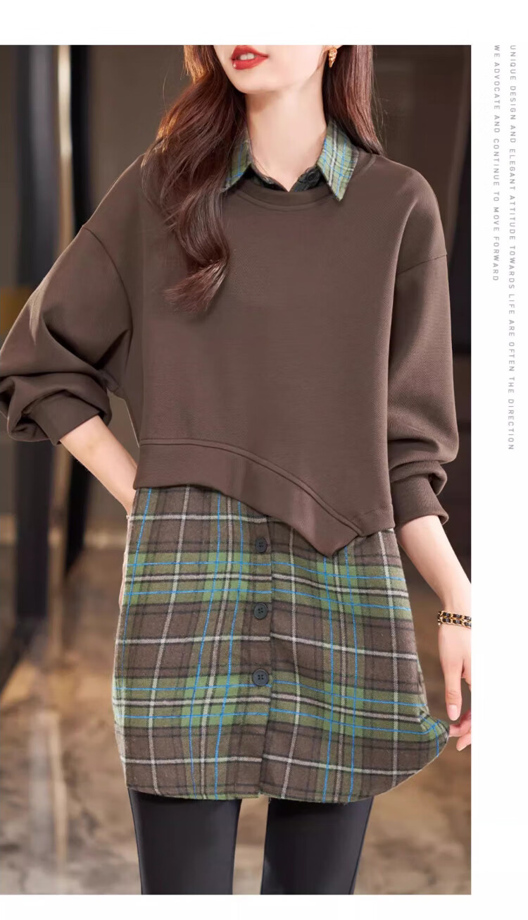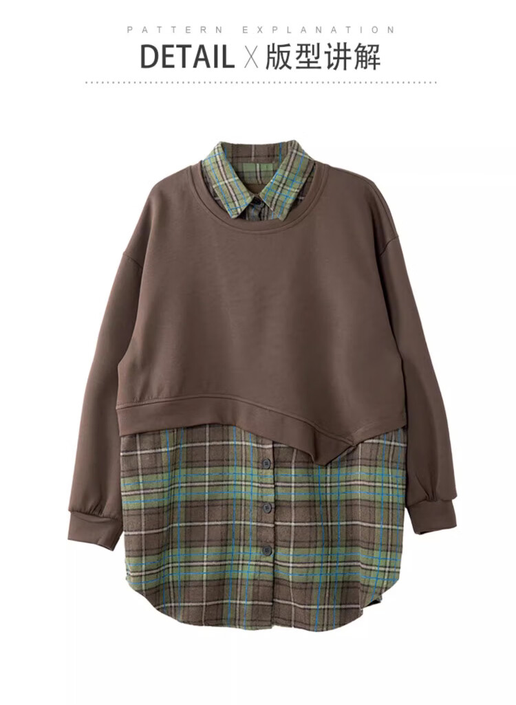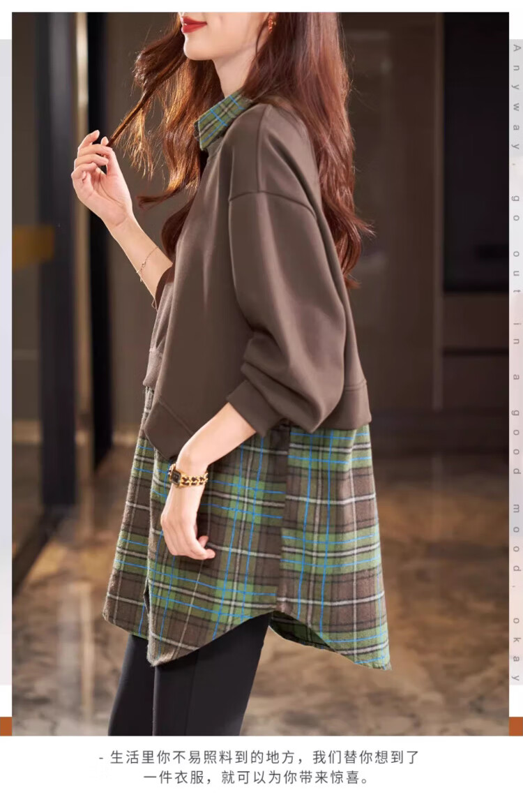 莎妮朵罗大码女装上衣胖mm春装韩版中长款遮肚宽松假两件棉卫衣女T恤19888 咖色 2XL 建议120-140斤穿着
