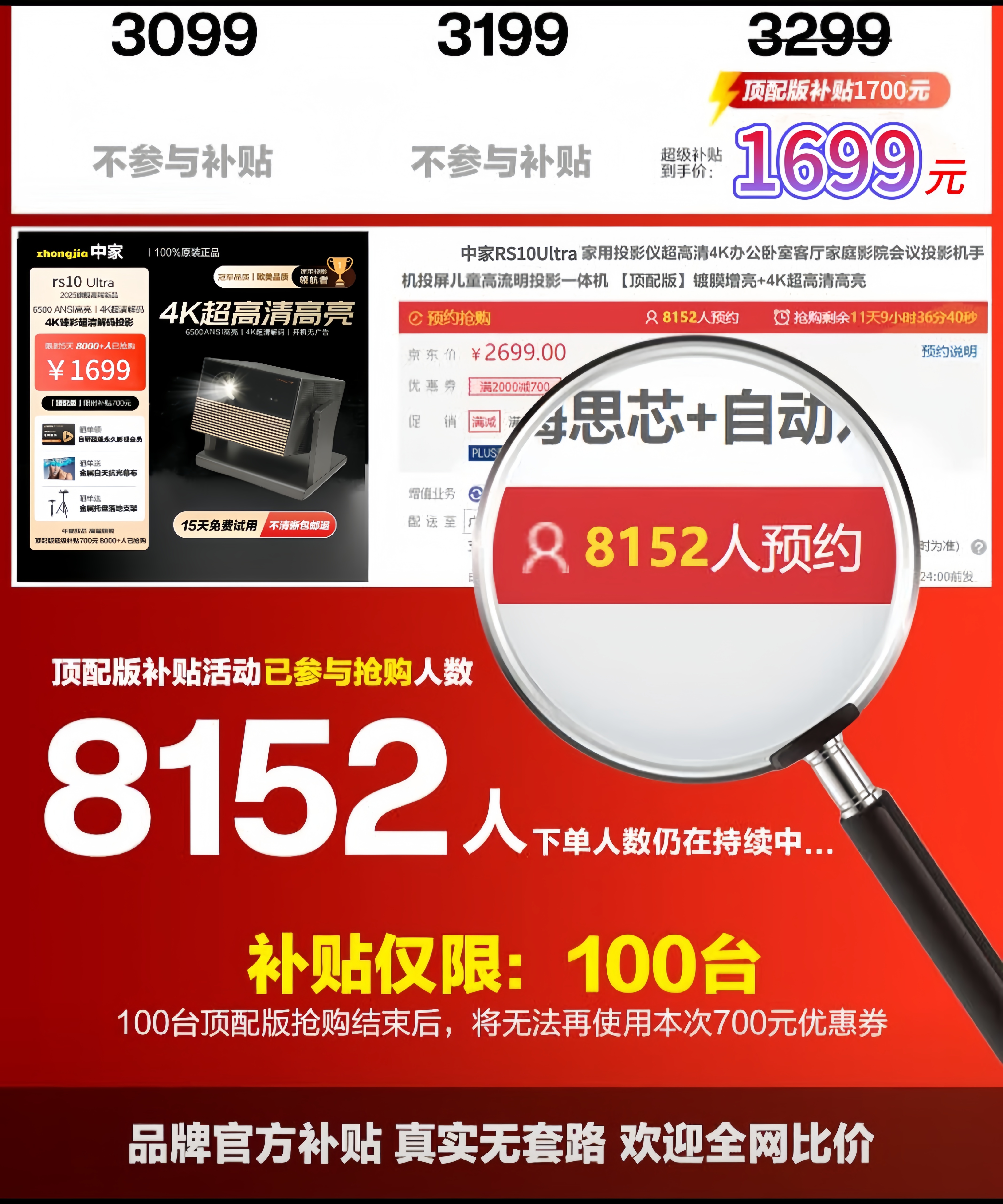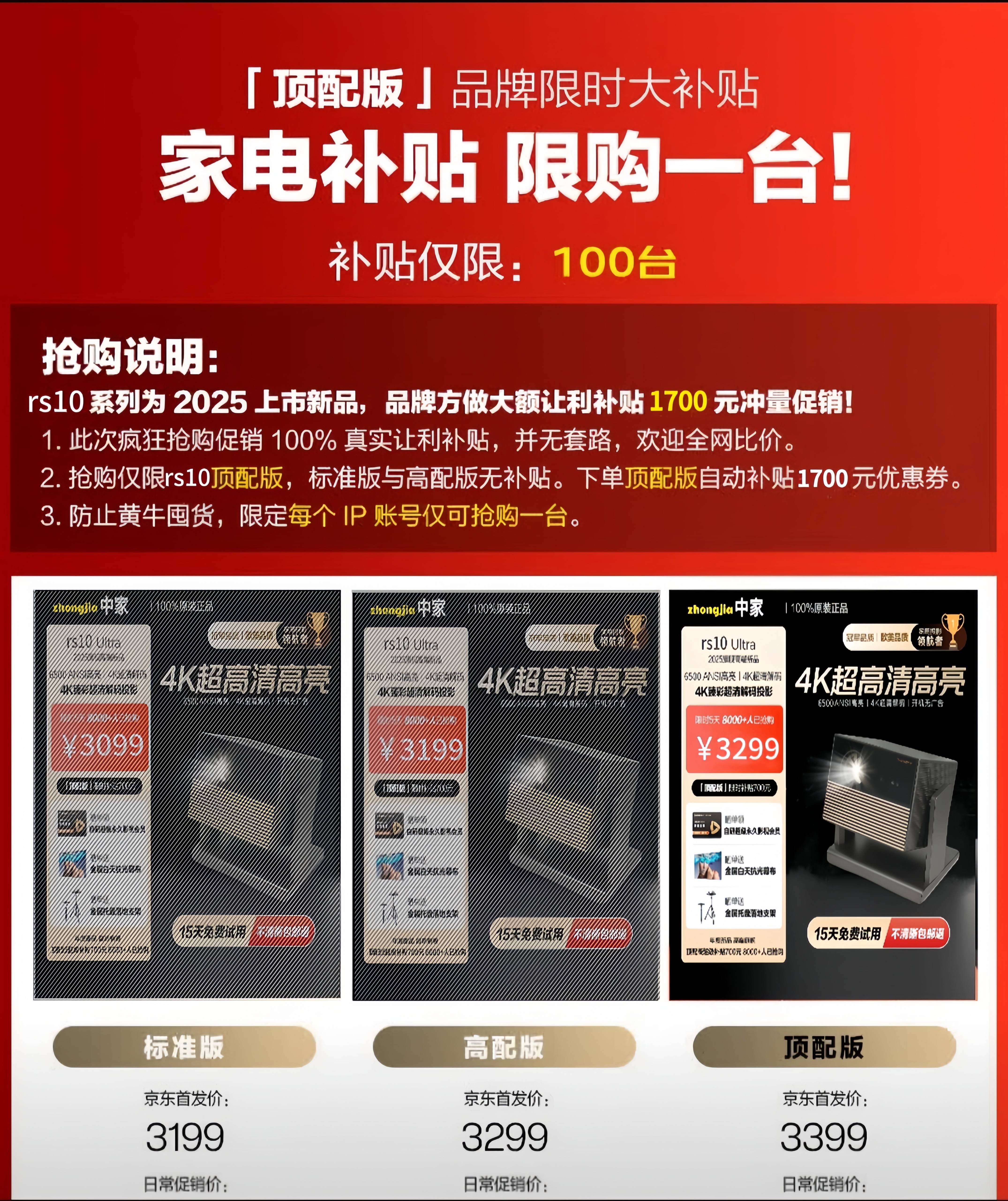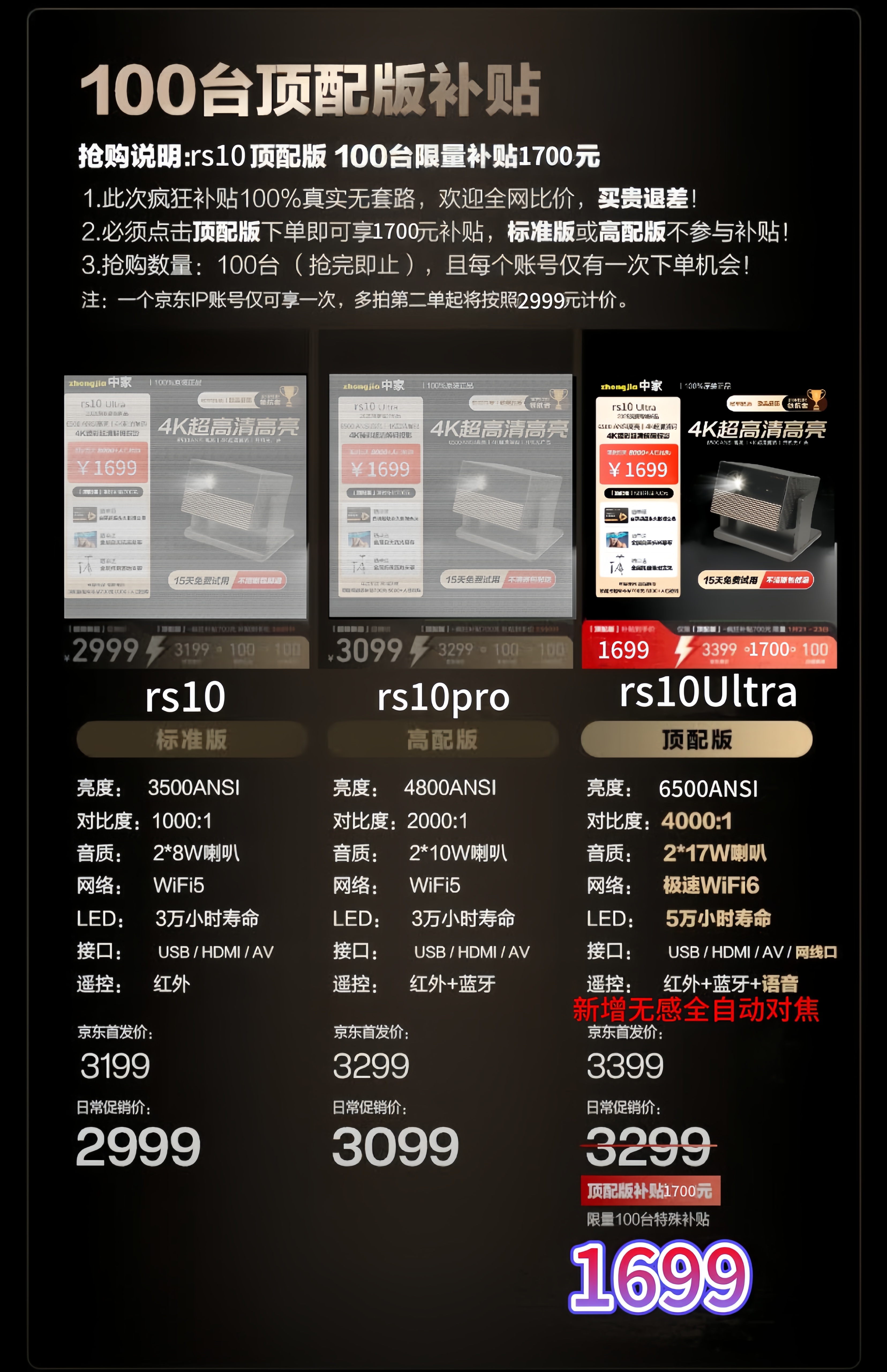 中家2025新款4K超高清投影仪家用办公智能卧室客厅家庭影院会议手机无线激光电视无感自动对焦蓝牙Wifi Rs10ultra