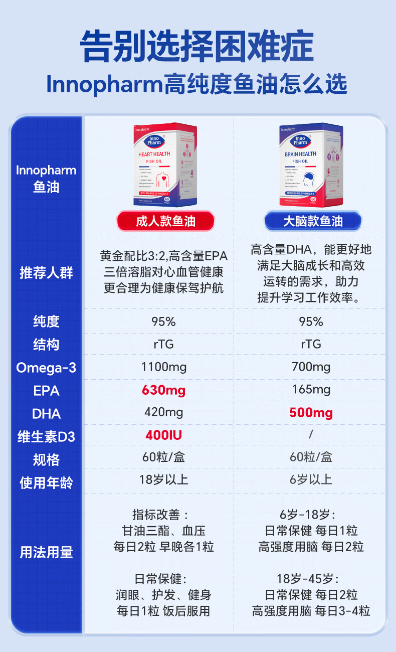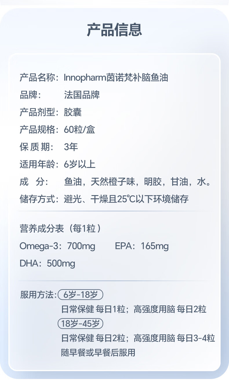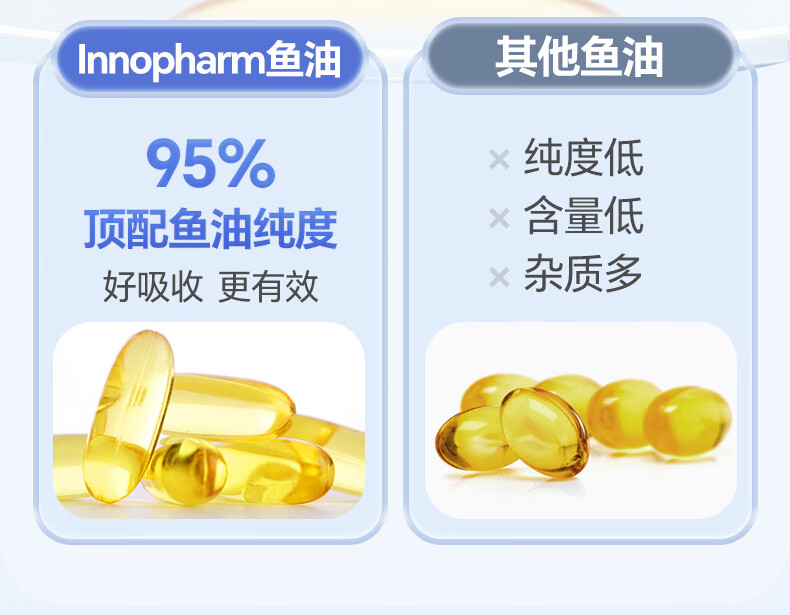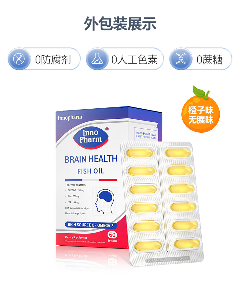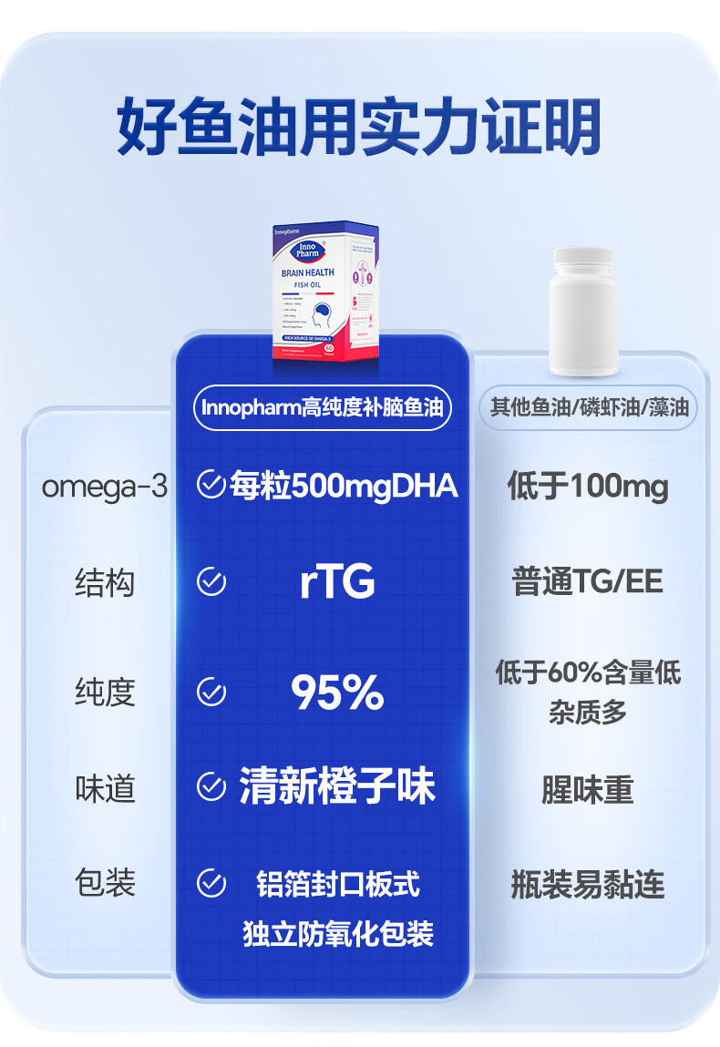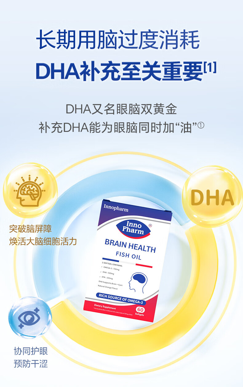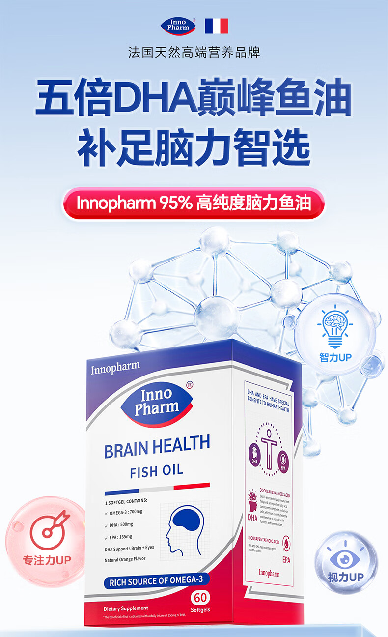 Innopharm茵诺梵95%高纯度深海鱼油软胶囊omega3青少年学生补脑dha小蓝盒 rTG结构 大脑高浓度鱼油软胶囊 60粒