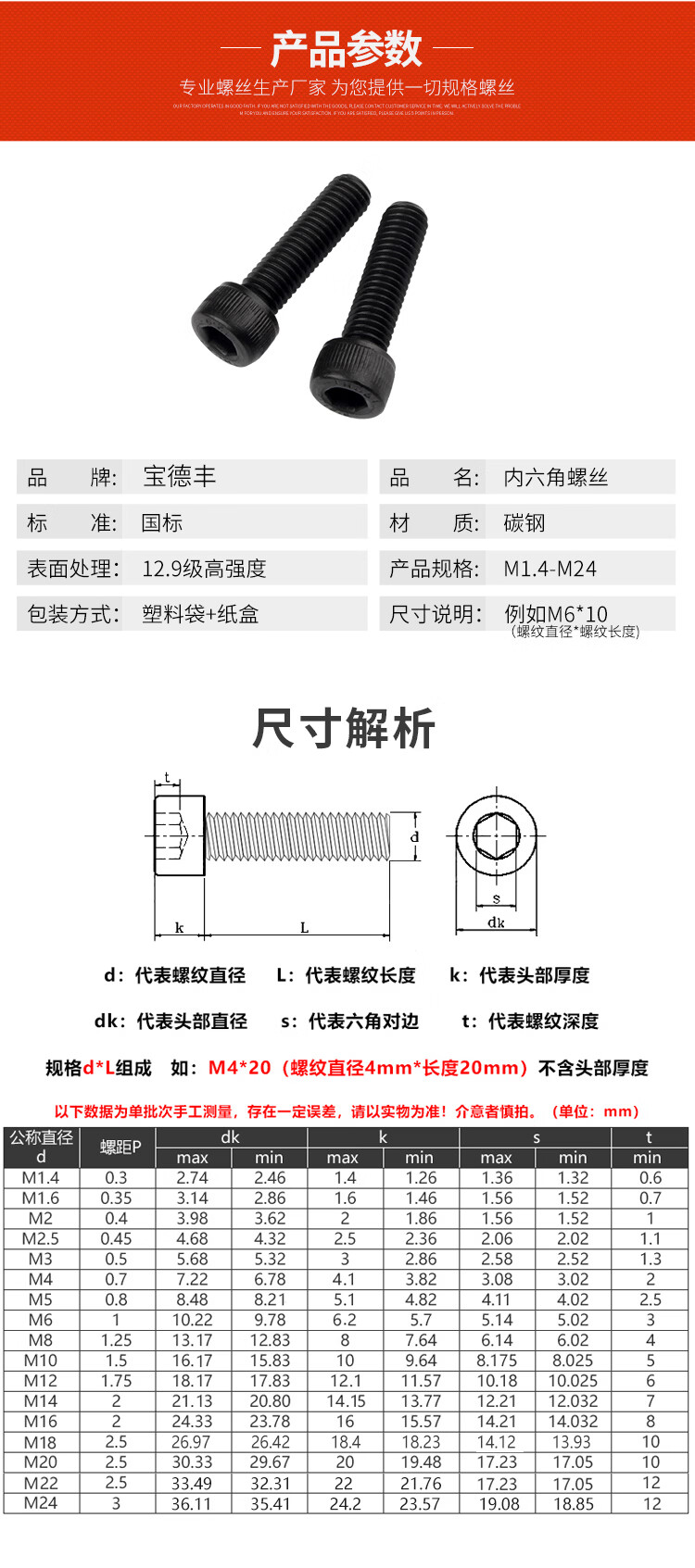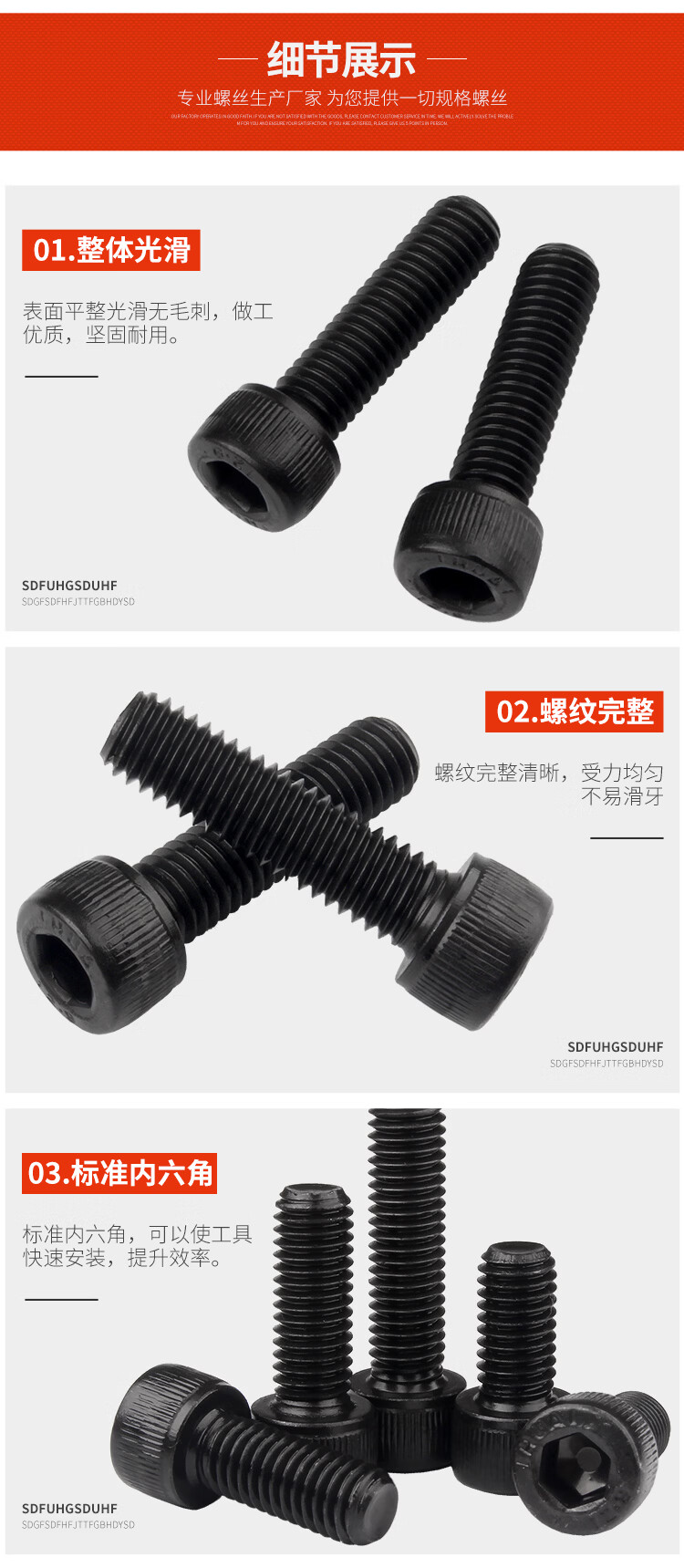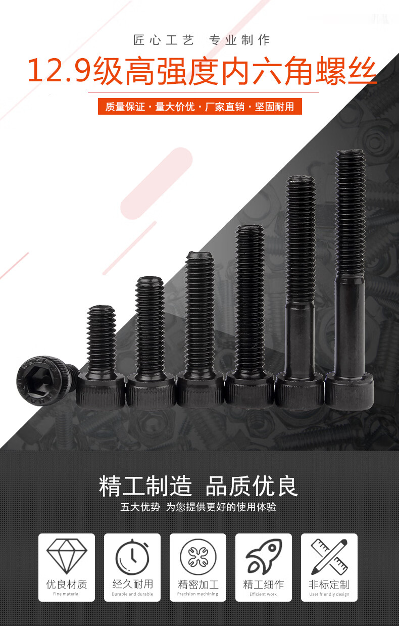 宝德丰黑色12.9级内六角螺丝钉高强度圆柱头螺栓加长杯头螺钉紧固件大全 M1.4x4[100只]