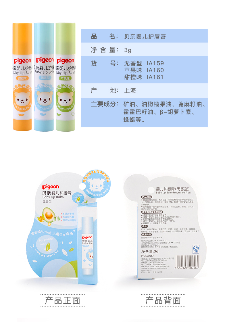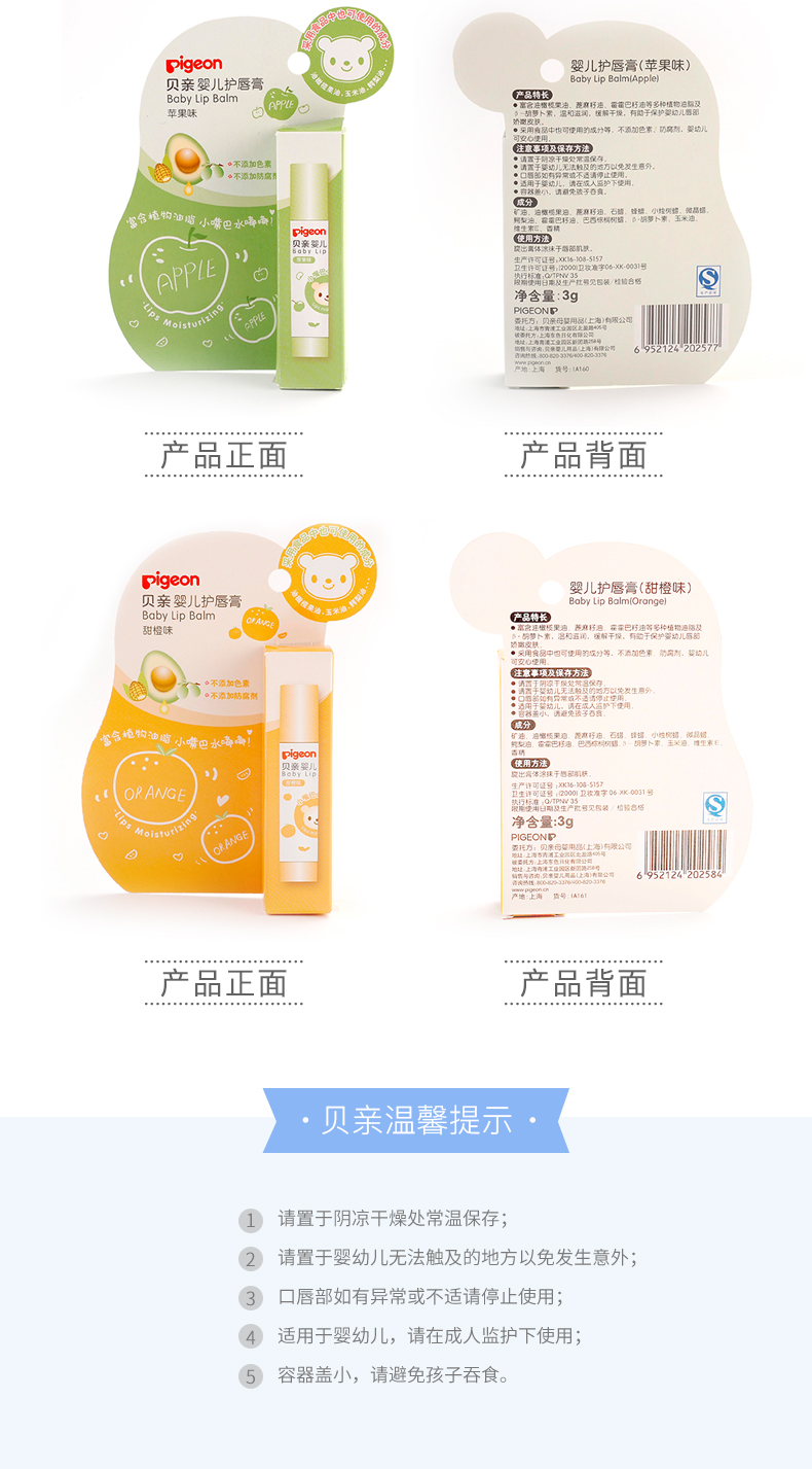 贝亲(Pigeon)婴儿护唇膏 儿童唇膏 宝宝儿童润唇膏 甜橙味 3g IA161