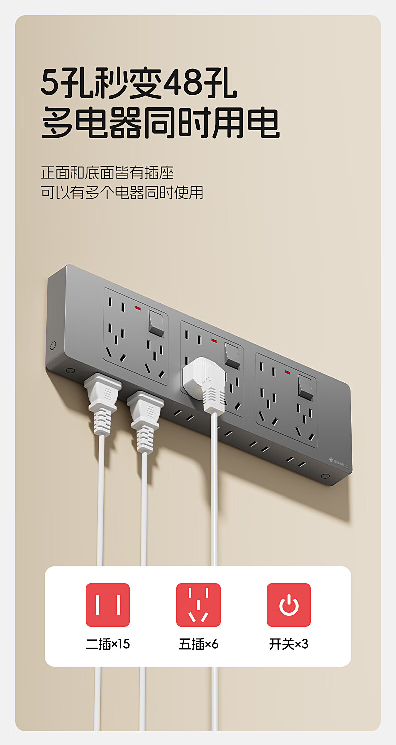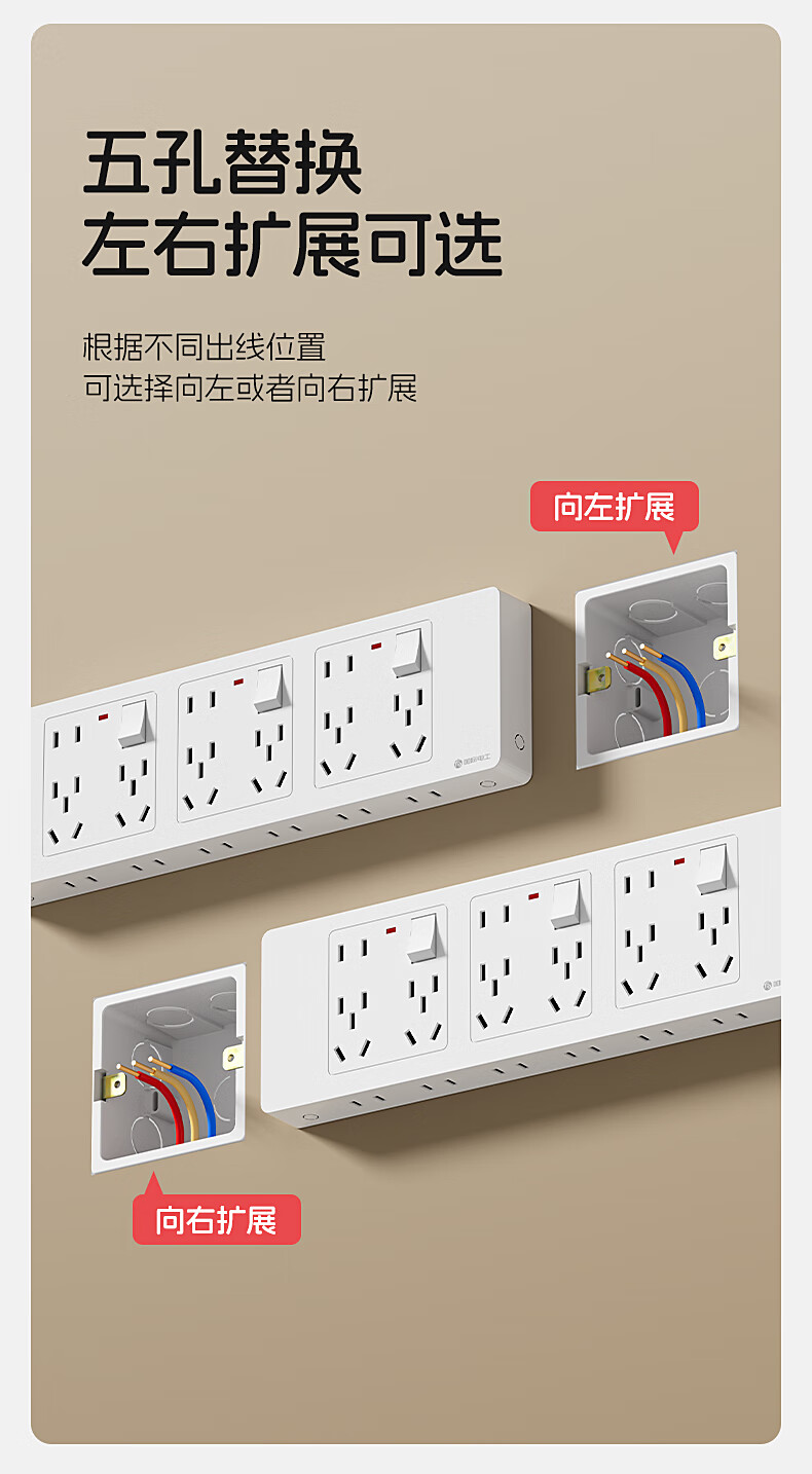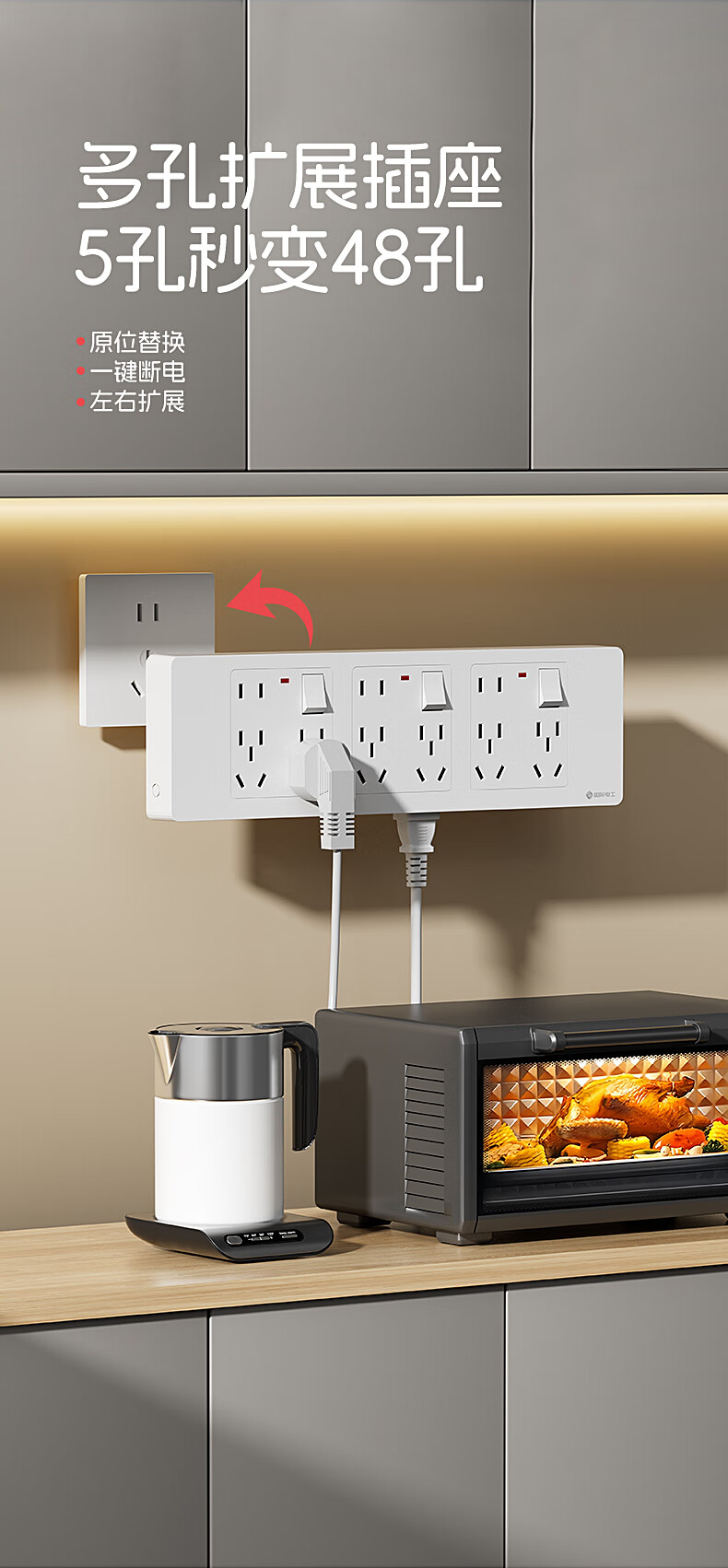 国际电工86型拓展扩展插座家用厨房多功能原位替换无线转换器带开关插排 白色三开48孔-左右扩展【带指示灯】