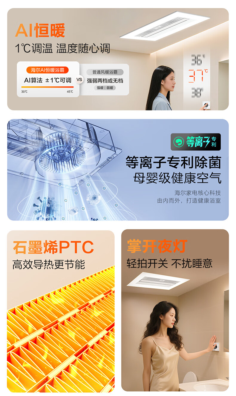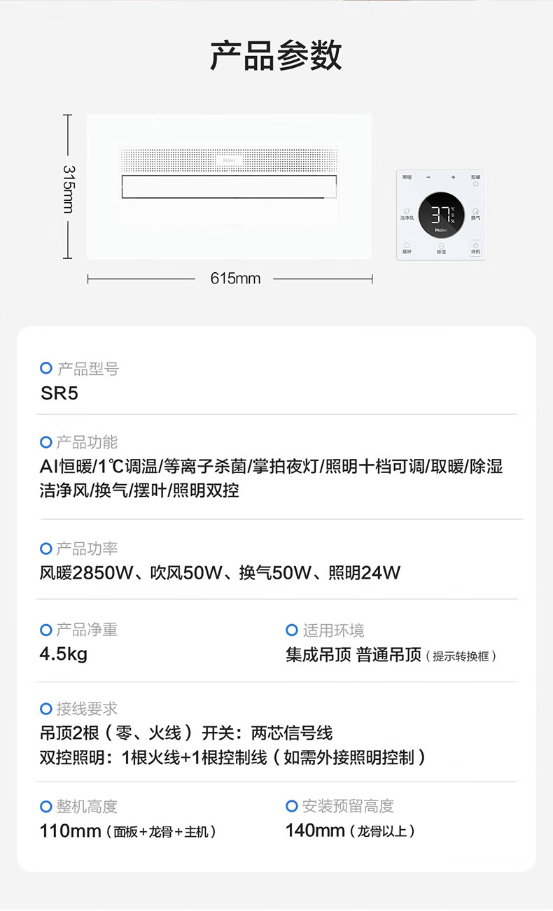 海尔AI恒温除菌风暖浴霸双电机照明吹风一体无极调光 SR5
