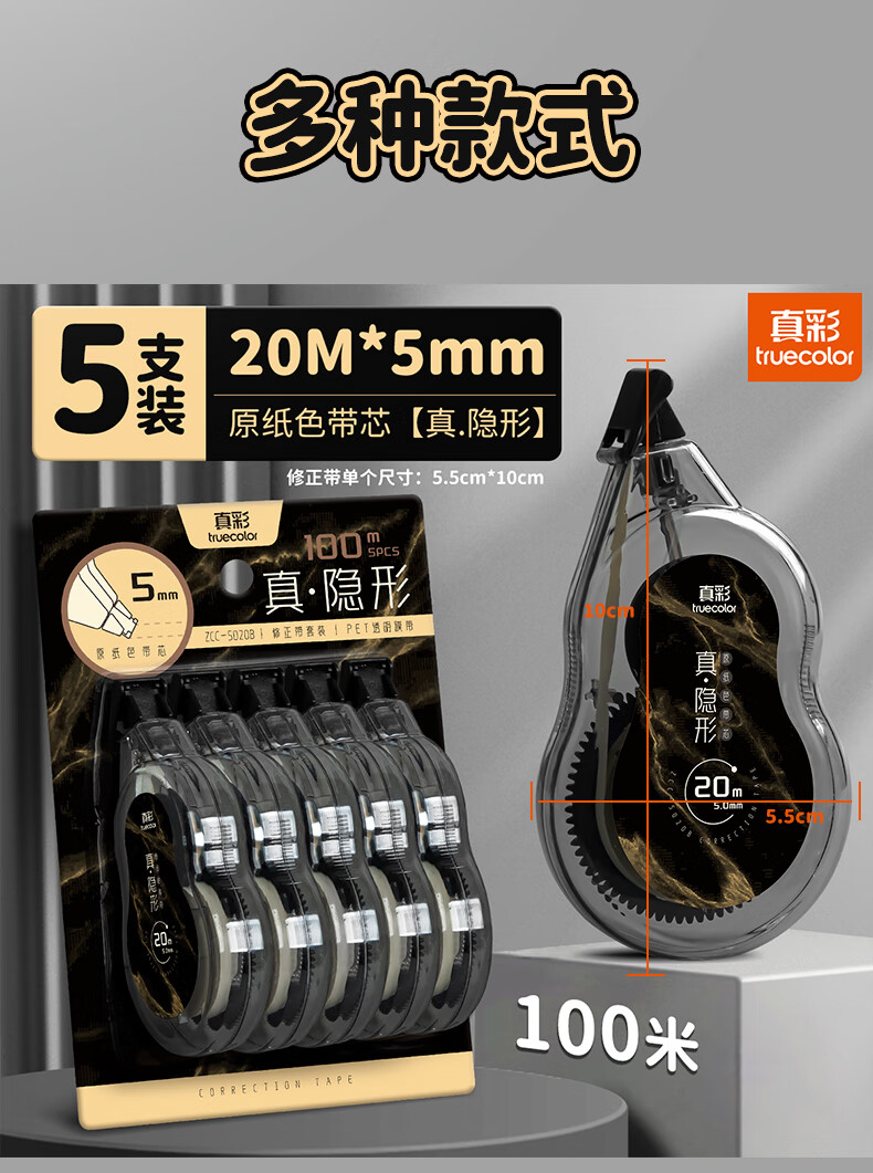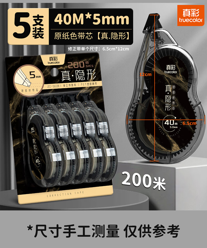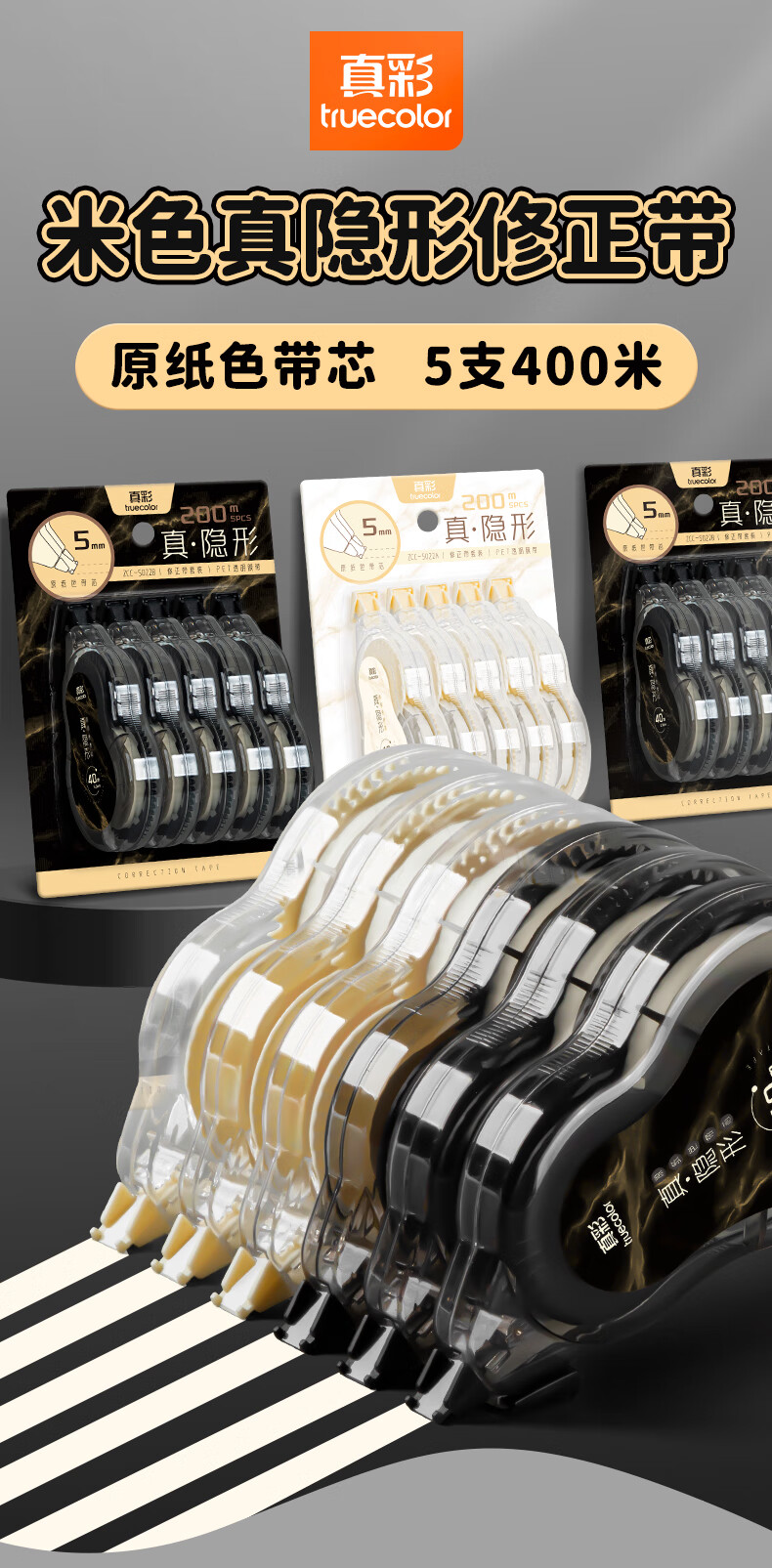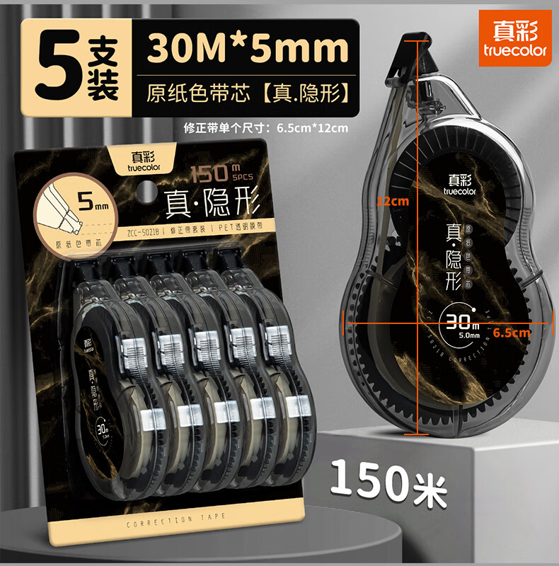 真彩(TRUECOLOR)黑色隐形修正带小学生专用涂改带初中生专用改正带大容量简约原纸色修改带学生开学文具5支装5021B