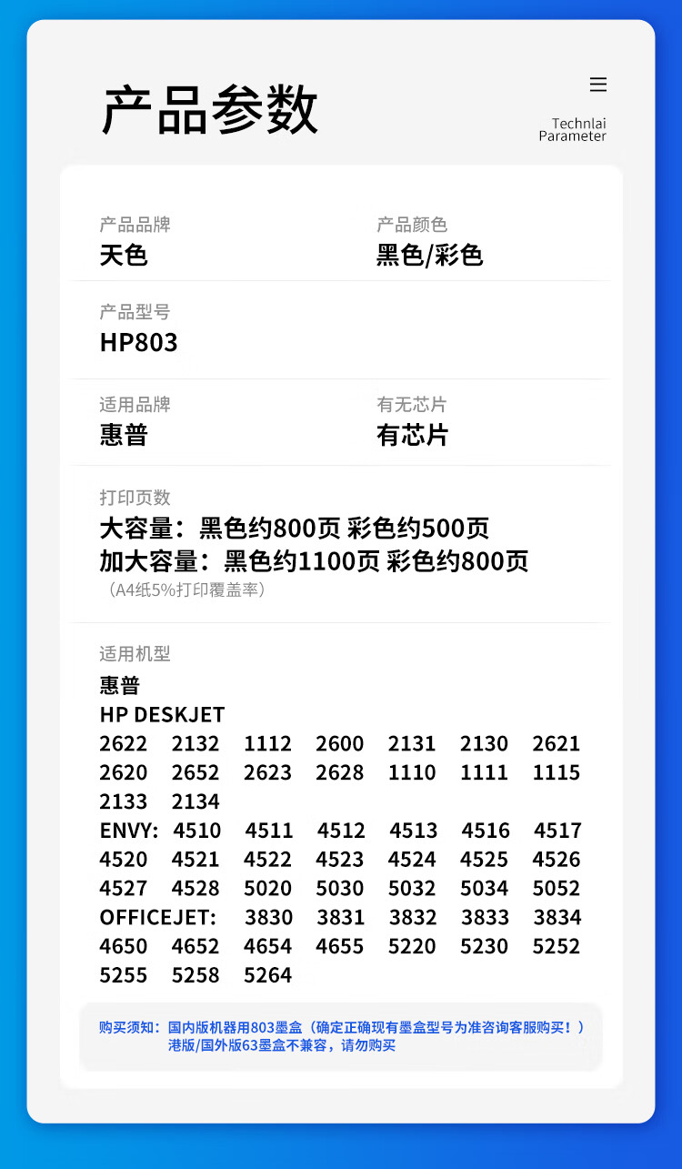 天色适用惠普803墨盒HP Deskjet 2622 2131 2132 2130 1111 1112 2621 2632 2628打印机803XL彩色