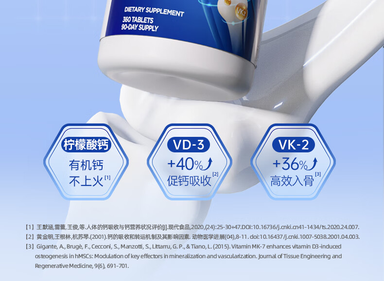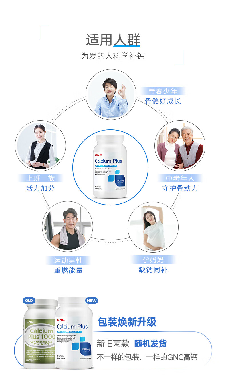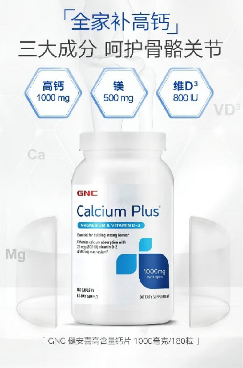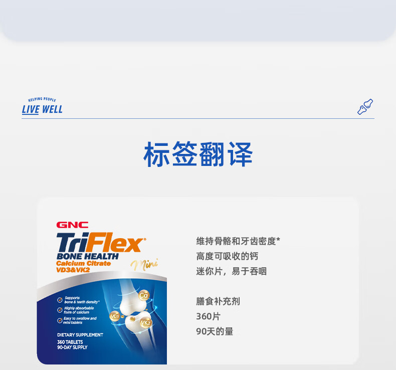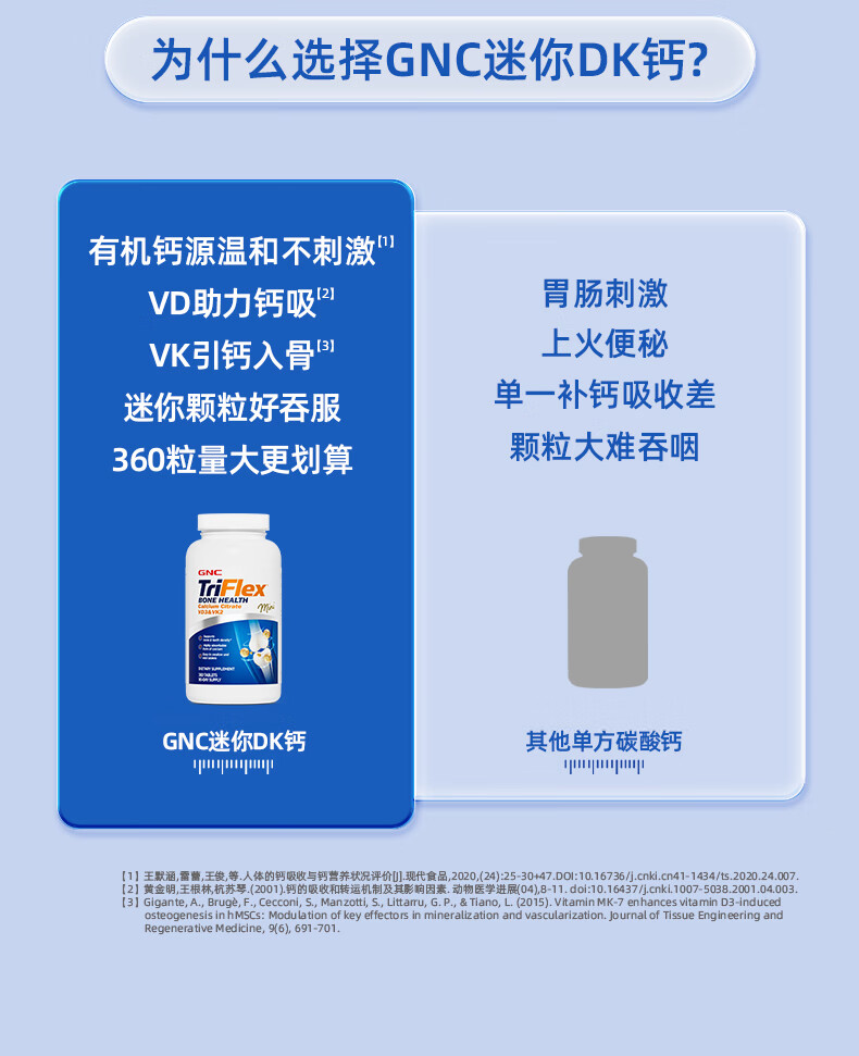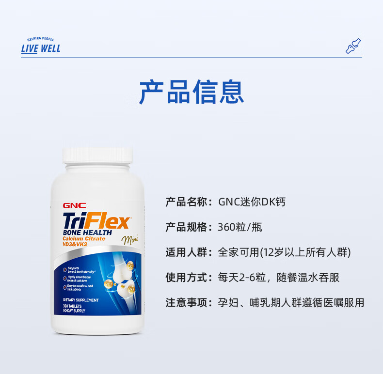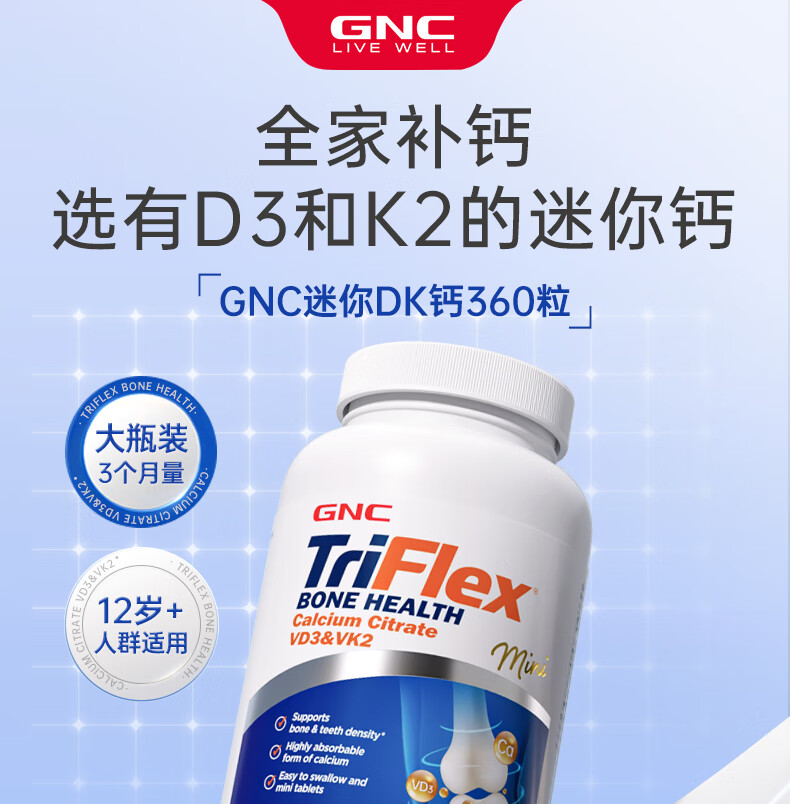 GNC健安喜 钙片易吸收 小粒易吞服 中老年成人补钙 强健骨骼 柠檬酸钙维生素D维生素K胶囊 360粒*1瓶