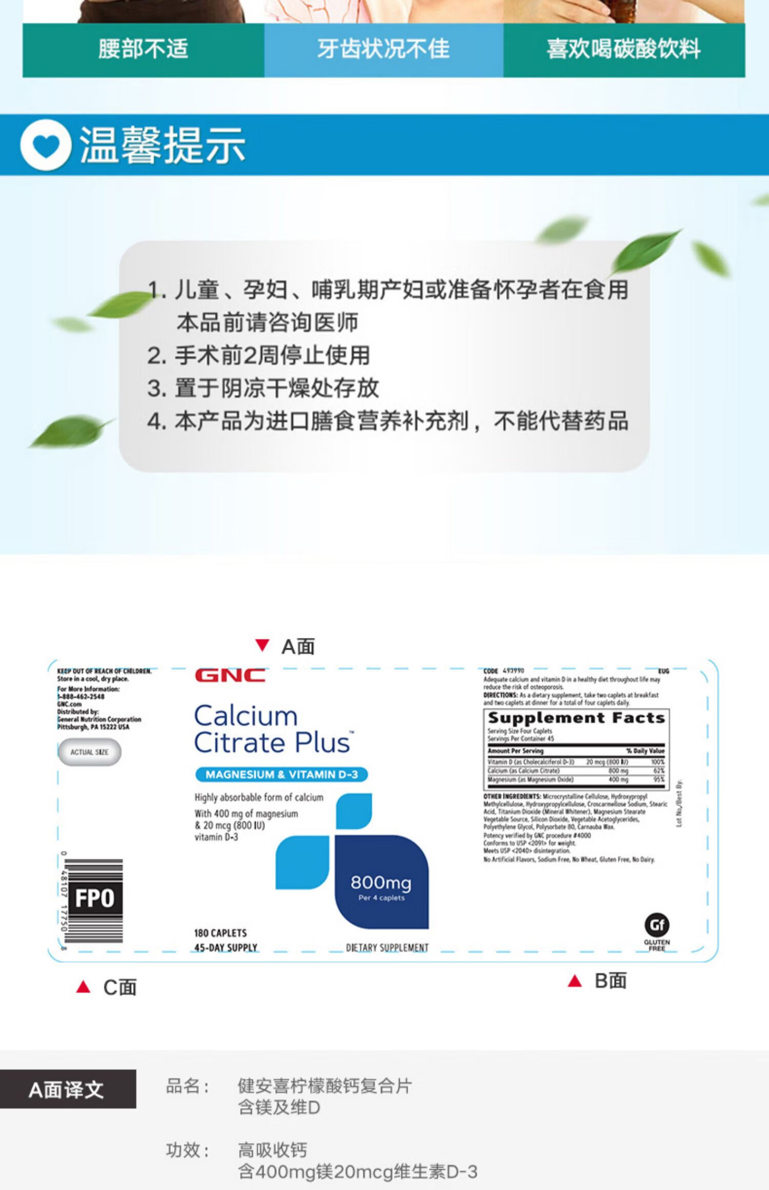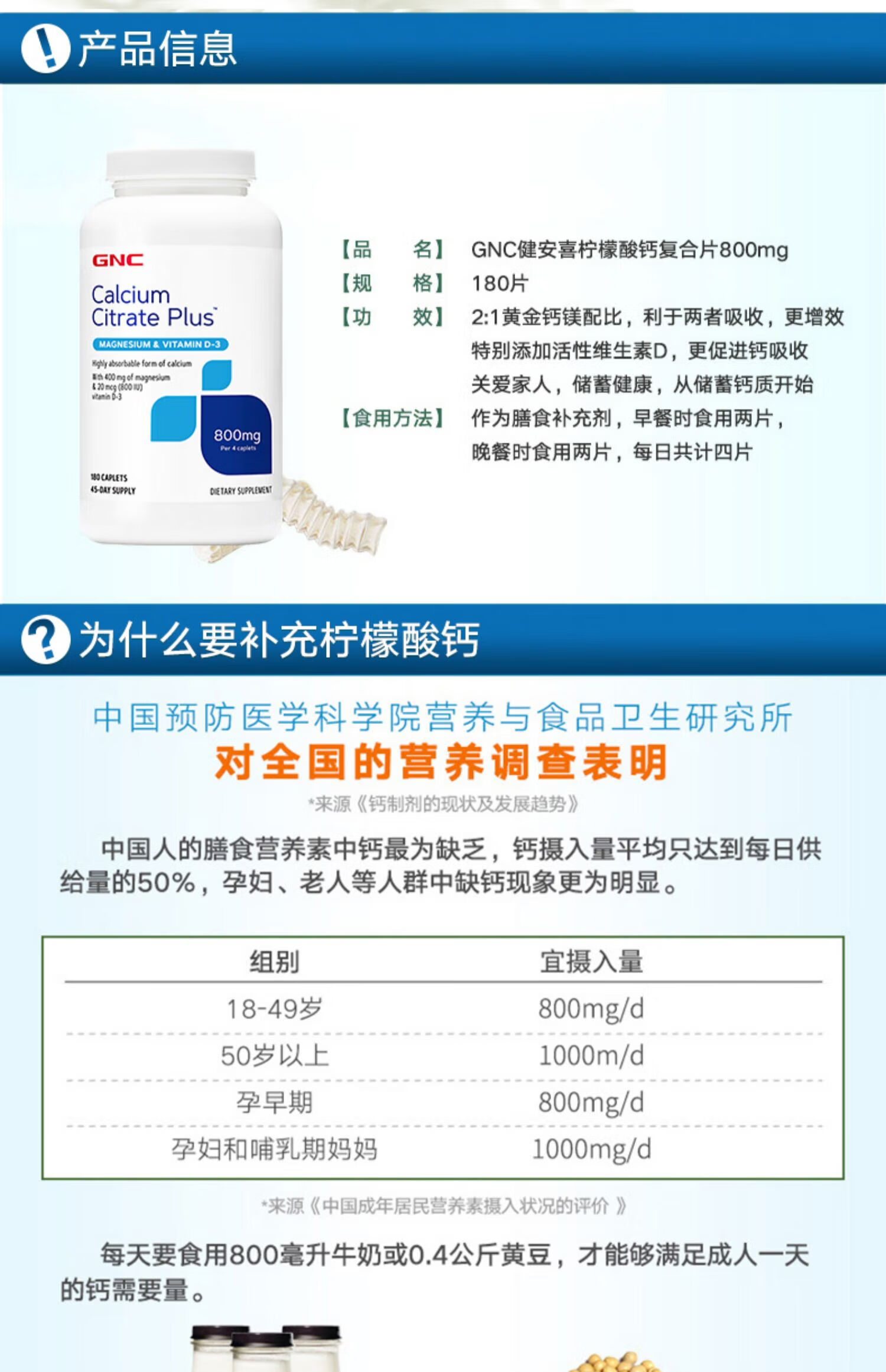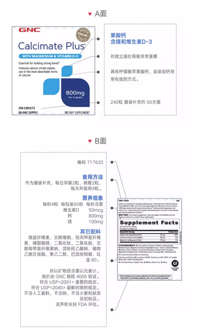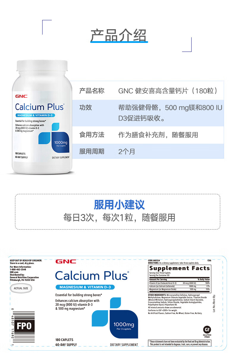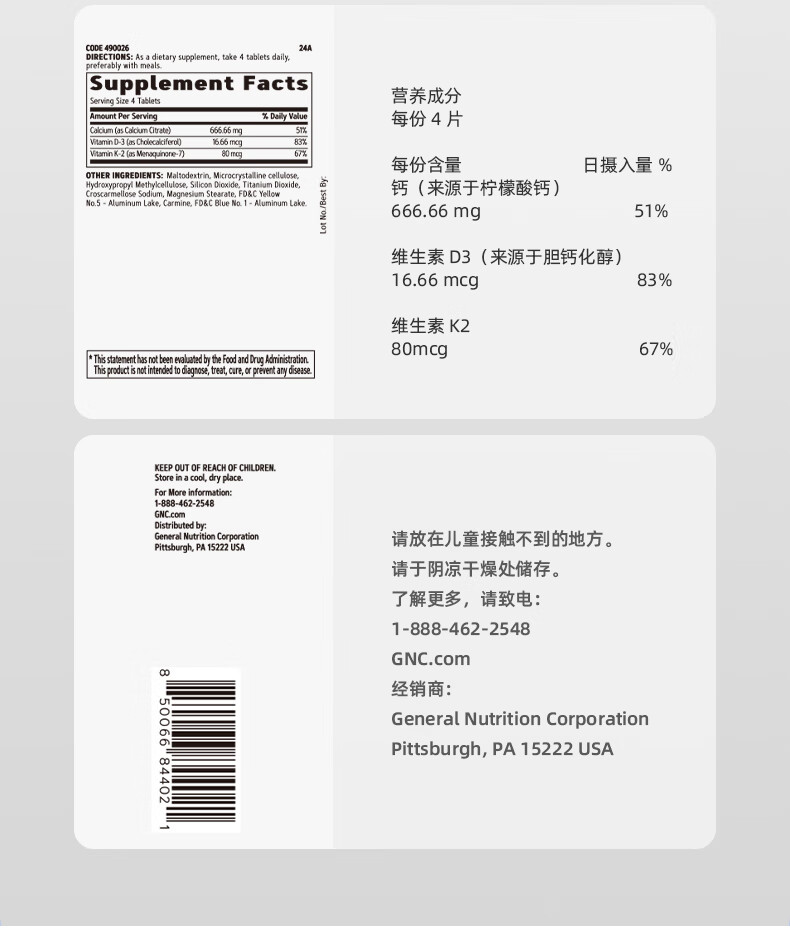 GNC健安喜 钙片易吸收 小粒易吞服 中老年成人补钙 强健骨骼 柠檬酸钙维生素D维生素K胶囊 360粒*1瓶