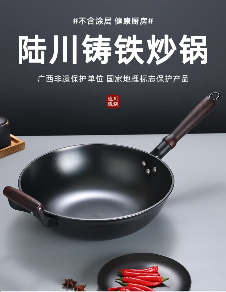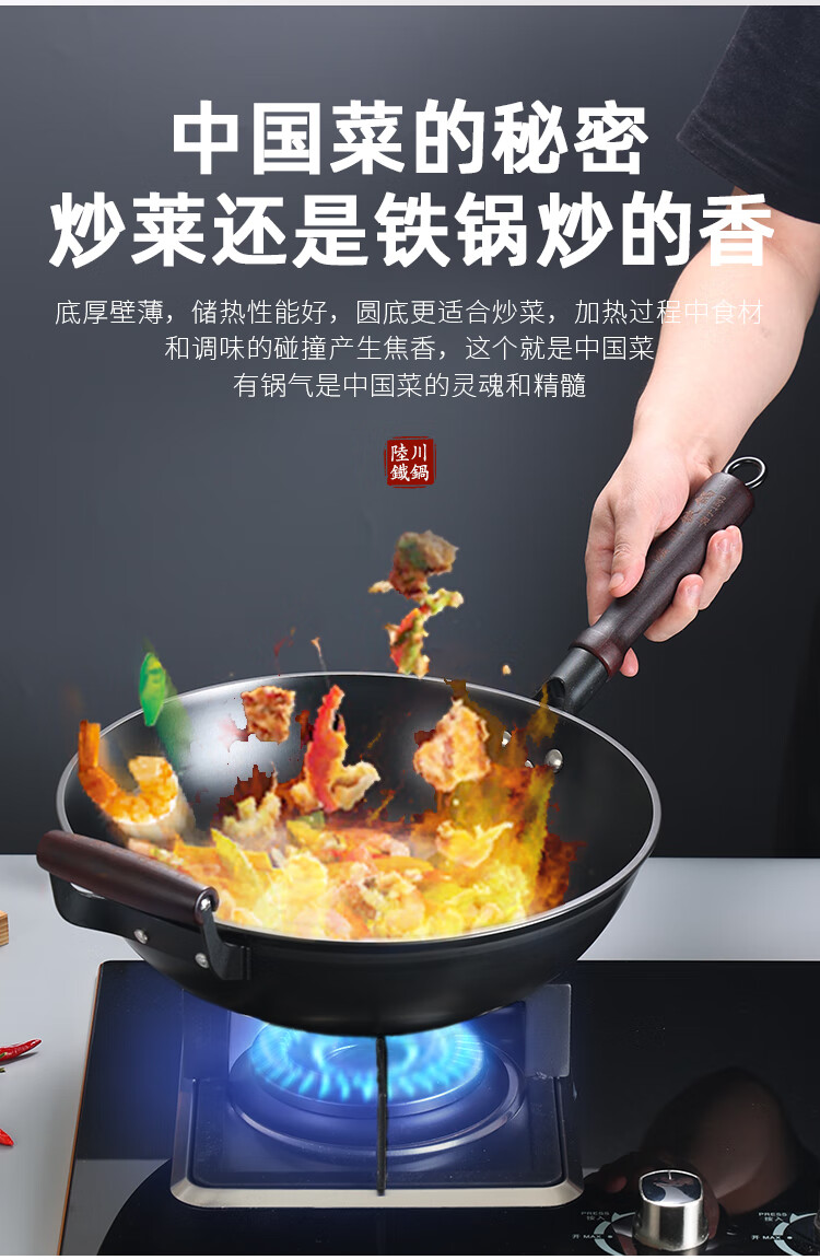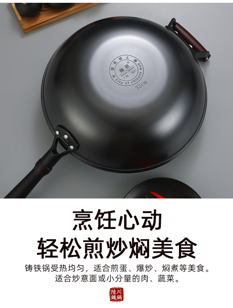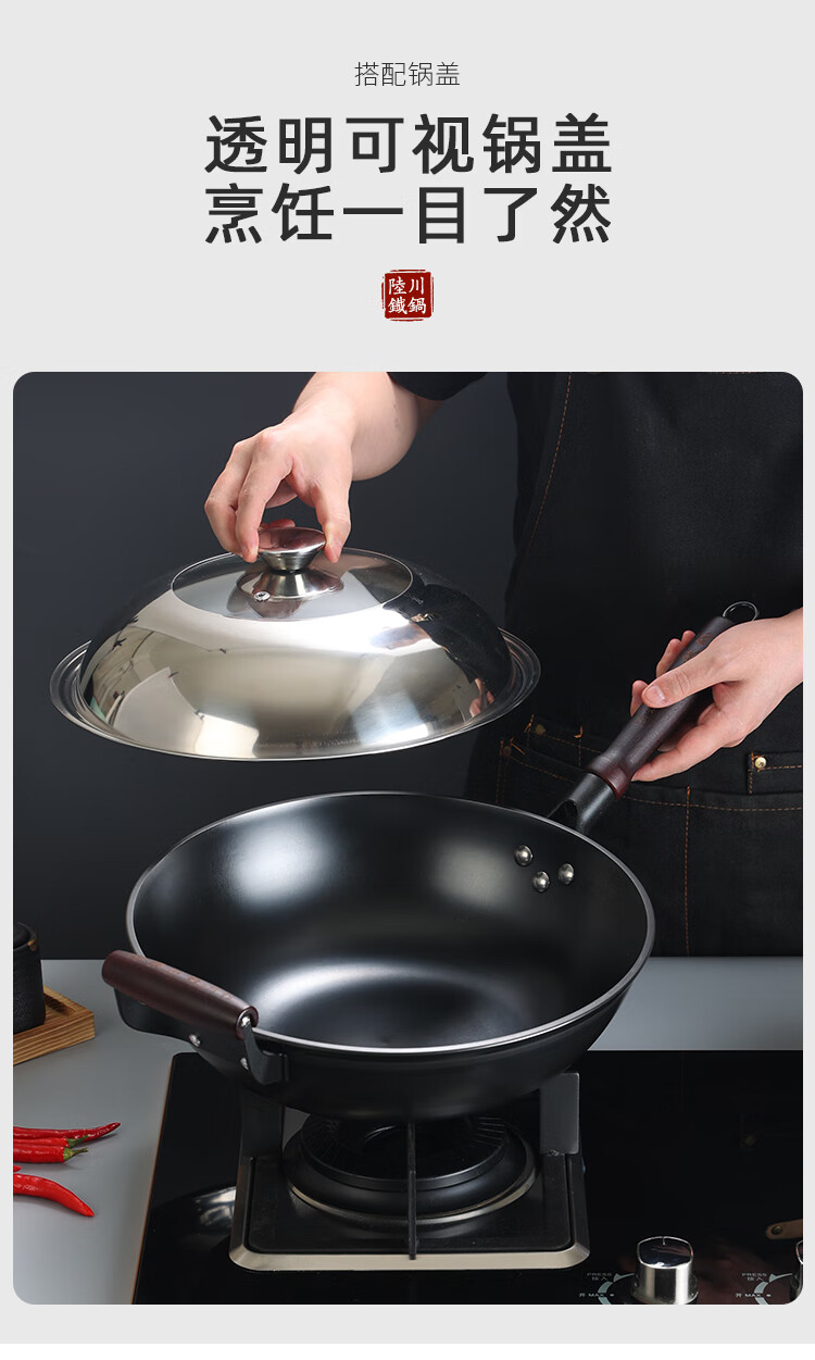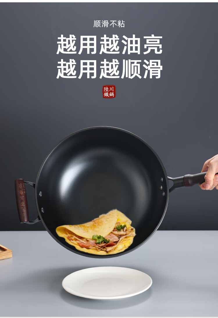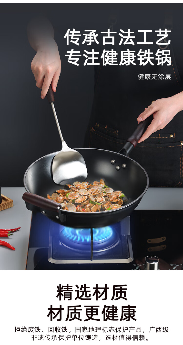 陆铁陆川铁锅手柄款加深平底炒锅无涂层不粘炒菜生铁铸铁锅电磁炉燃气 平底有耳款 34cm (带盖铲)已开锅