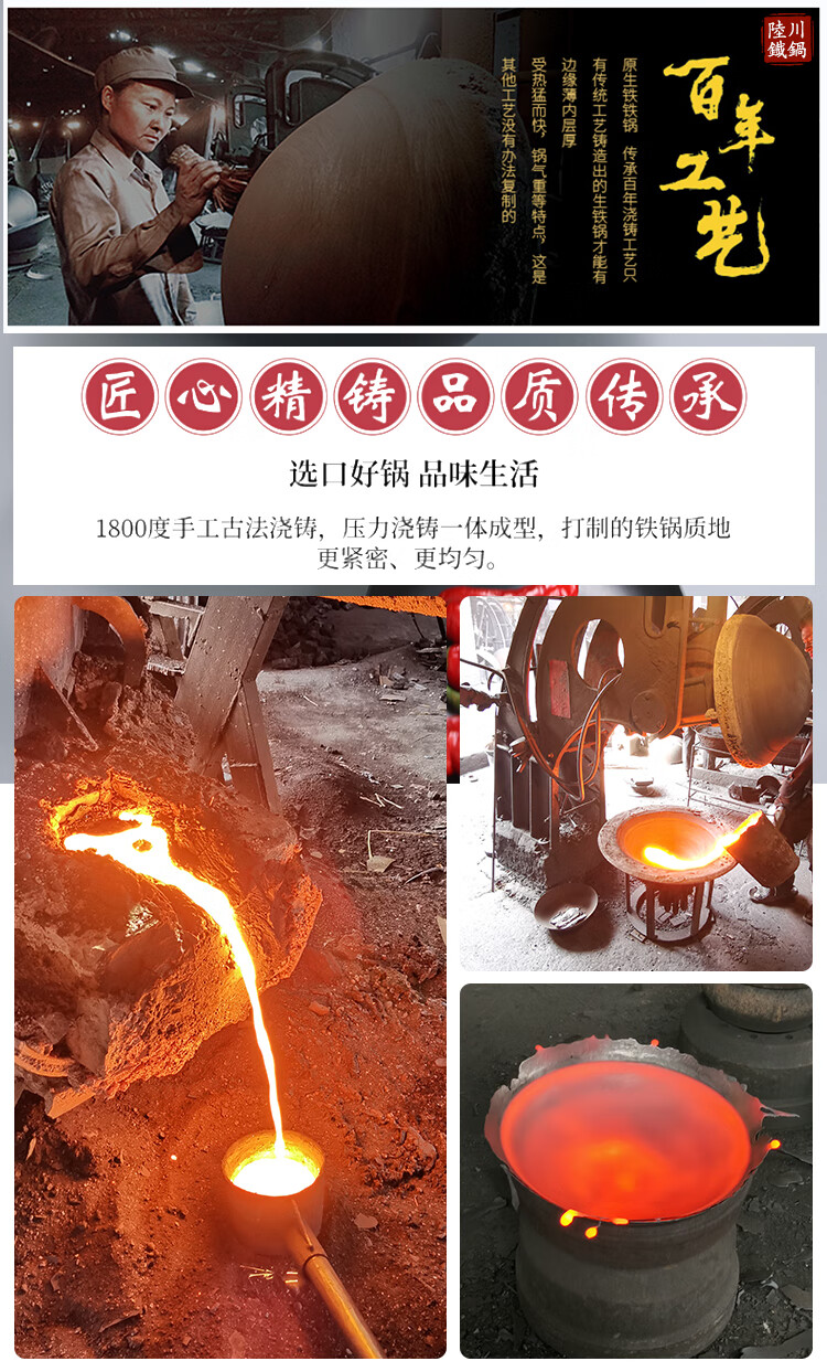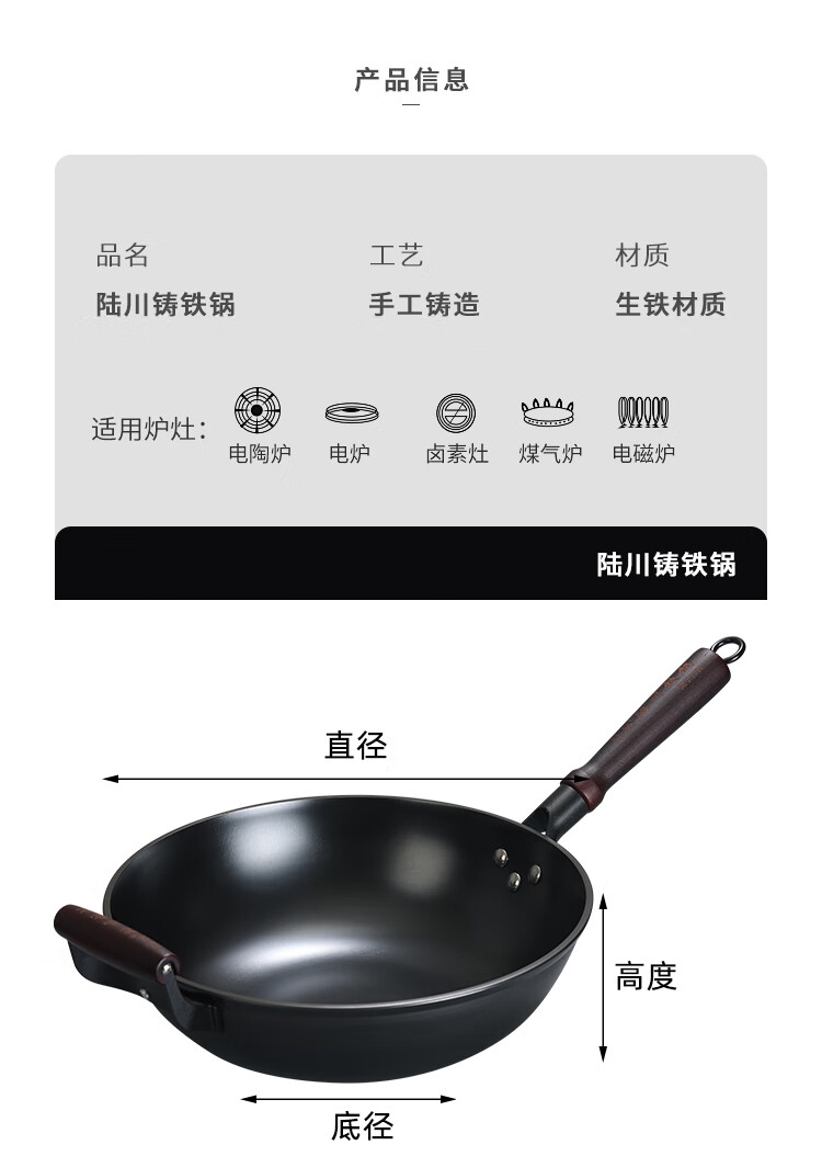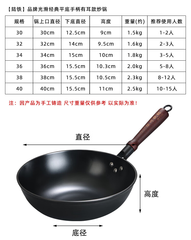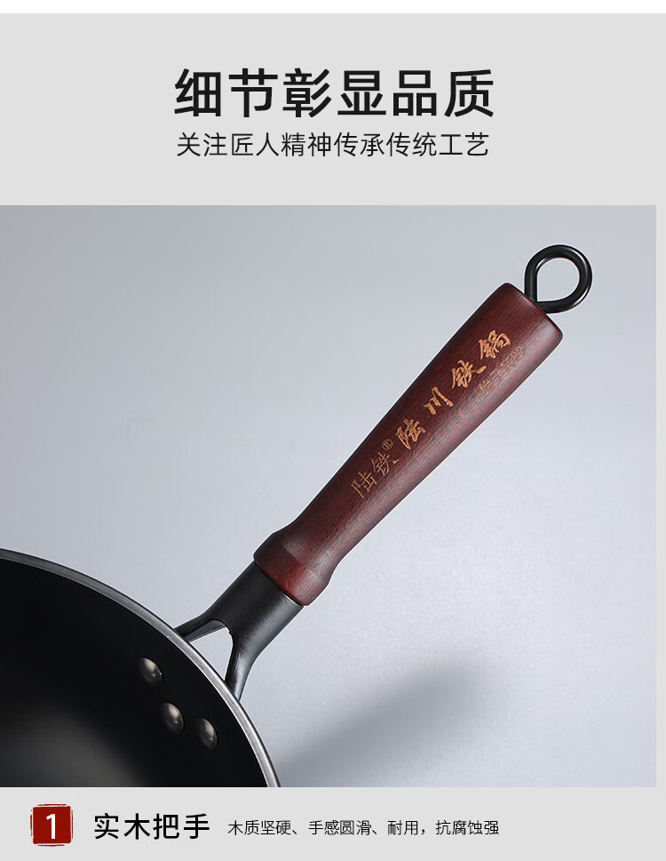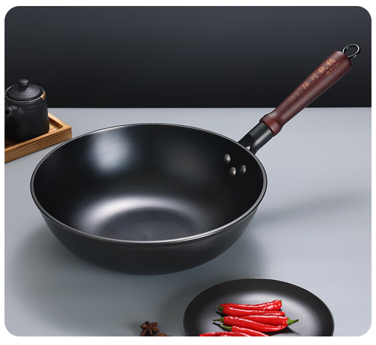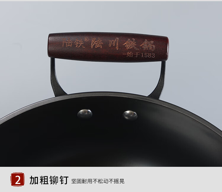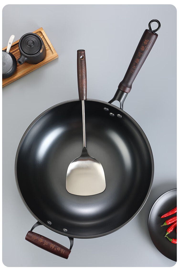 陆铁陆川铁锅手柄款加深平底炒锅无涂层不粘炒菜生铁铸铁锅电磁炉燃气 平底有耳款 34cm (带盖铲)已开锅