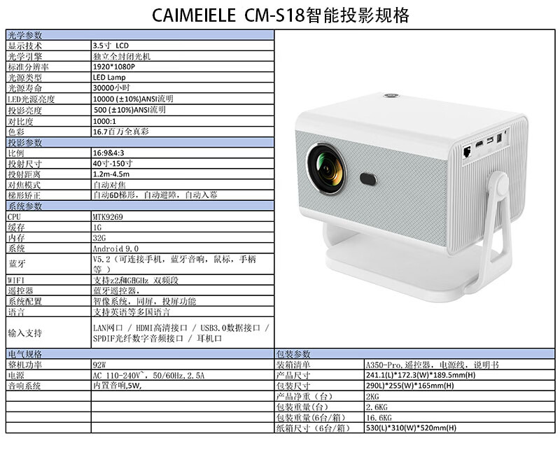 CAIMEIELE智能高清投影仪CM-S18自动对焦无极缩放1080P高清手机无线同屏语音交互 支持4K播放 支持上电开机