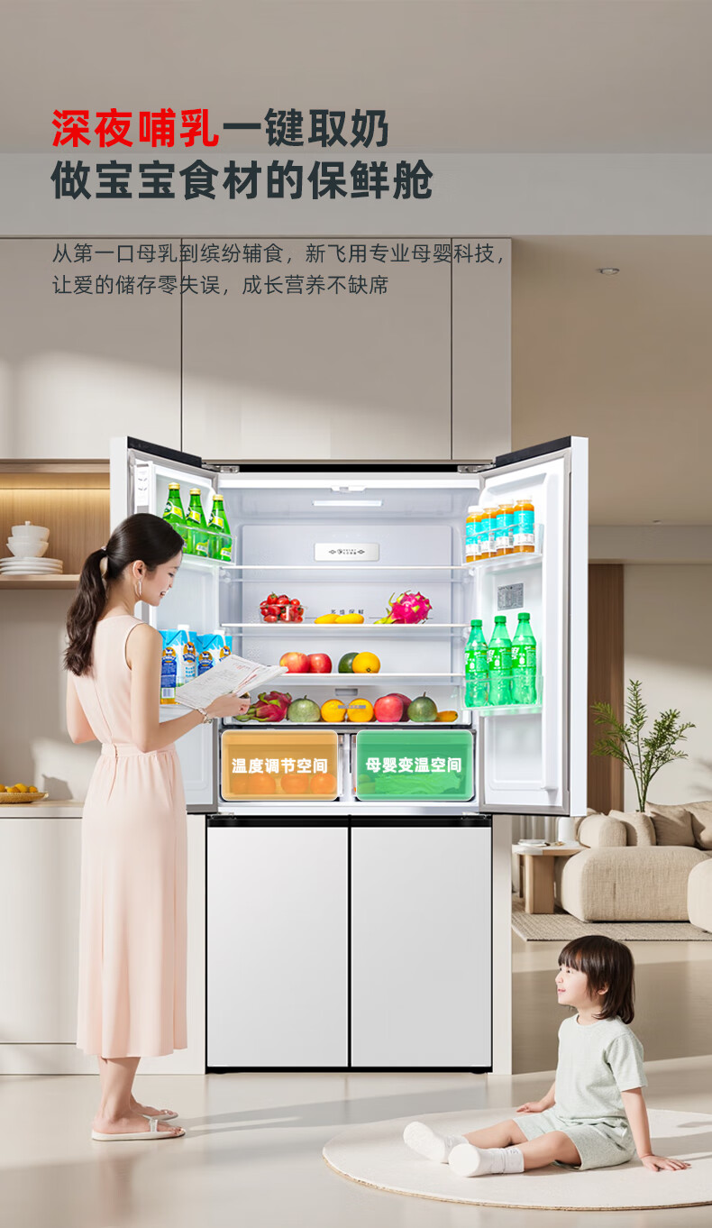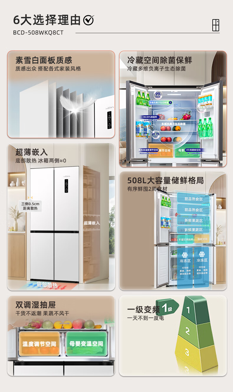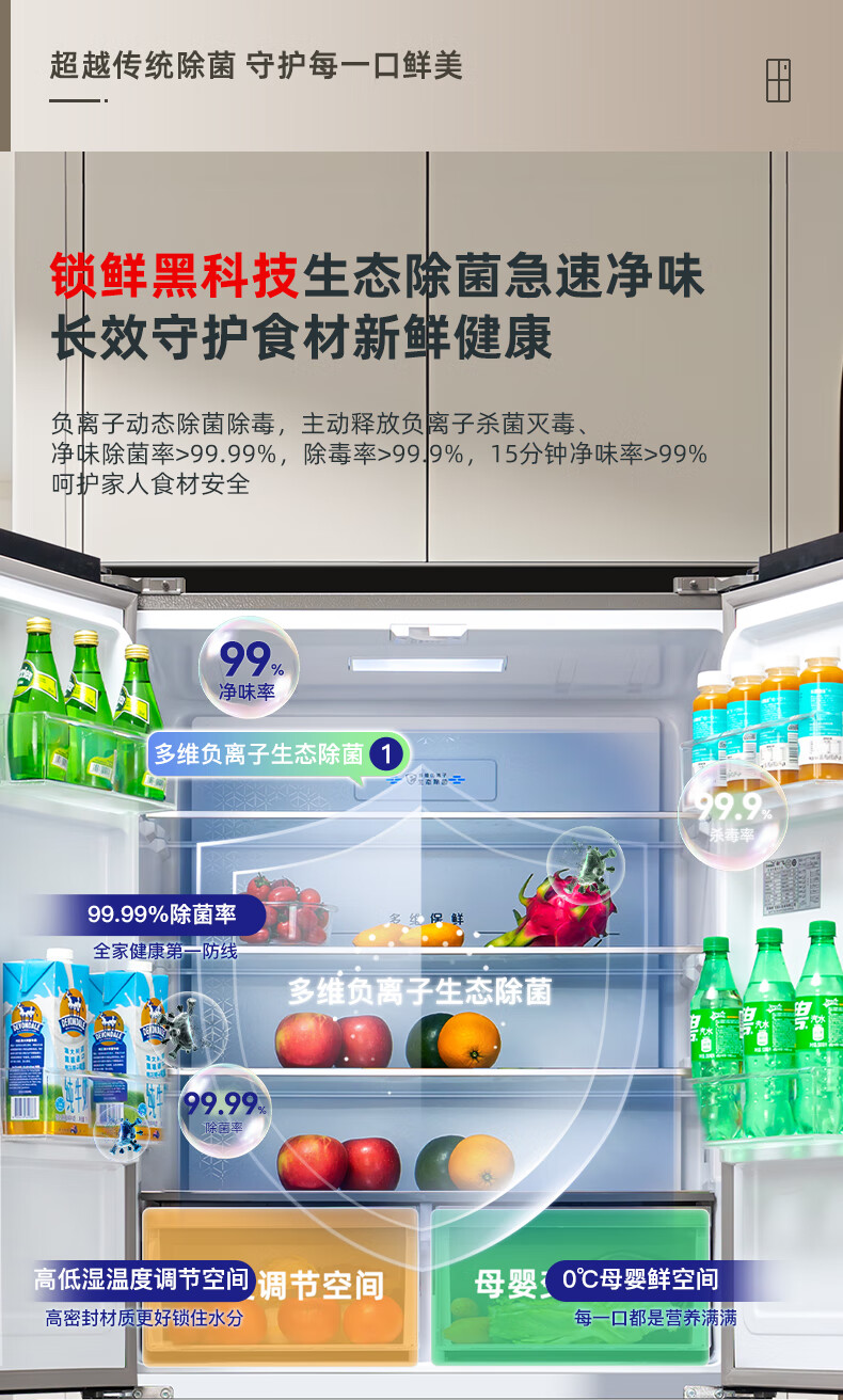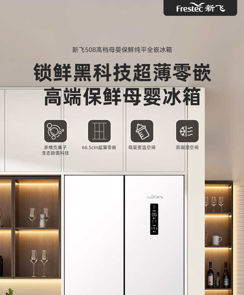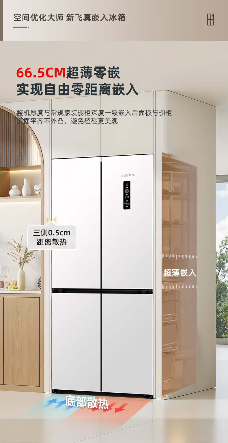 新飞508L十字门负离子主动除菌移动制冰舱超薄零嵌一级风冷无霜大容量冰箱BCD-508WKQ8CT