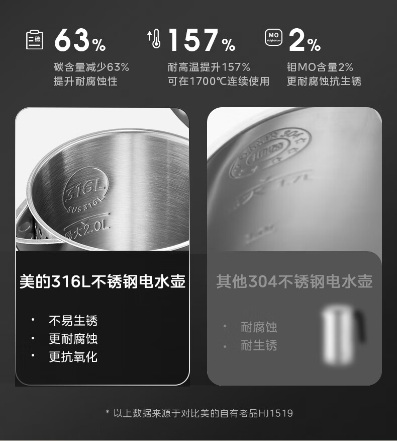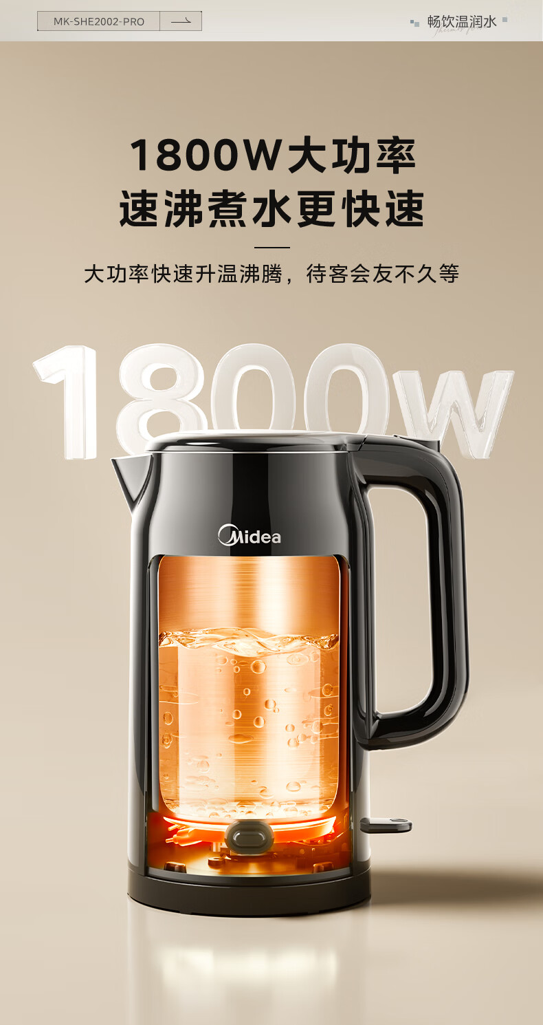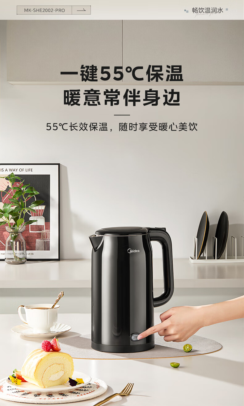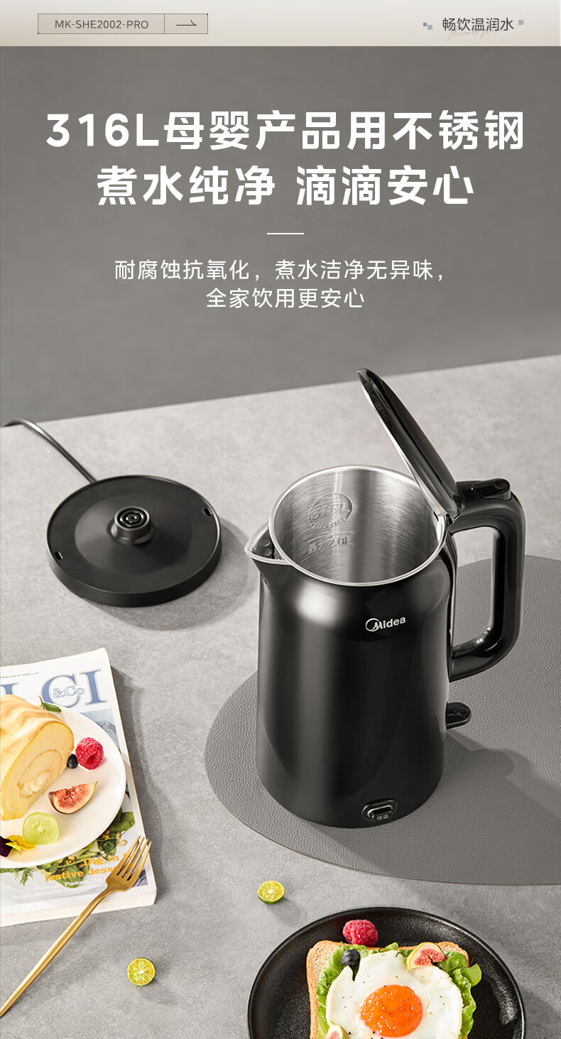 美的(Midea)电水壶电热水壶烧水壶自动断电保温一体 316L不锈钢2L大容量开水壶恒温壶MK-SHE2002-PRO