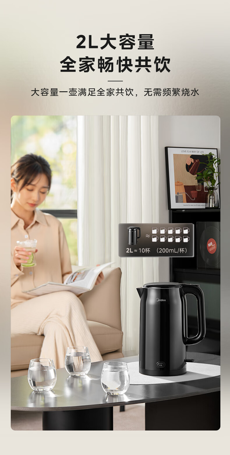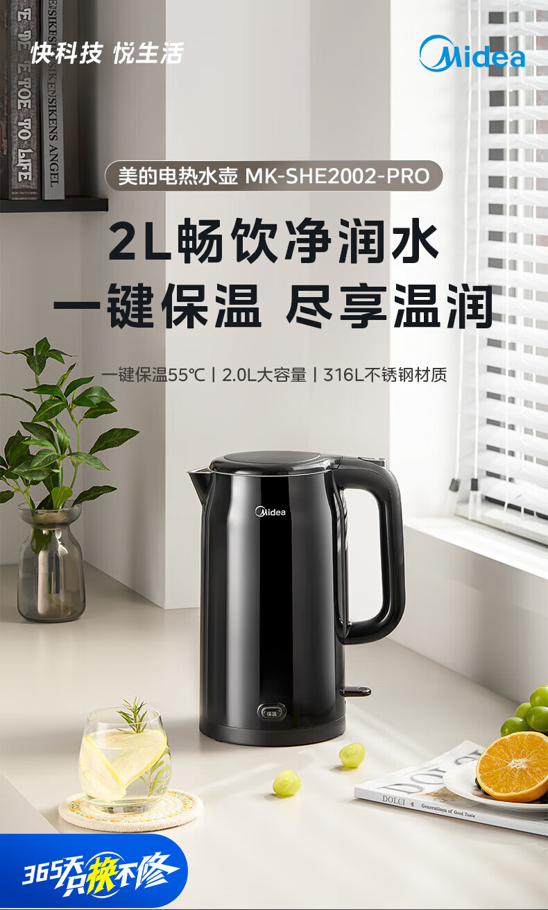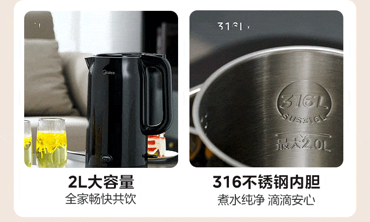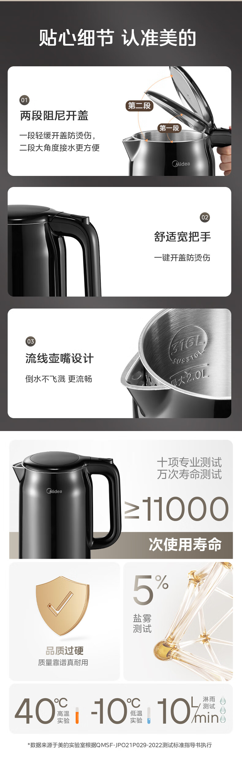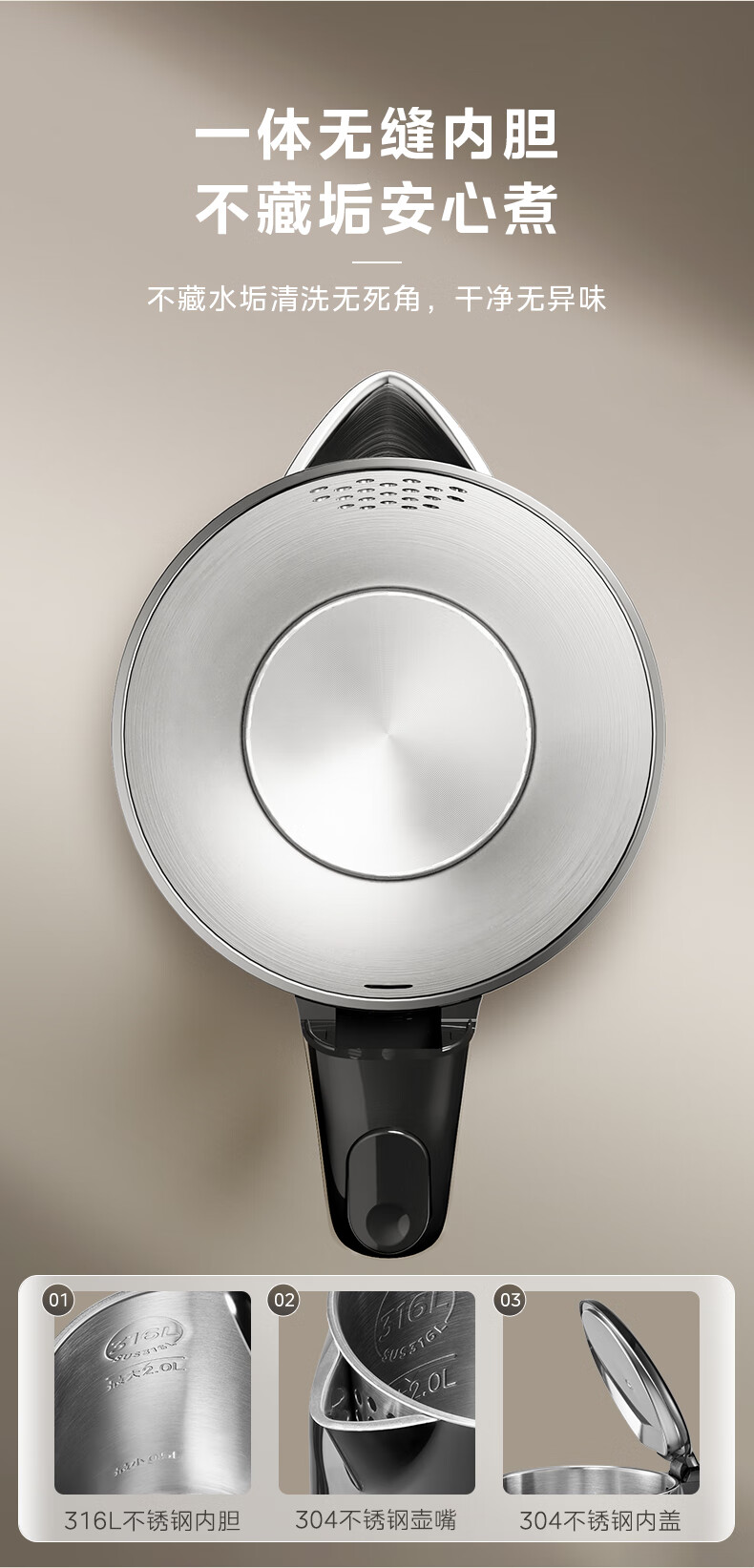 美的(Midea)电水壶电热水壶烧水壶自动断电保温一体 316L不锈钢2L大容量开水壶恒温壶MK-SHE2002-PRO