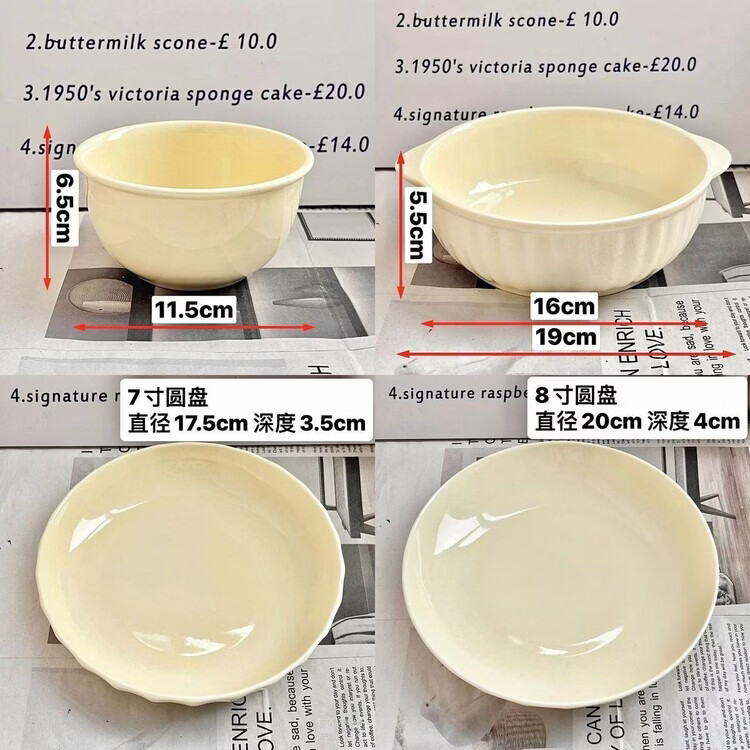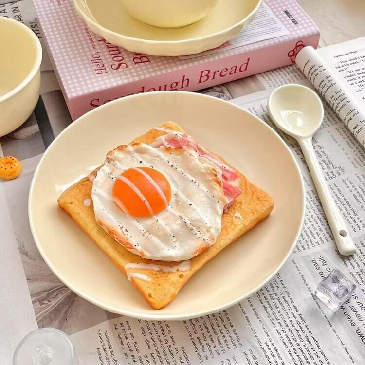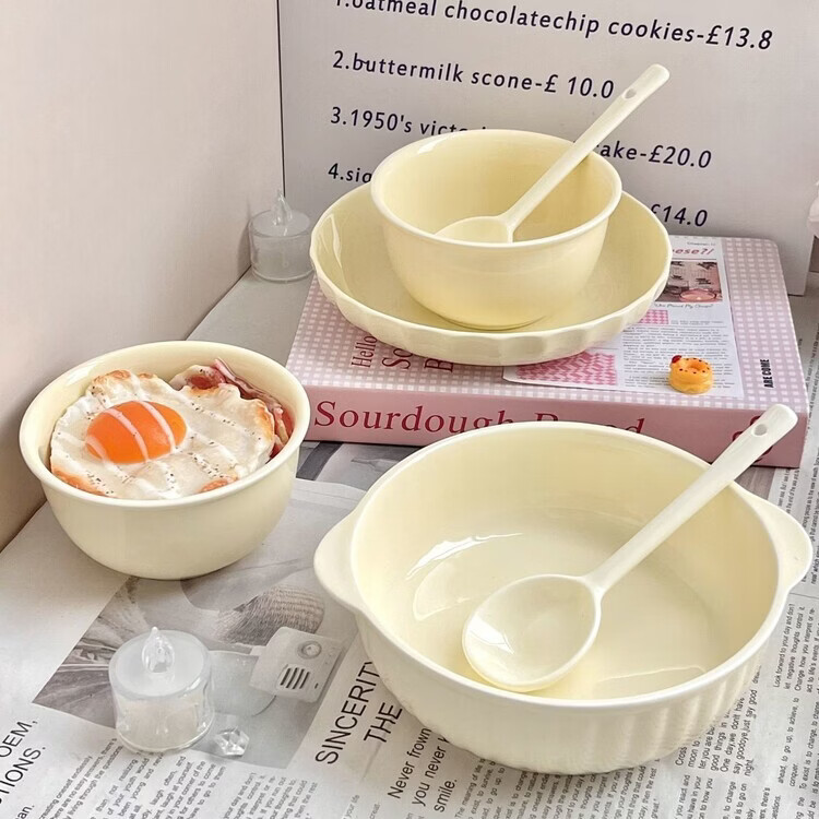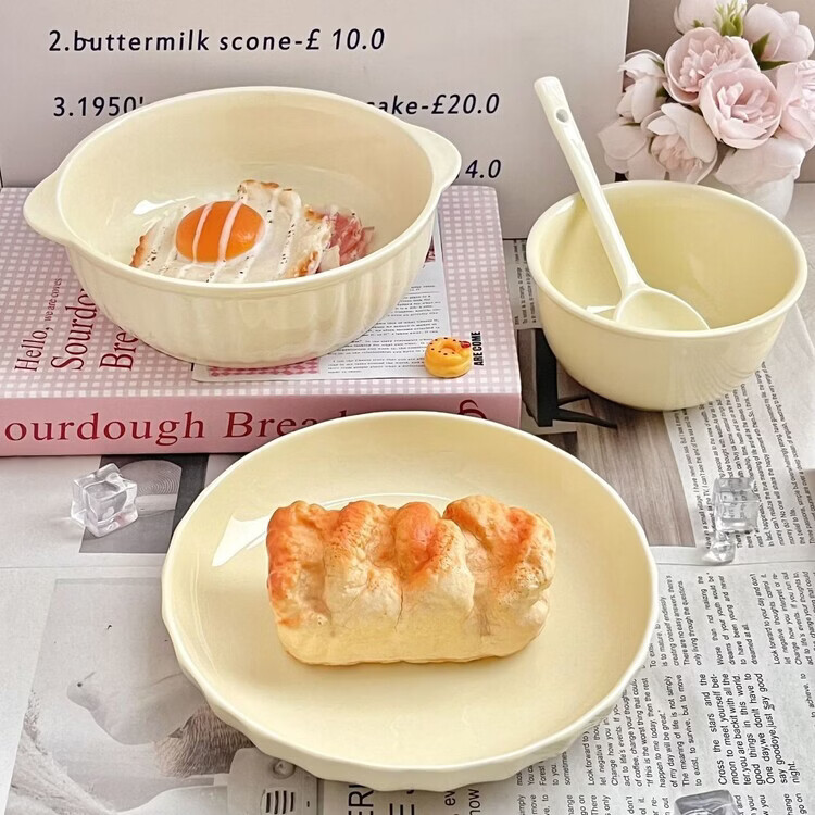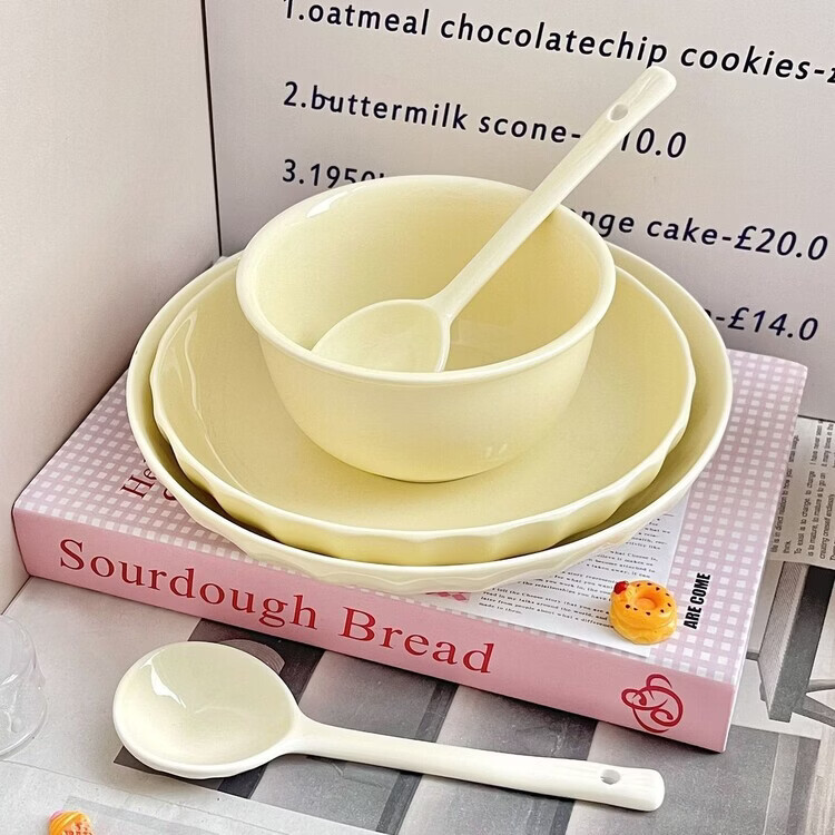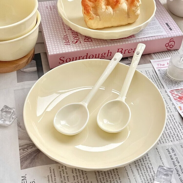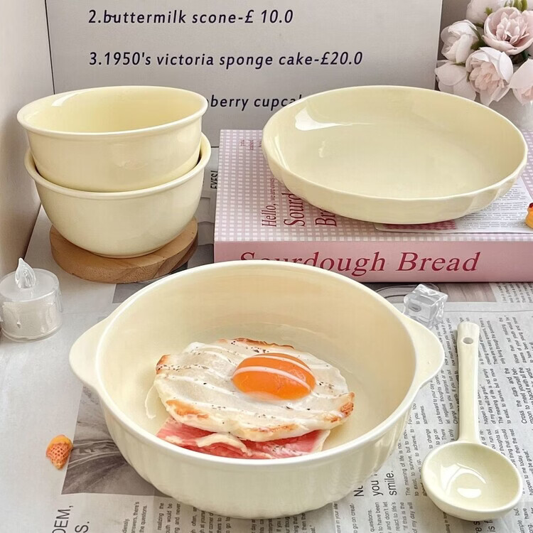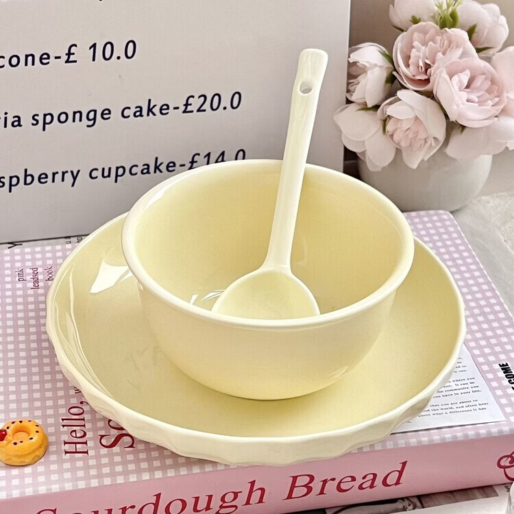 咏夏奶fufu高颜值釉下彩陶瓷餐具套装家用陶瓷饭碗组合汤碗圆盘家用 4件套【8寸盘+米饭碗+勺子+筷子】-奶黄