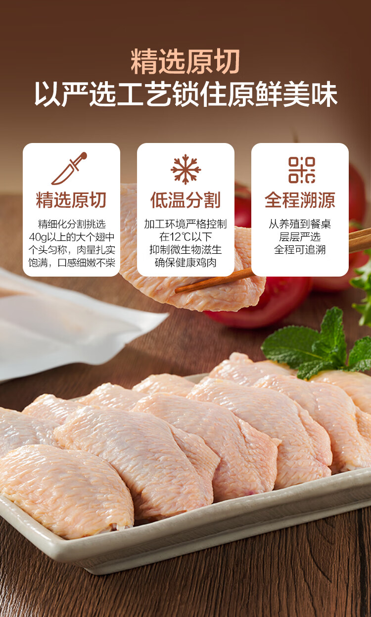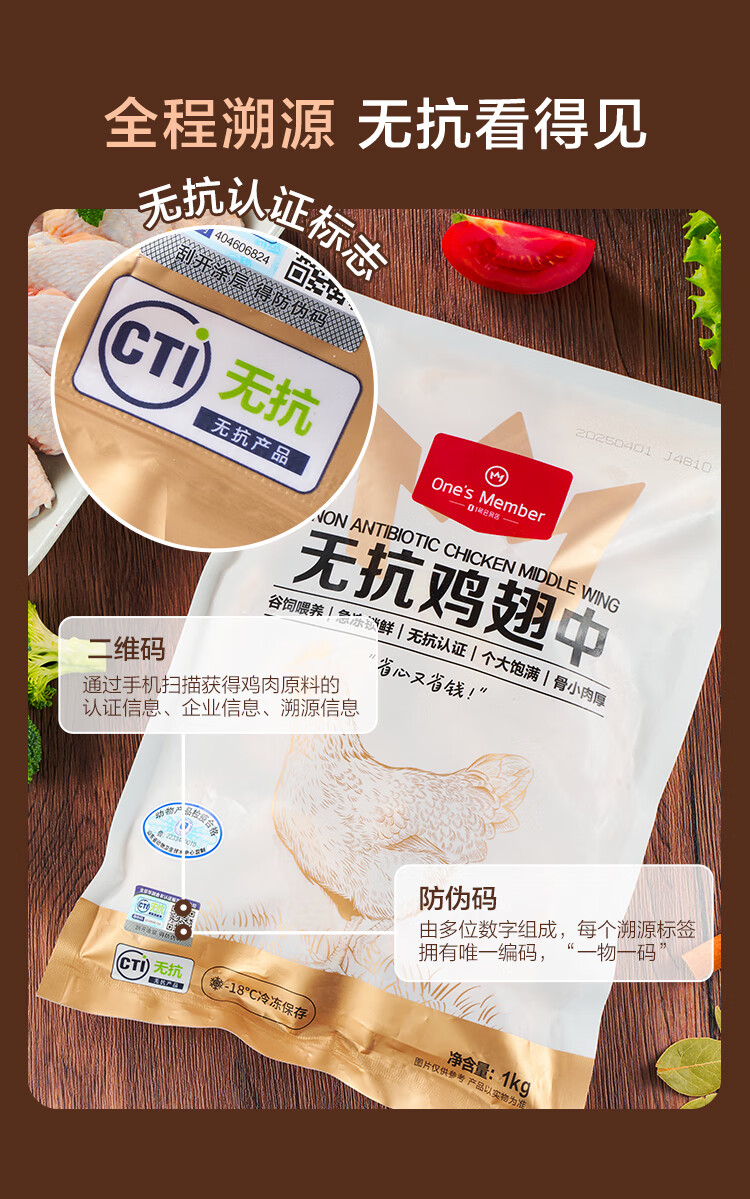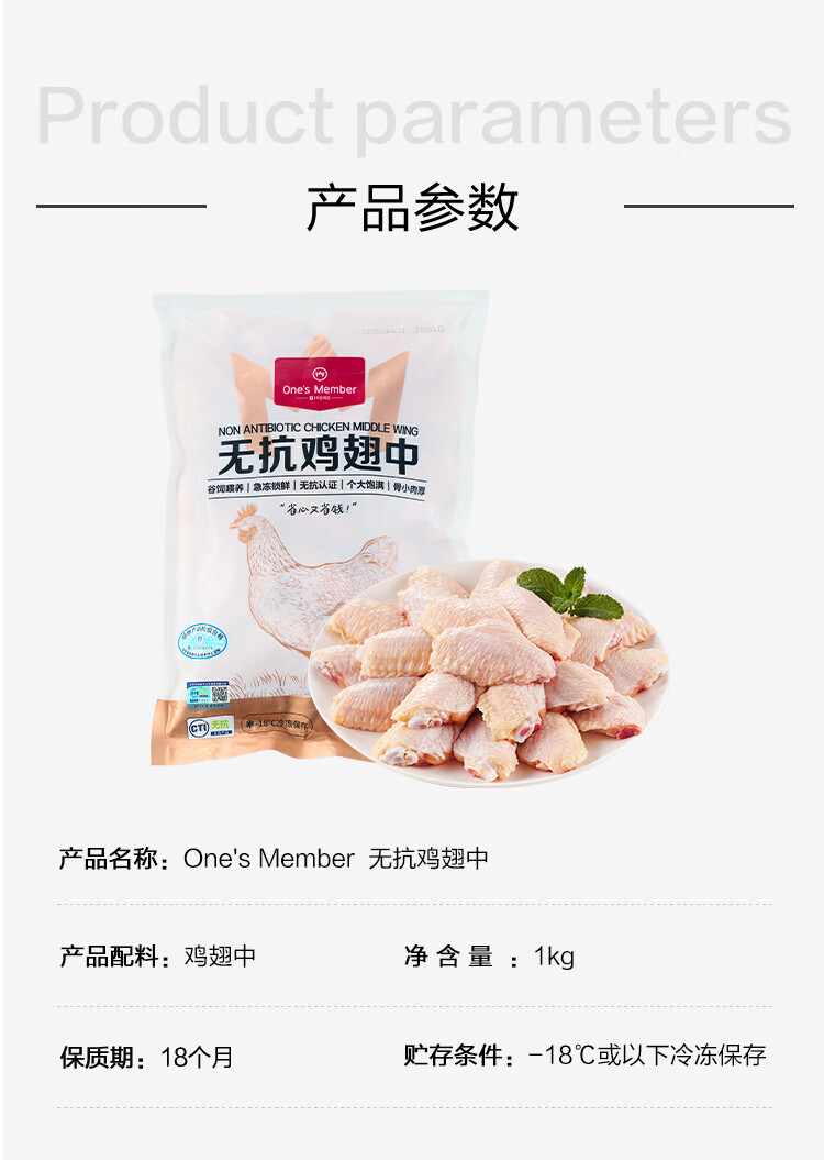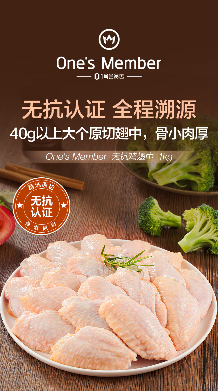 1号会员店(One's Member) 无抗鸡翅中大号出口级鸡肉烤鸡翅炸翅中 净重2斤