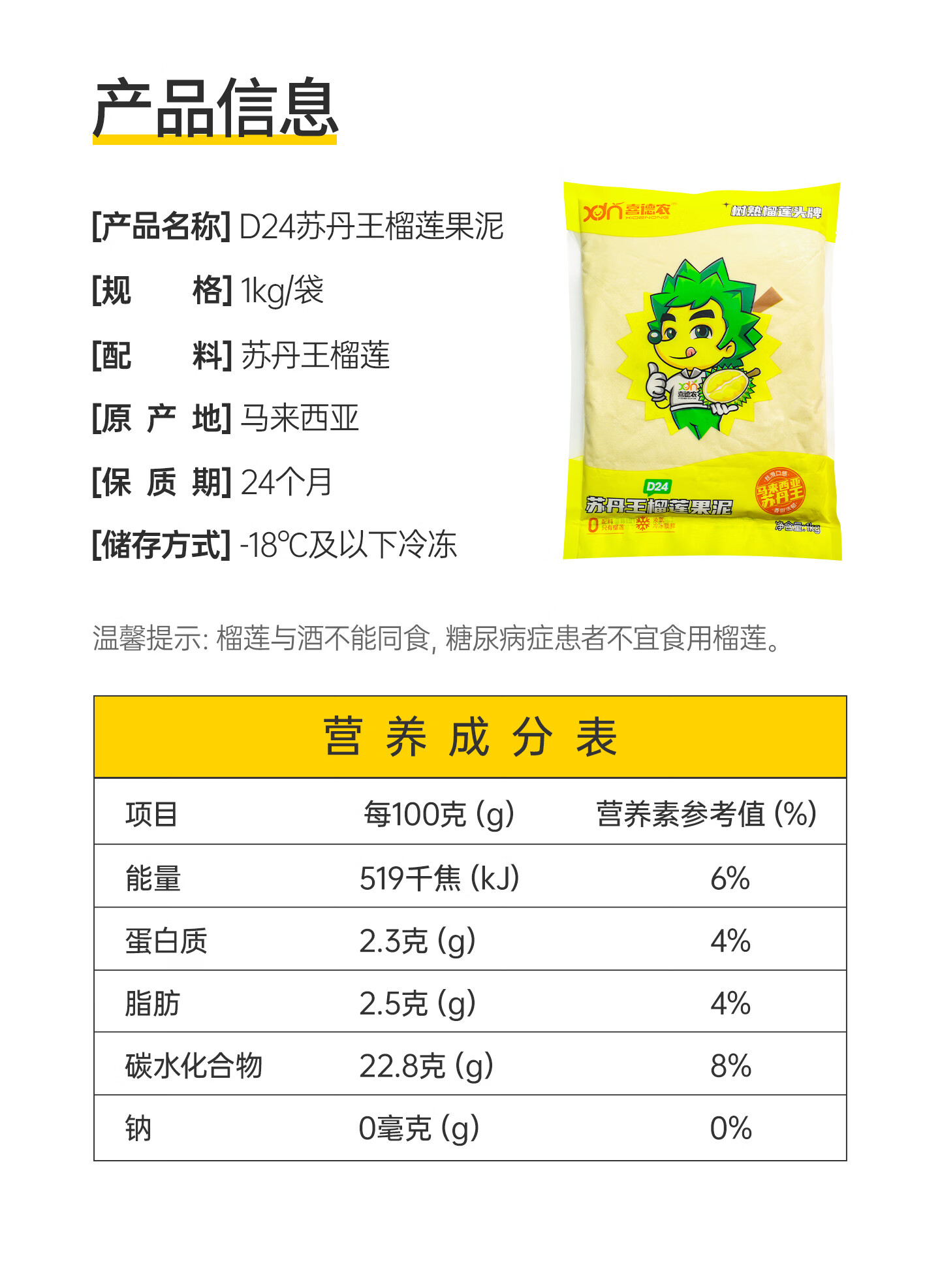 喜德农马来西亚苏丹王d24果泥1kg榴莲泥冷冻无核果肉泥高端甜品烘焙商用 1kgx1包 苏丹王D24榴莲果泥