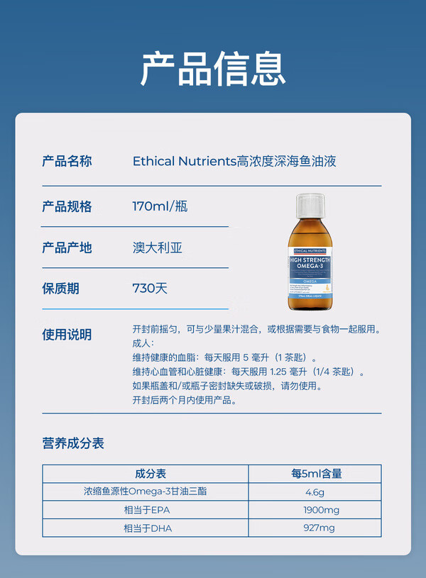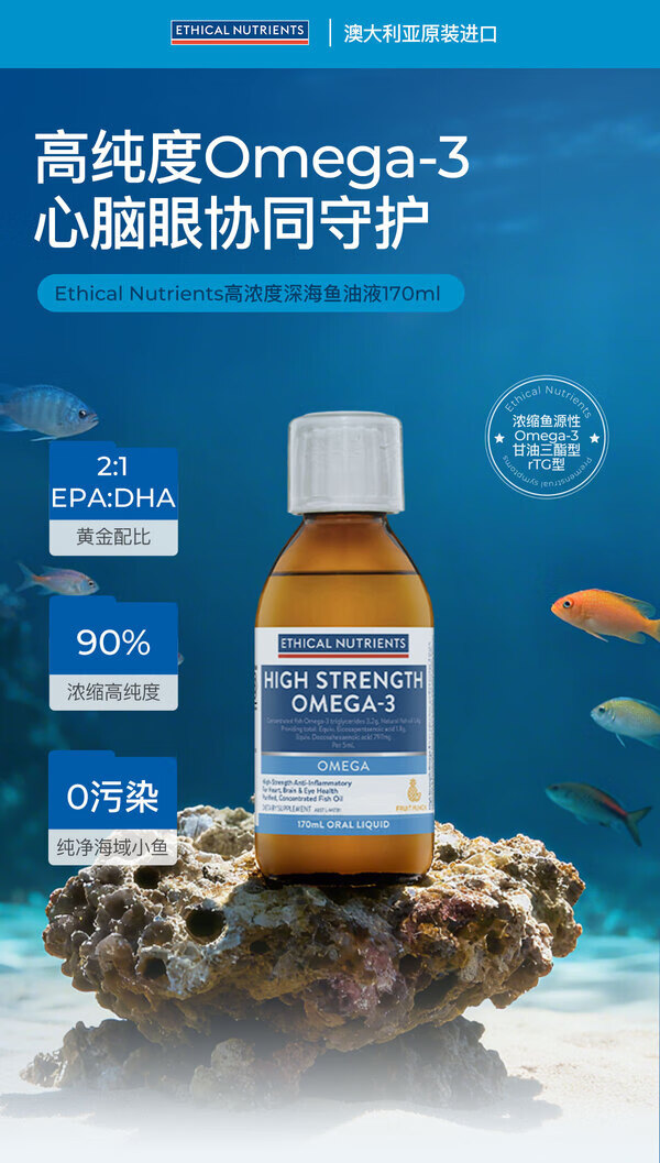 ETHICAL NUTRIENTS澳洲益嘉恩高浓度OMEGA-3深海液体鱼油rTG型心血管认知健康170ml 170ml*1瓶 EPA+DHA