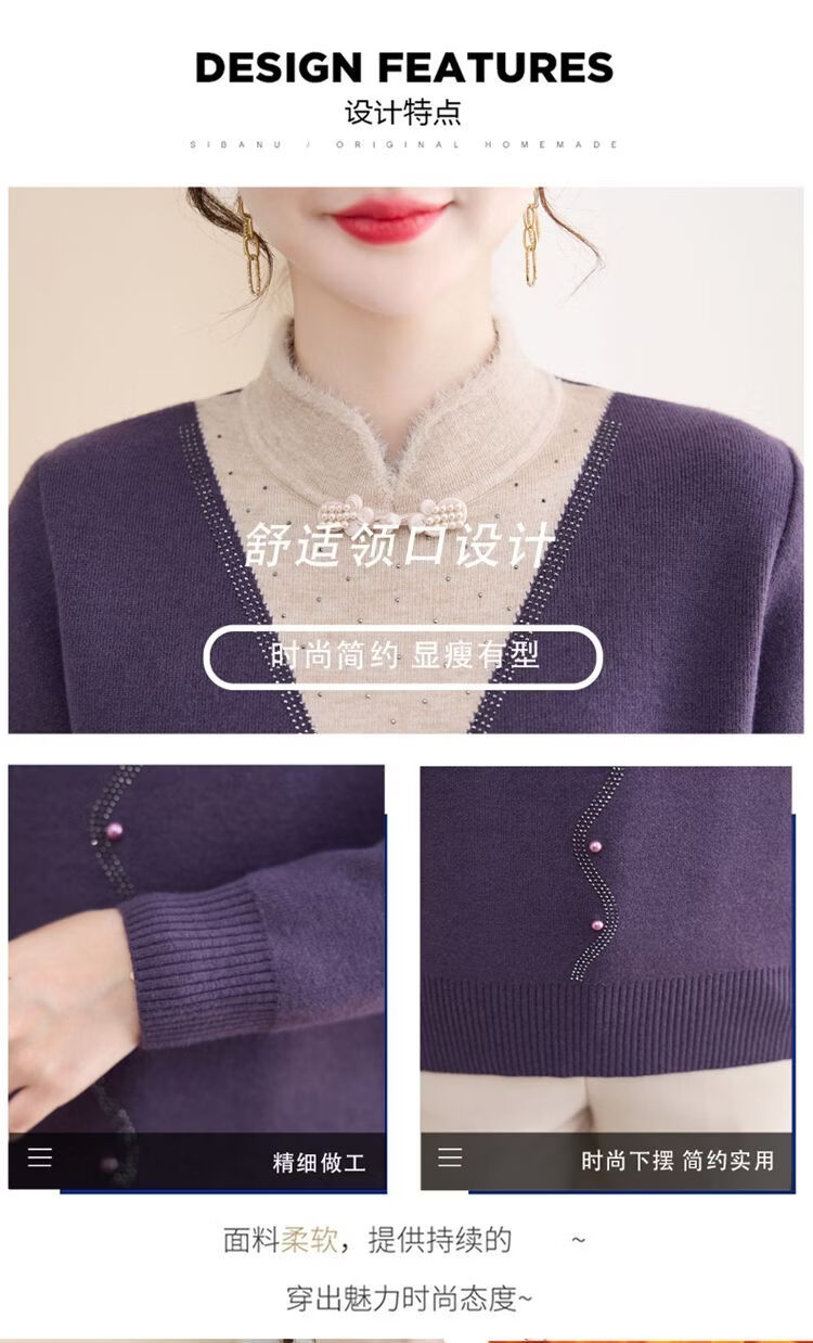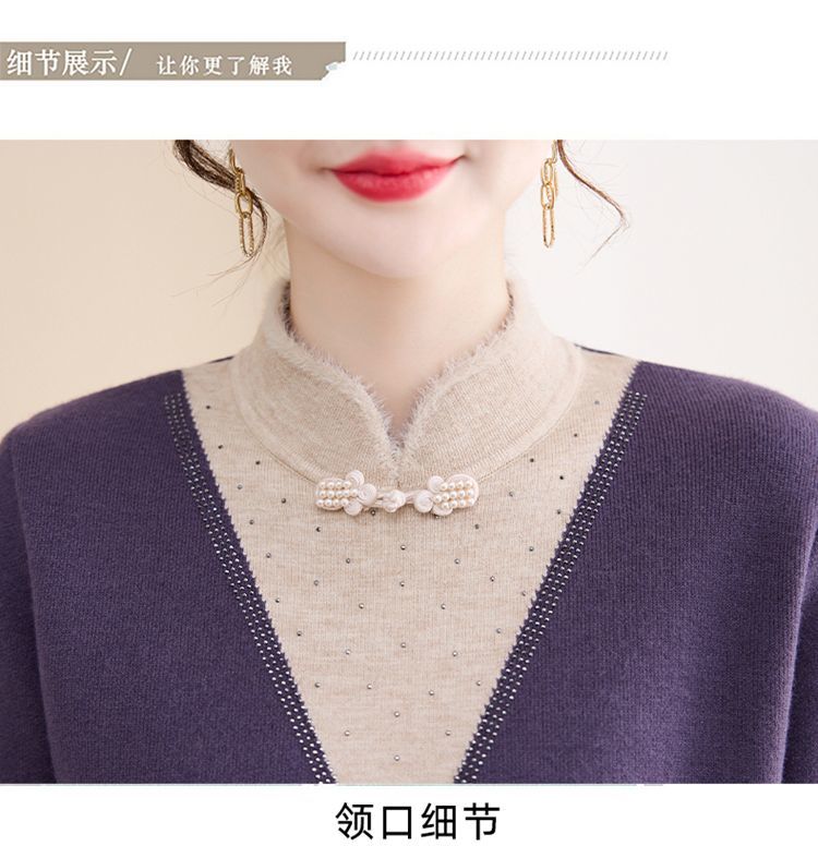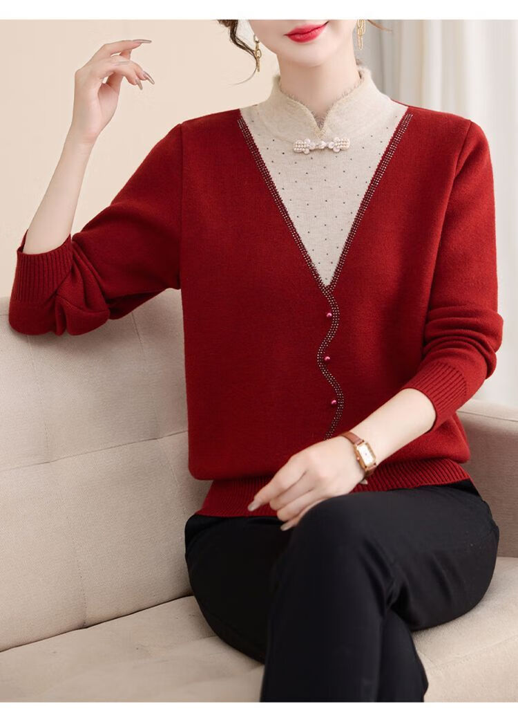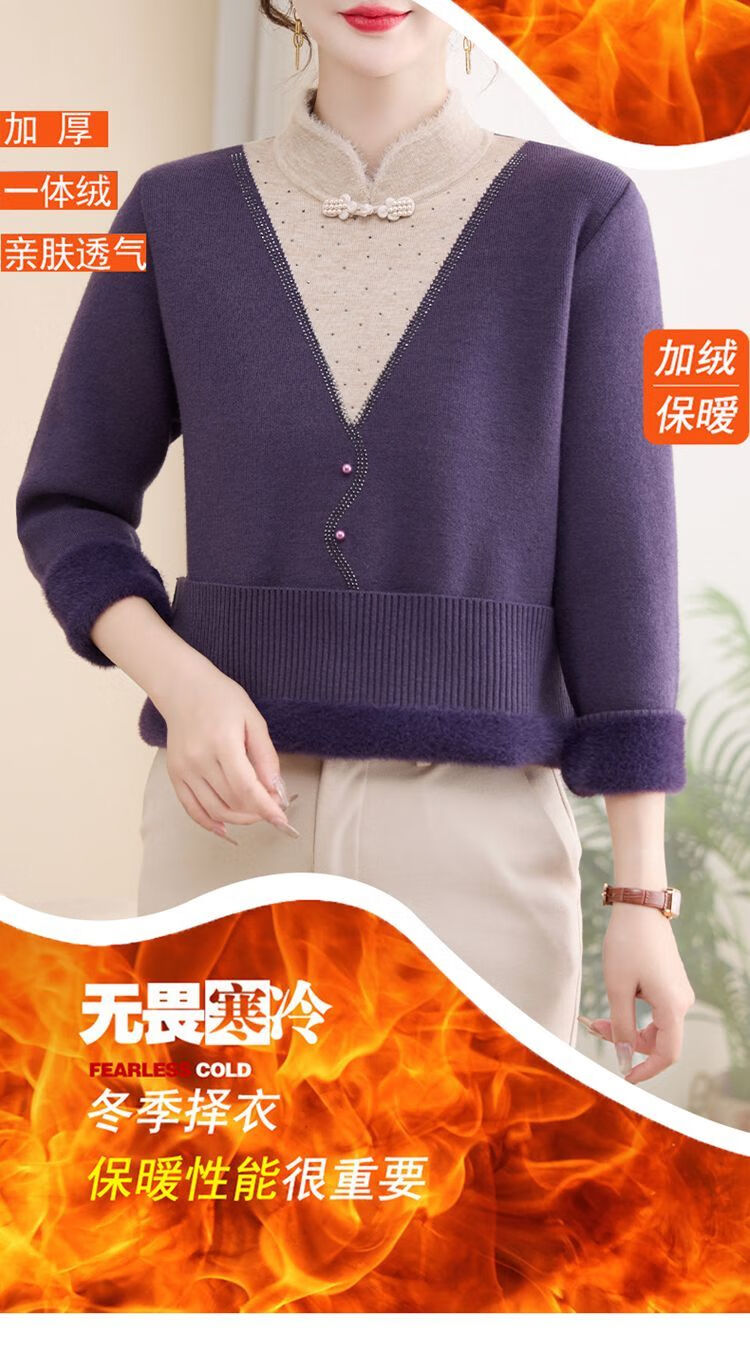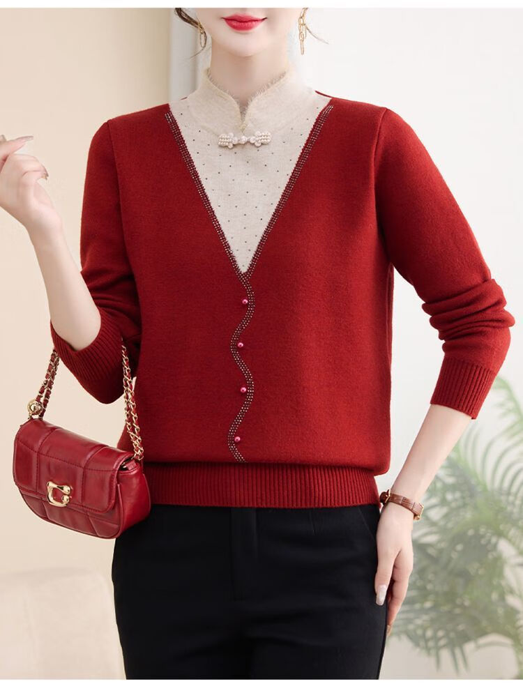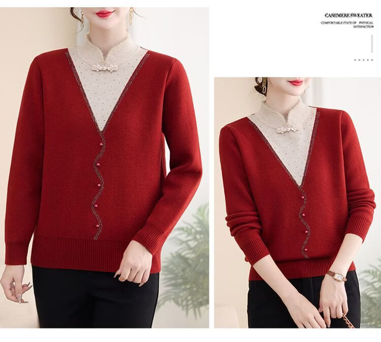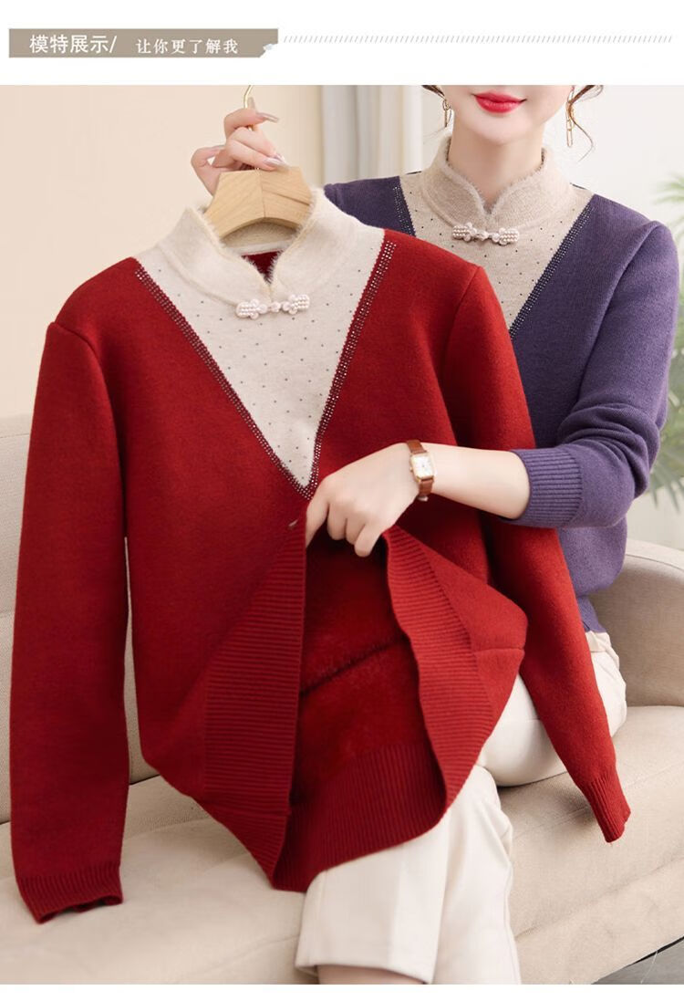 妈妈秋冬国风假两件毛衣一体绒针织打底衫新款女装加绒加厚上衣 【25125】安哥拉红 加绒 XL 建议90-110斤