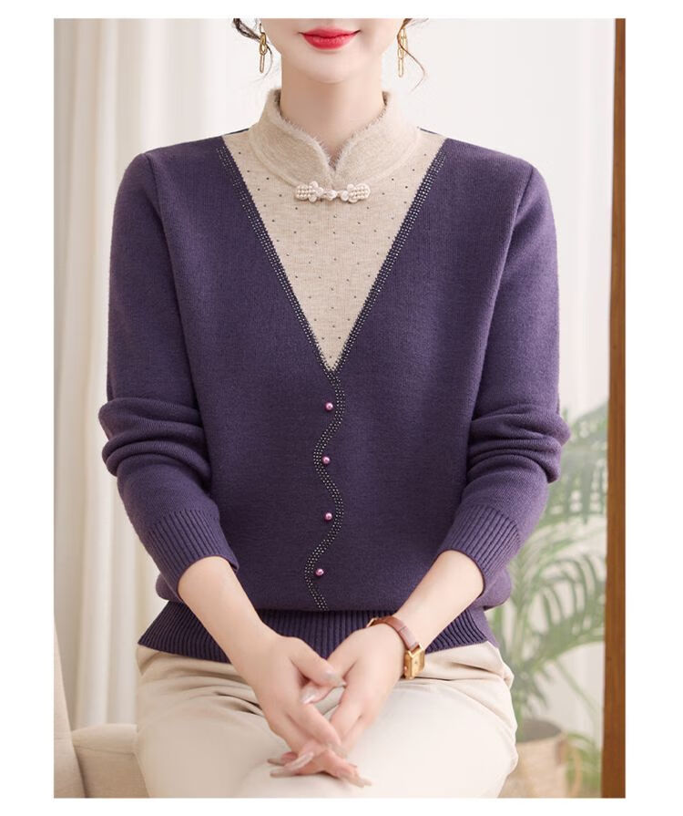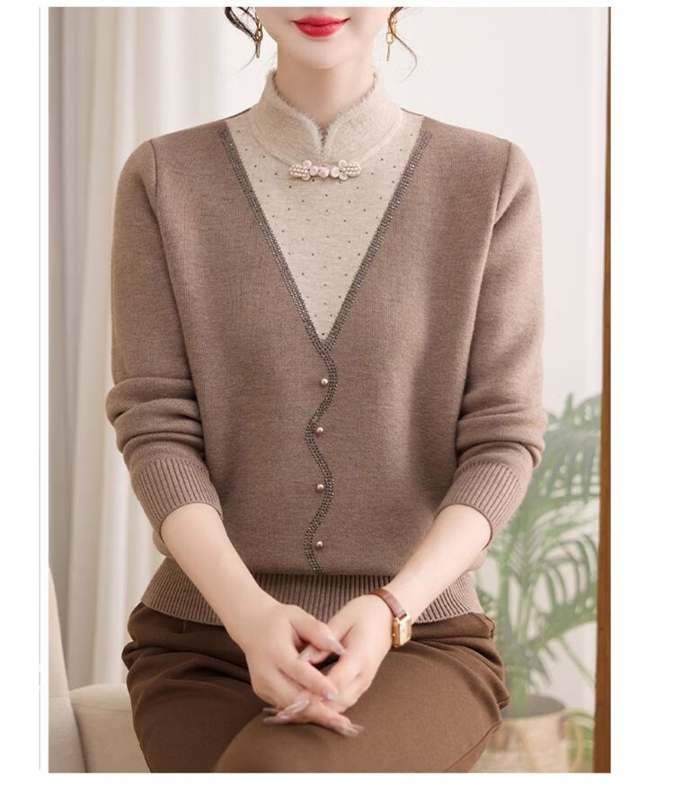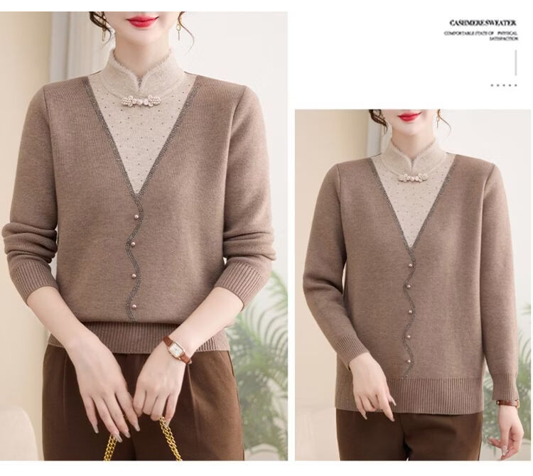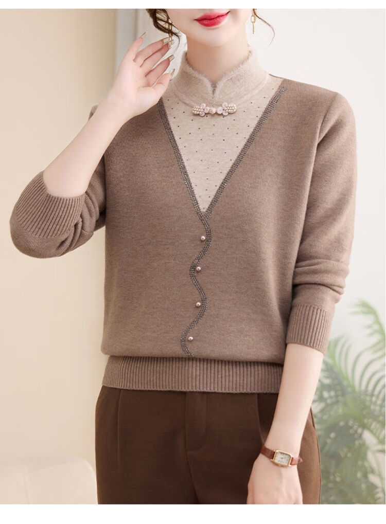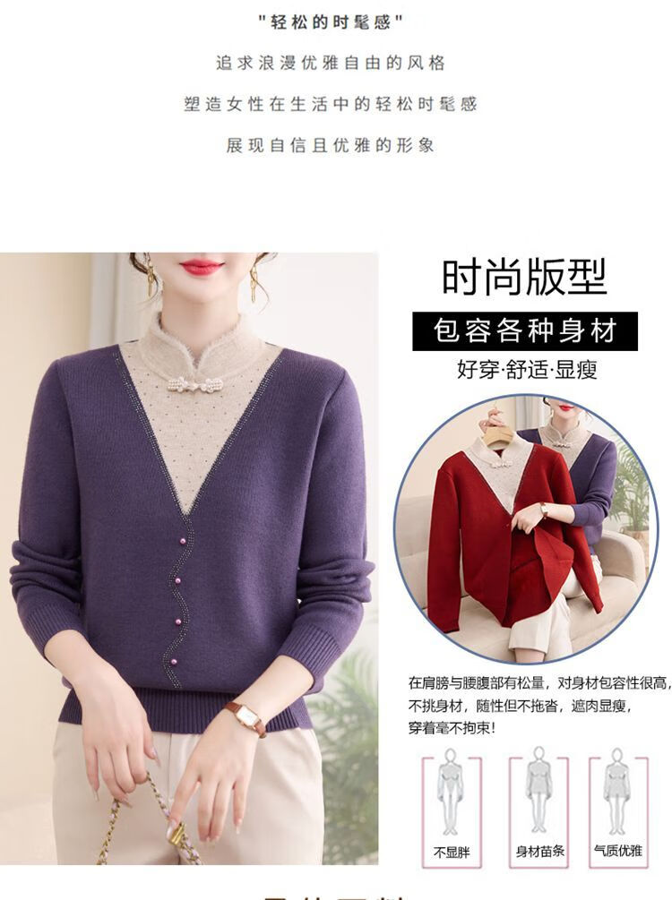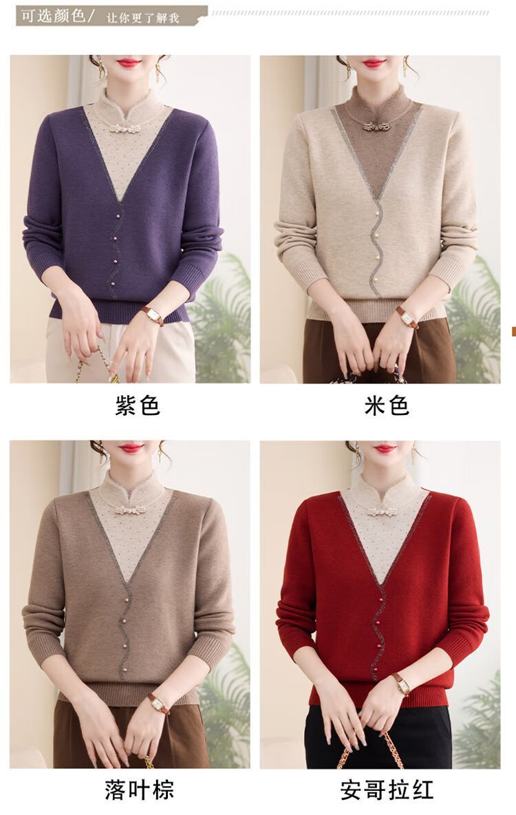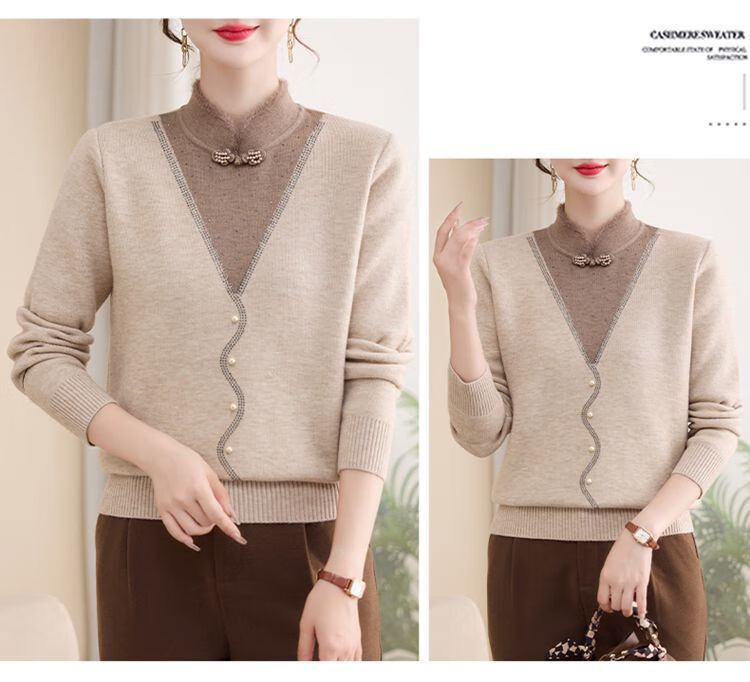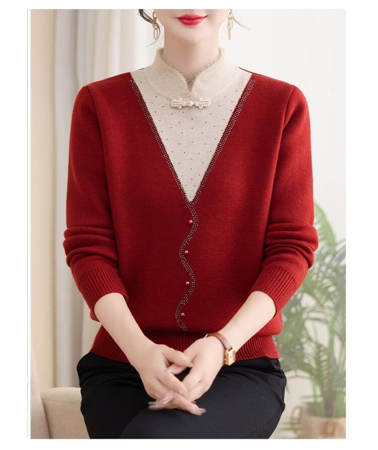 妈妈秋冬国风假两件毛衣一体绒针织打底衫新款女装加绒加厚上衣 【25125】安哥拉红 加绒 XL 建议90-110斤