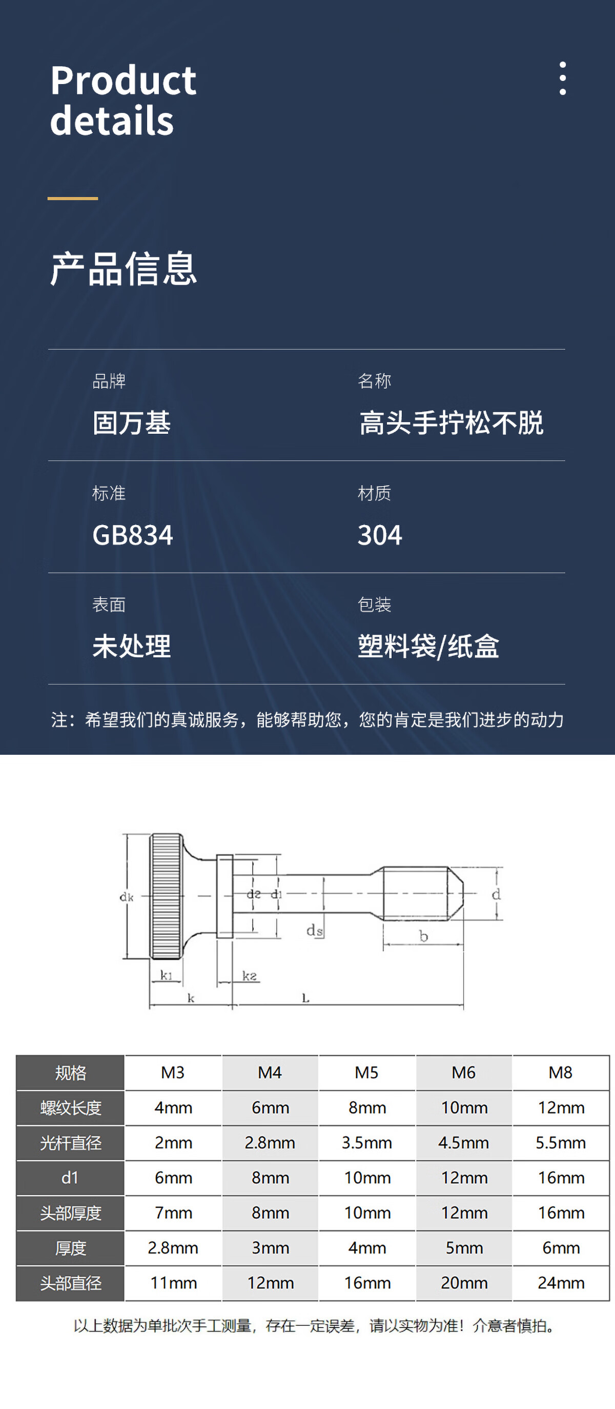 固万基(GUWANJI)304不锈钢高头GB834松不脱螺丝钉滚花手拧台阶螺栓防脱螺钉 M3x6[5只]