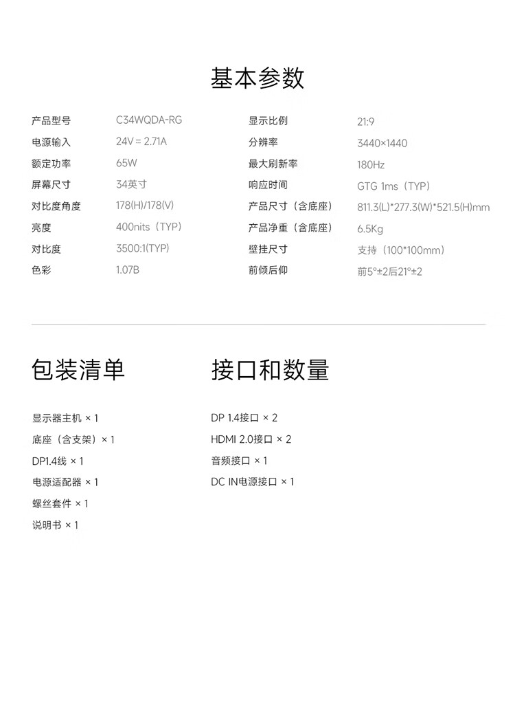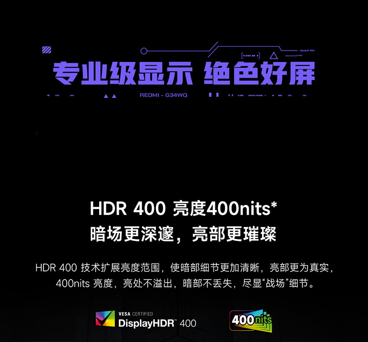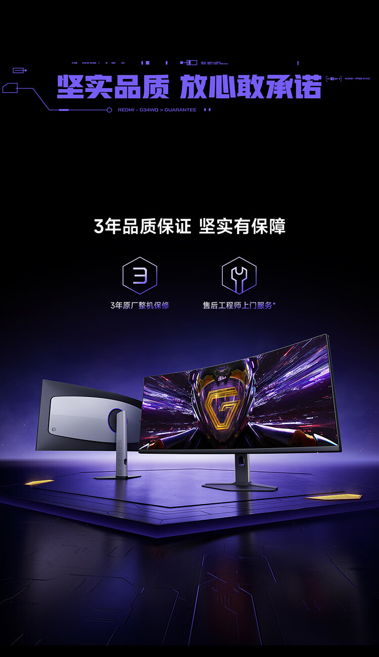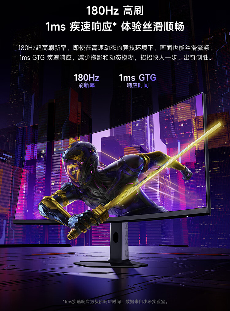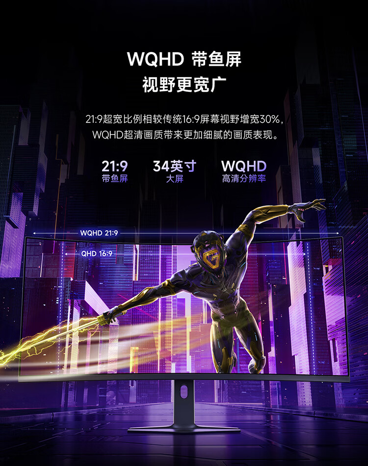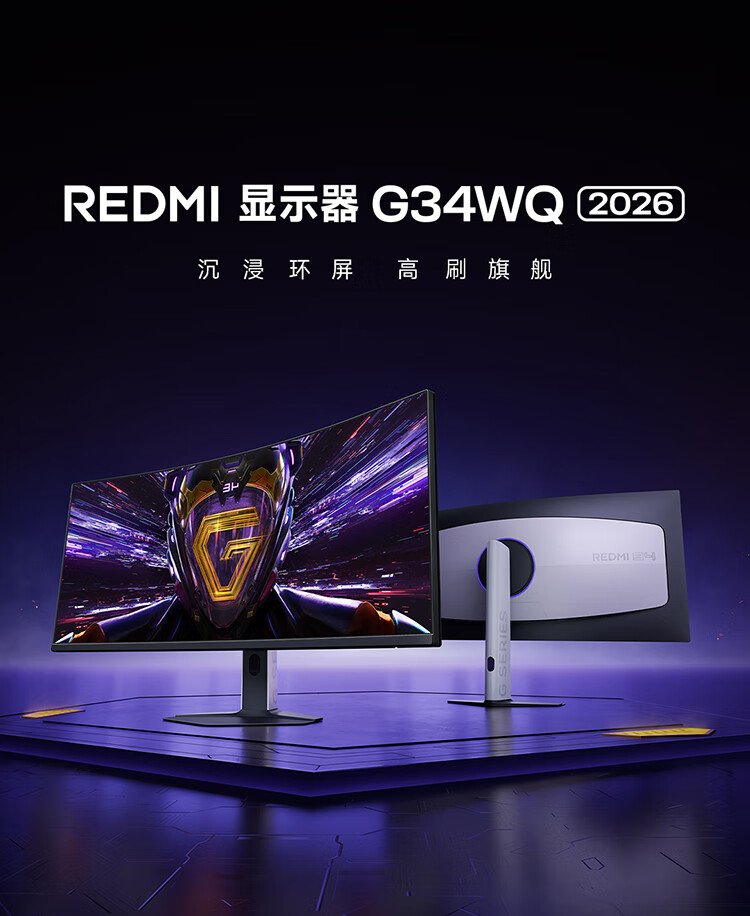 小米(MI)REDMI 34英寸电竞显示器 180Hz高刷新率 HDR400 双重广色域 WQHD曲面带鱼屏显示屏 G34WQ 2026款