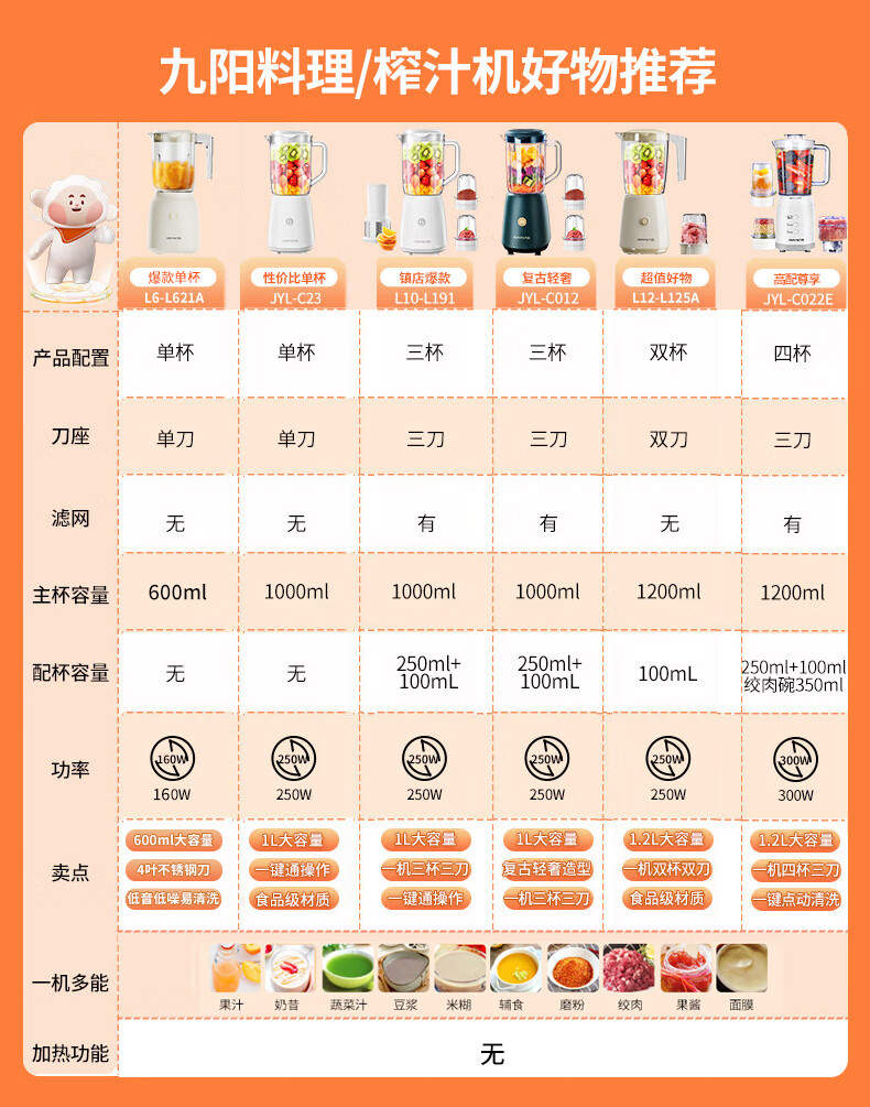 九阳(Joyoung)榨汁料理机榨汁杯多功能易清洗家用1升搅拌机 打米糊果汁机婴儿辅食机YL-C23