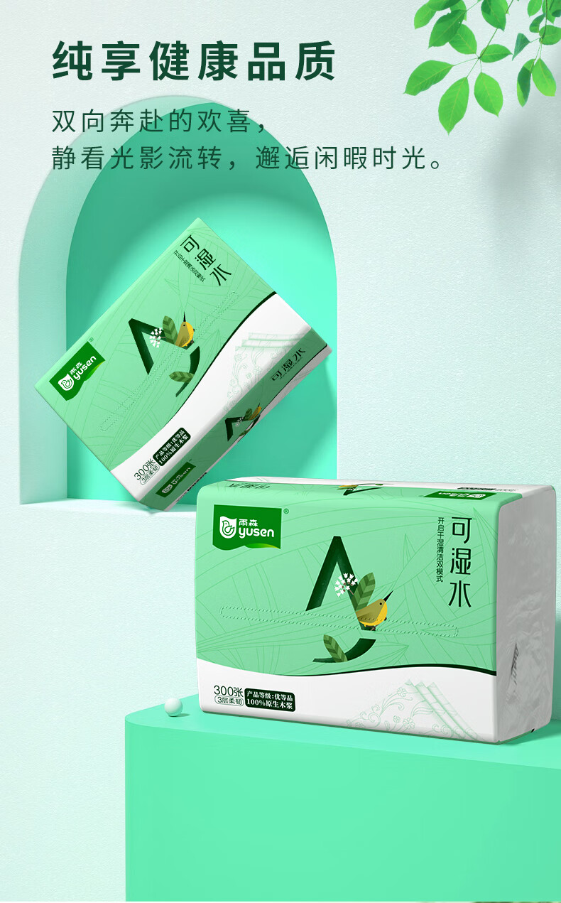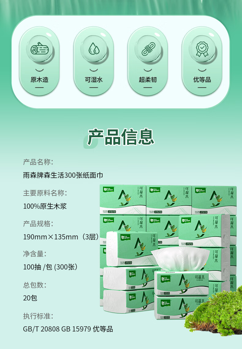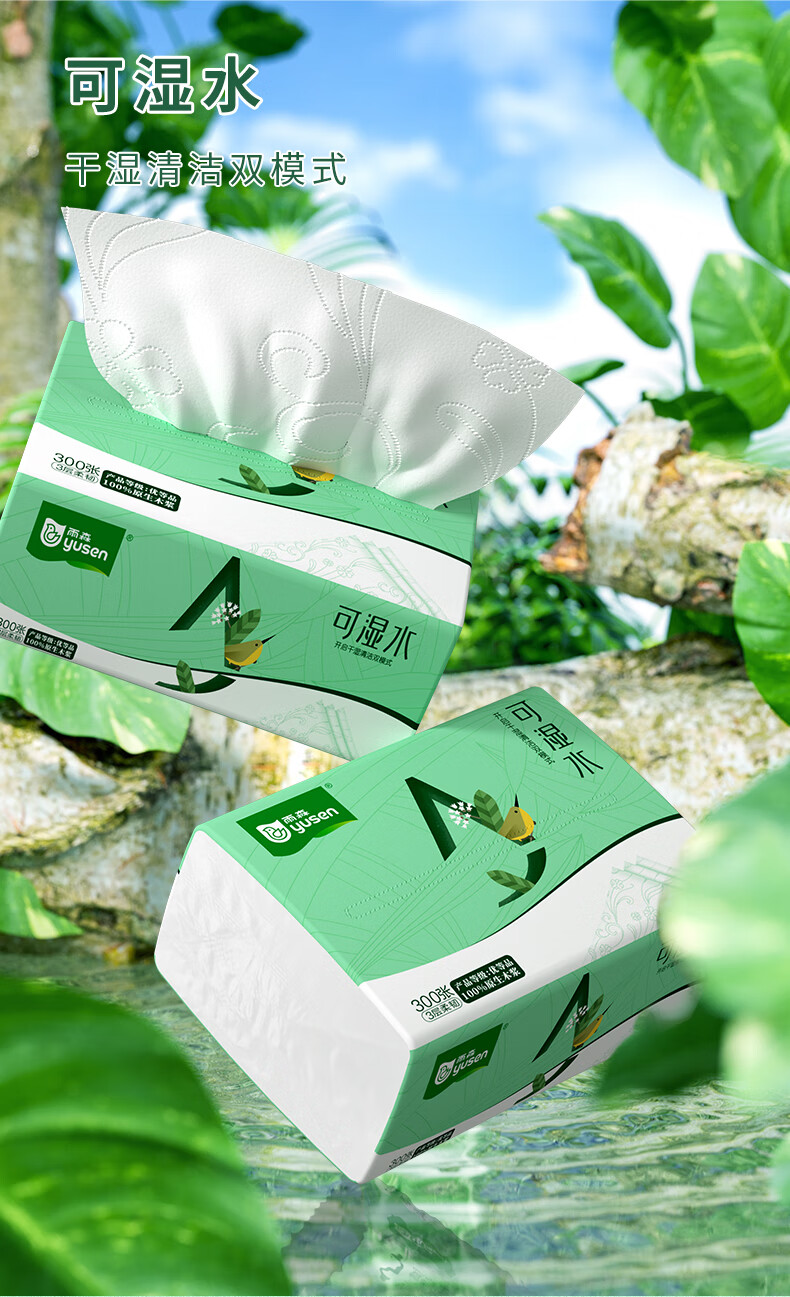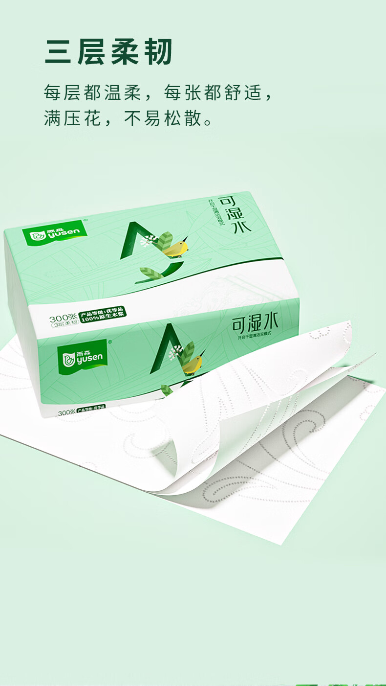 雨森可湿水抽纸家用纸巾100%原生木浆干湿两用卫生纸纸抽整箱 3层 100抽*20包 【190*135mm】