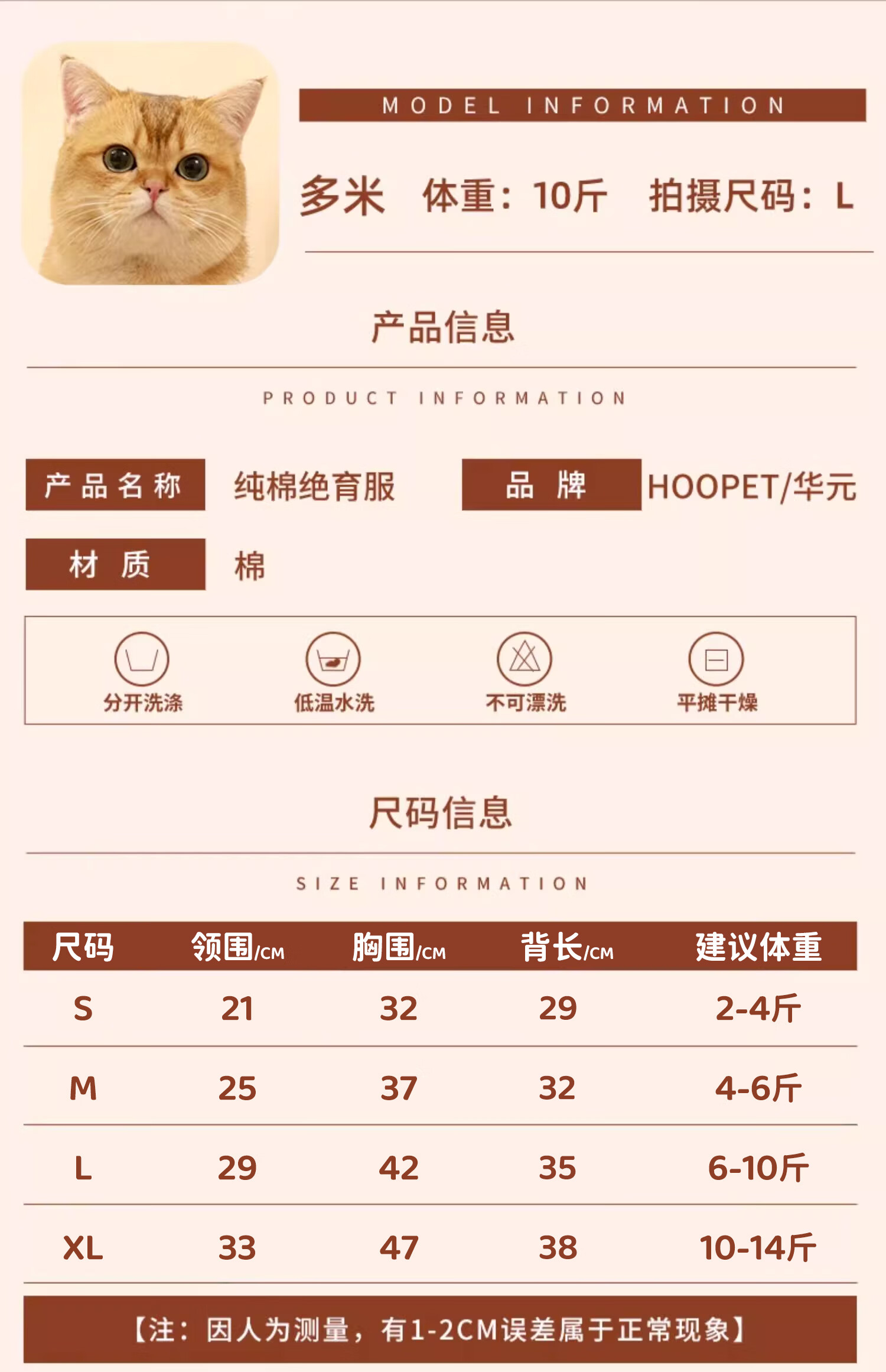 华元宠具(hoopet)猫咪绝育服宠物小狗狗母猫猫手术服透气戒奶服公猫防舔术后用衣服