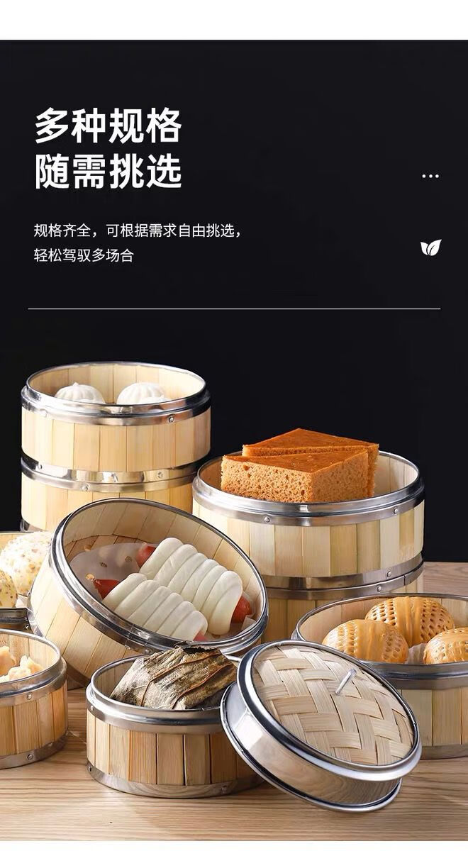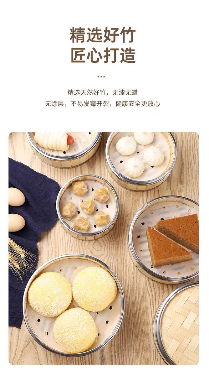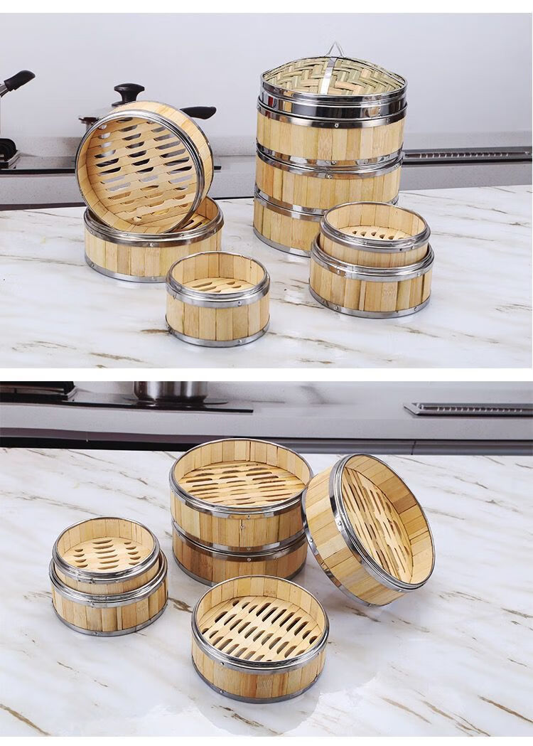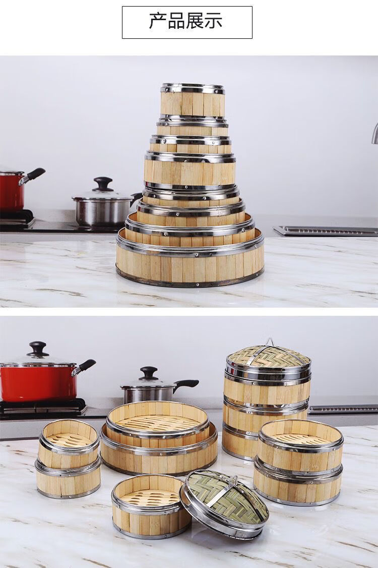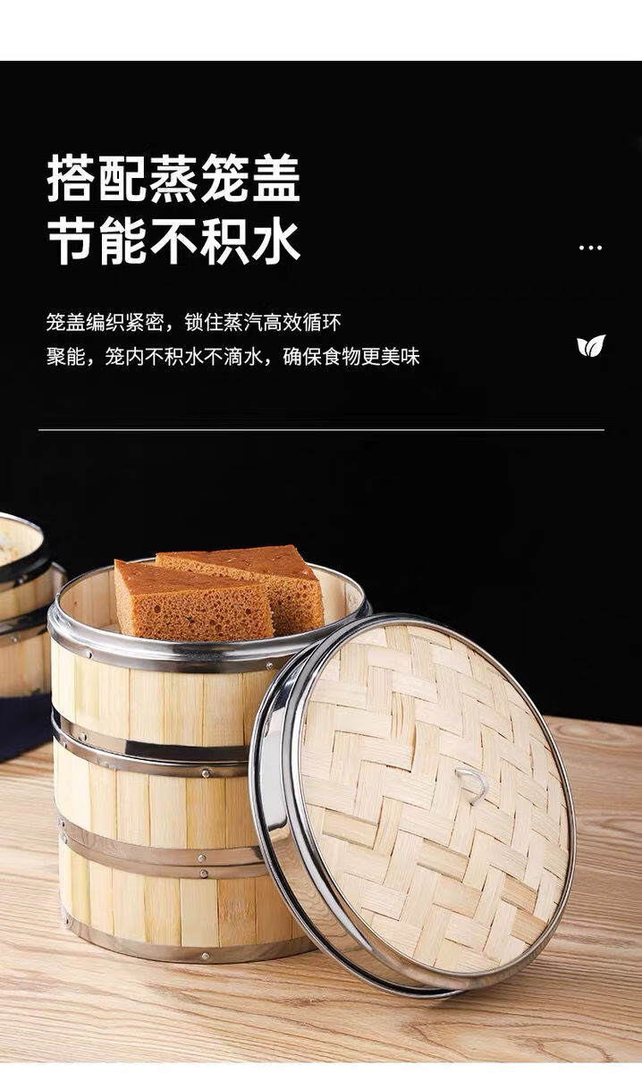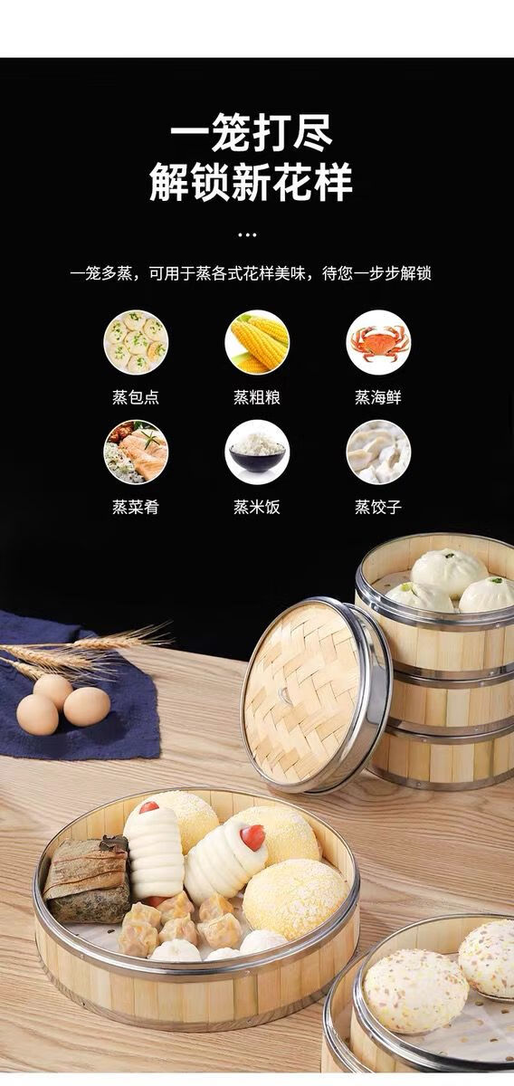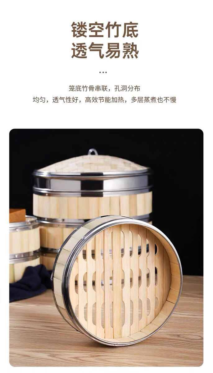 GIOIO竹制蒸笼小笼包加深不锈钢包边蒸格蒸饭商用饺子茶餐厅蒸屉圆形 二笼一盖【钢边】 13.5cm(装小笼包3个左右)