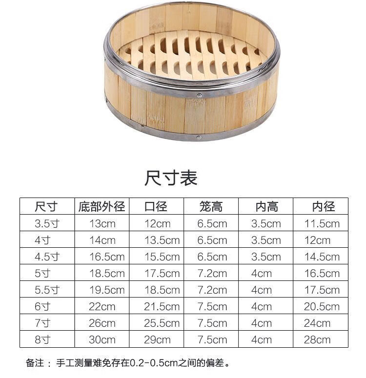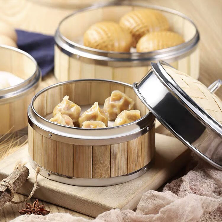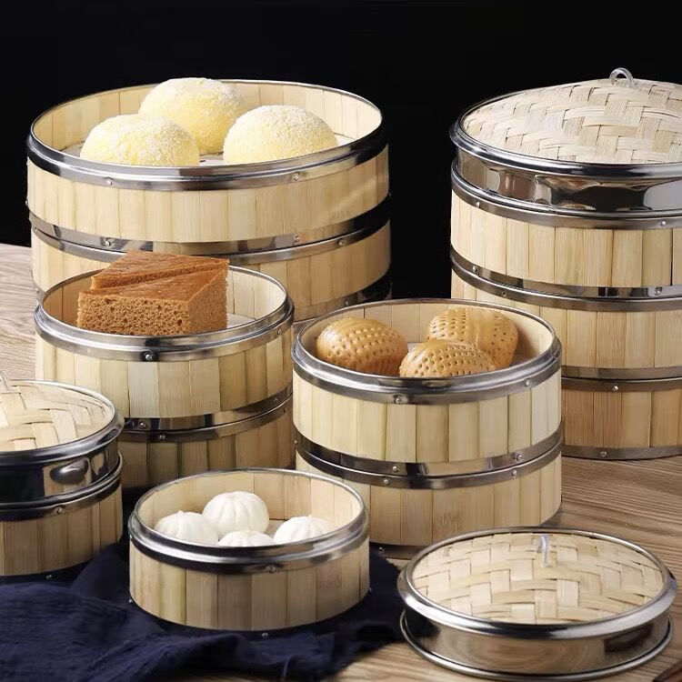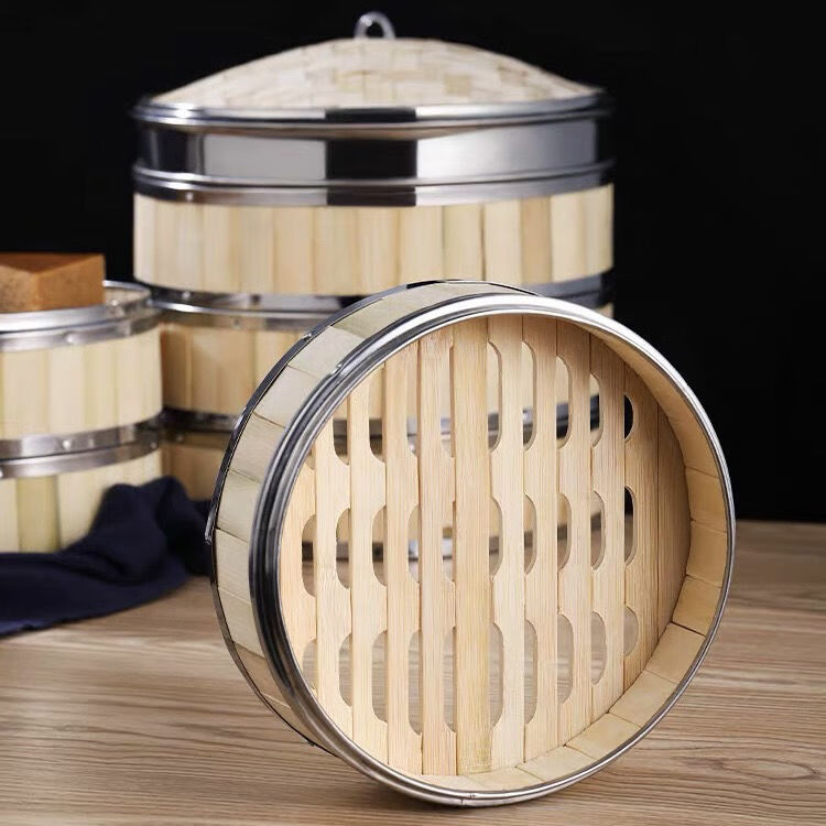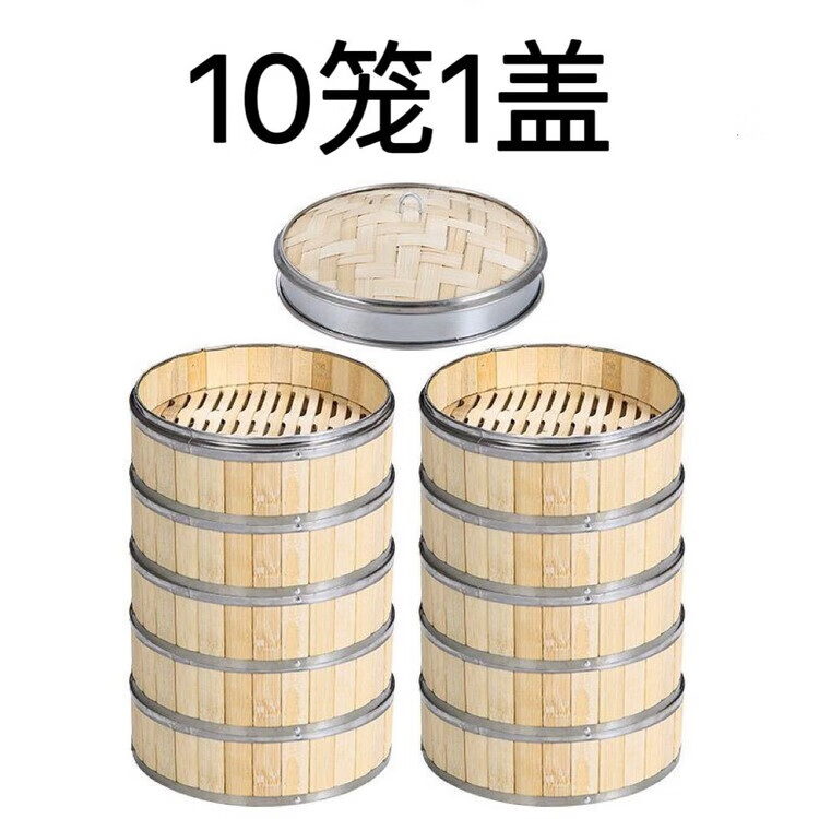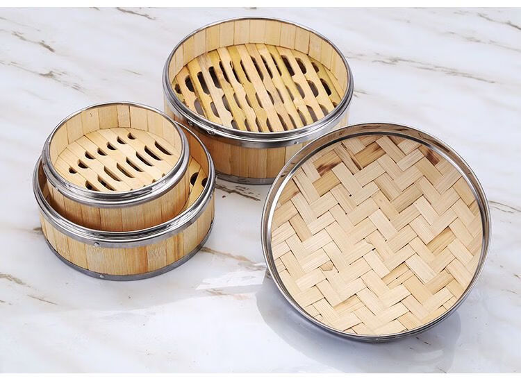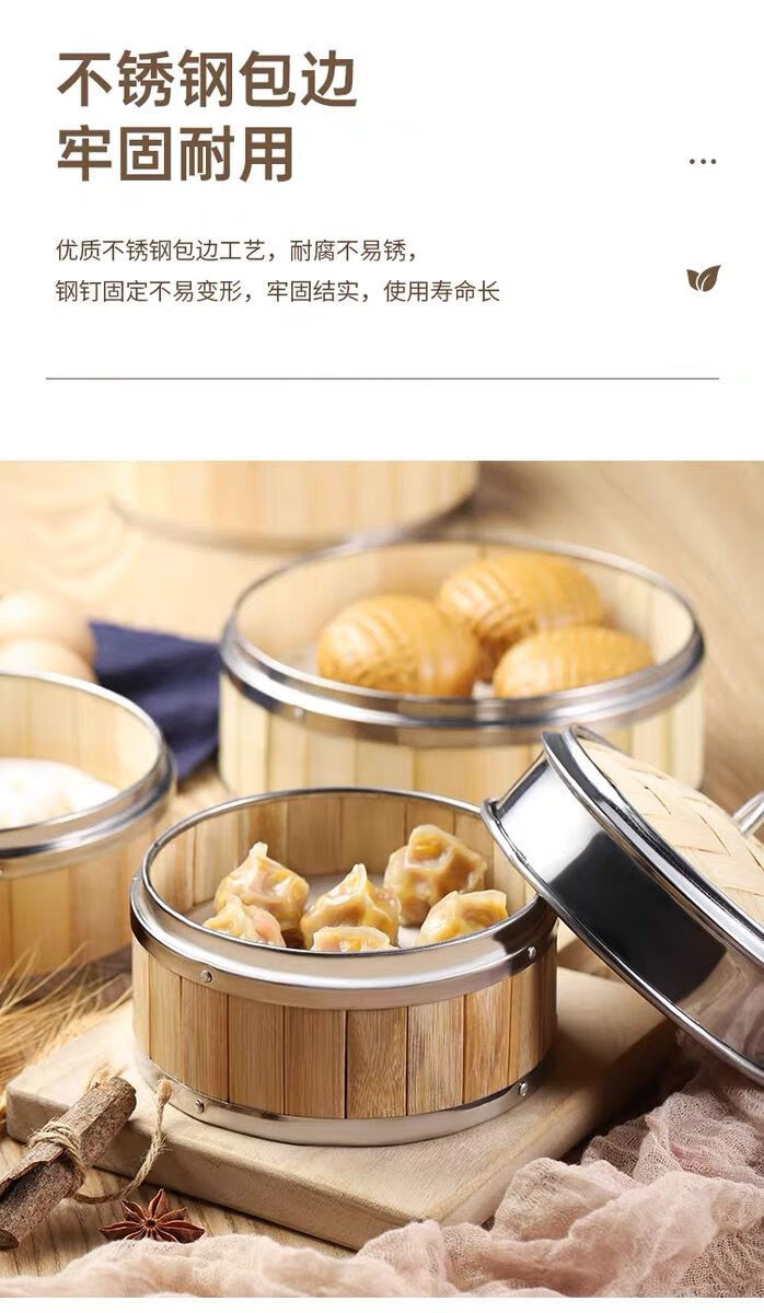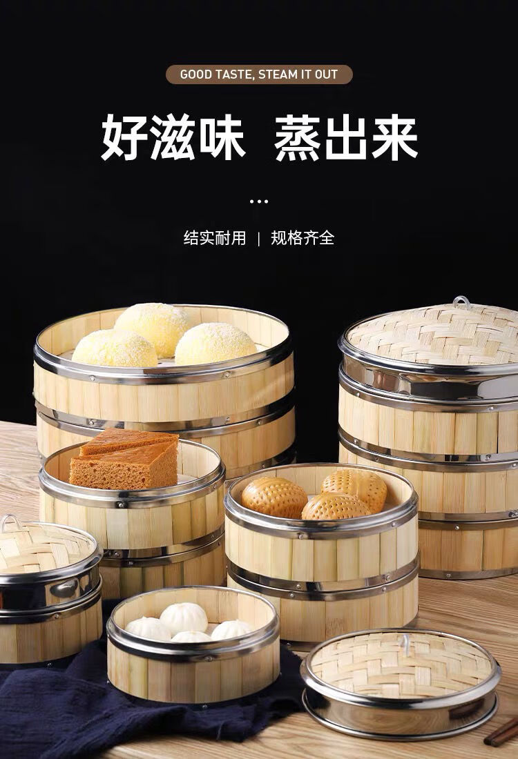 GIOIO竹制蒸笼小笼包加深不锈钢包边蒸格蒸饭商用饺子茶餐厅蒸屉圆形 二笼一盖【钢边】 13.5cm(装小笼包3个左右)