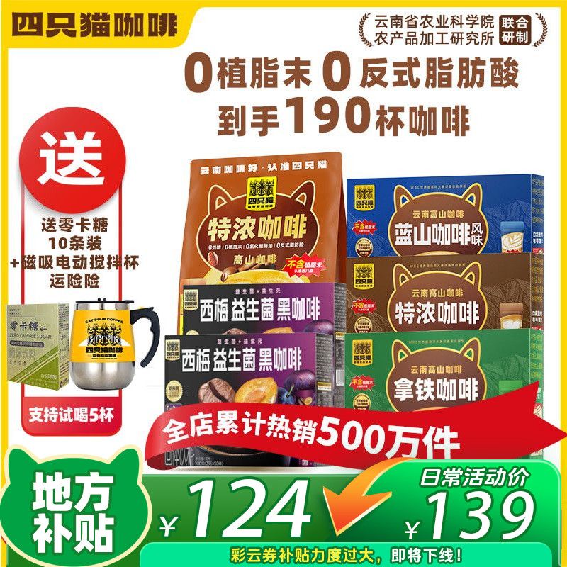 190杯+搅拌杯+零卡糖】拿铁蓝山特浓卡布黑咖啡 四只猫 速溶咖啡