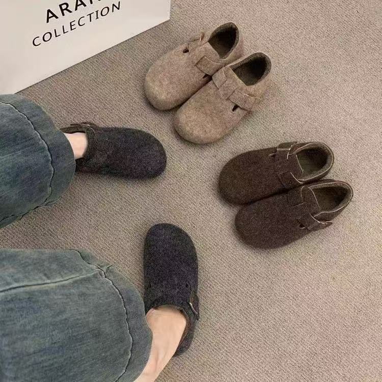 2025新款棉鞋女勃肯秋冬加绒鞋女日系复古平底软底豆豆鞋毛毛鞋女