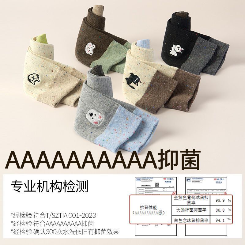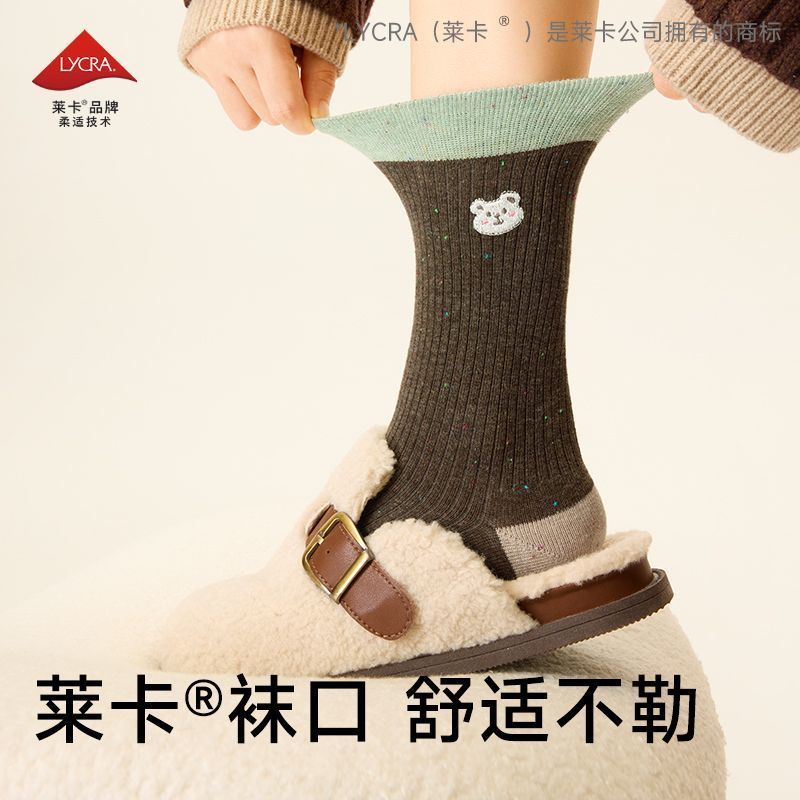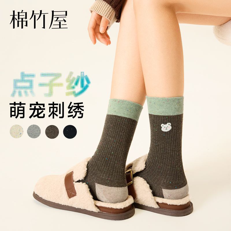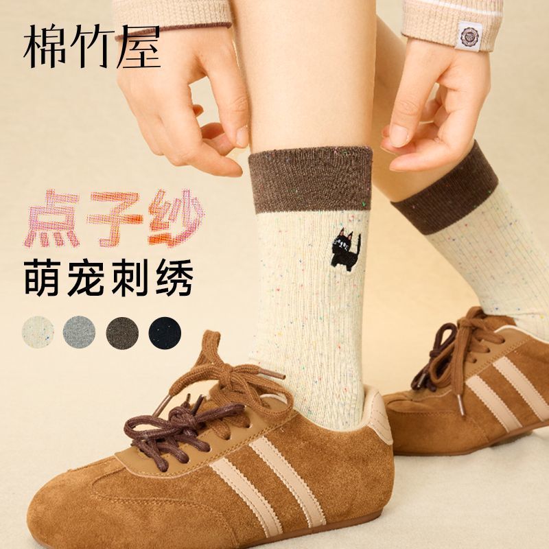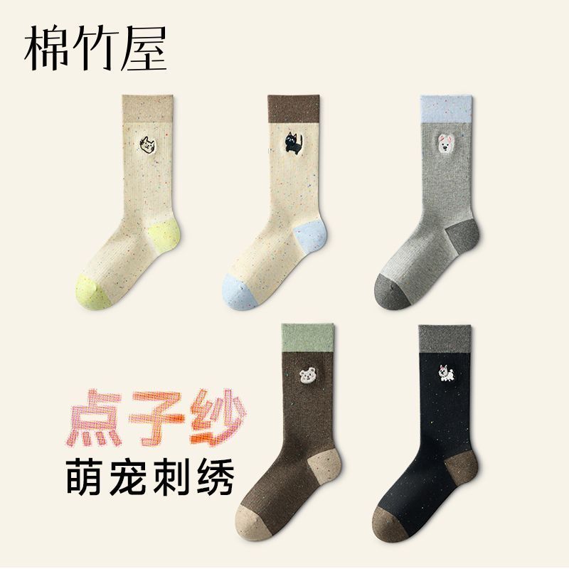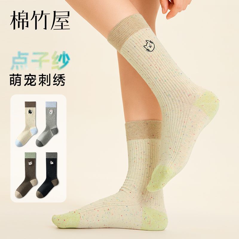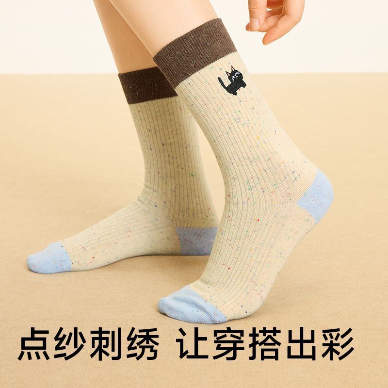 袜子女款纯棉中筒袜点子纱刺绣春秋季2025新款爆款抗菌防臭无骨袜