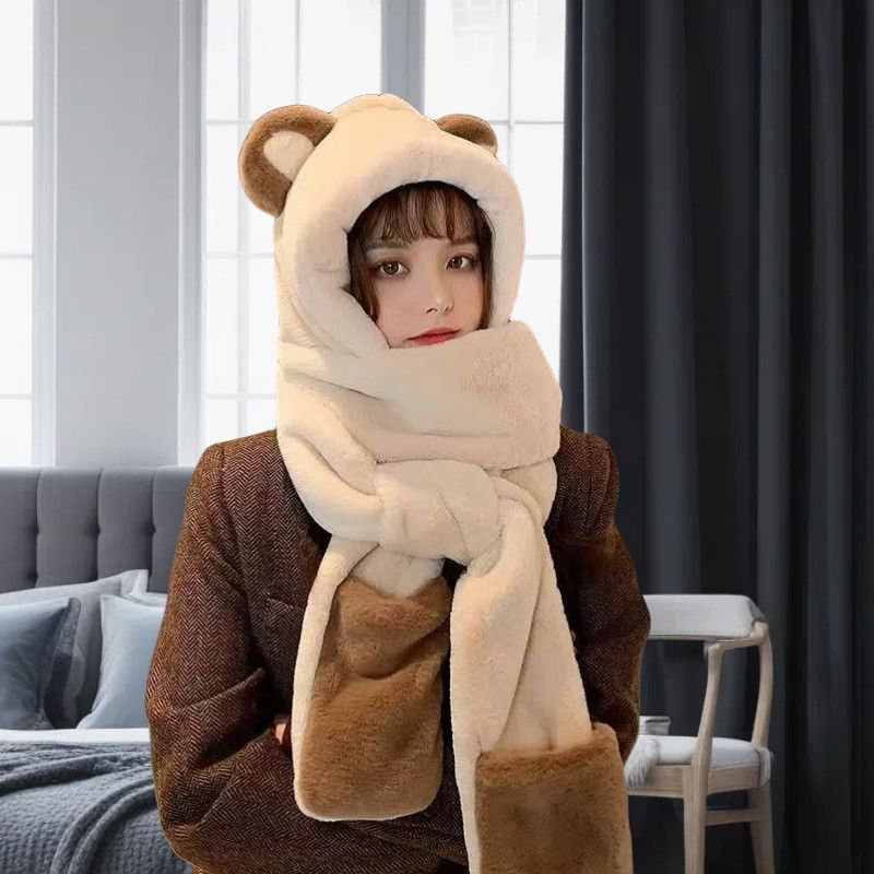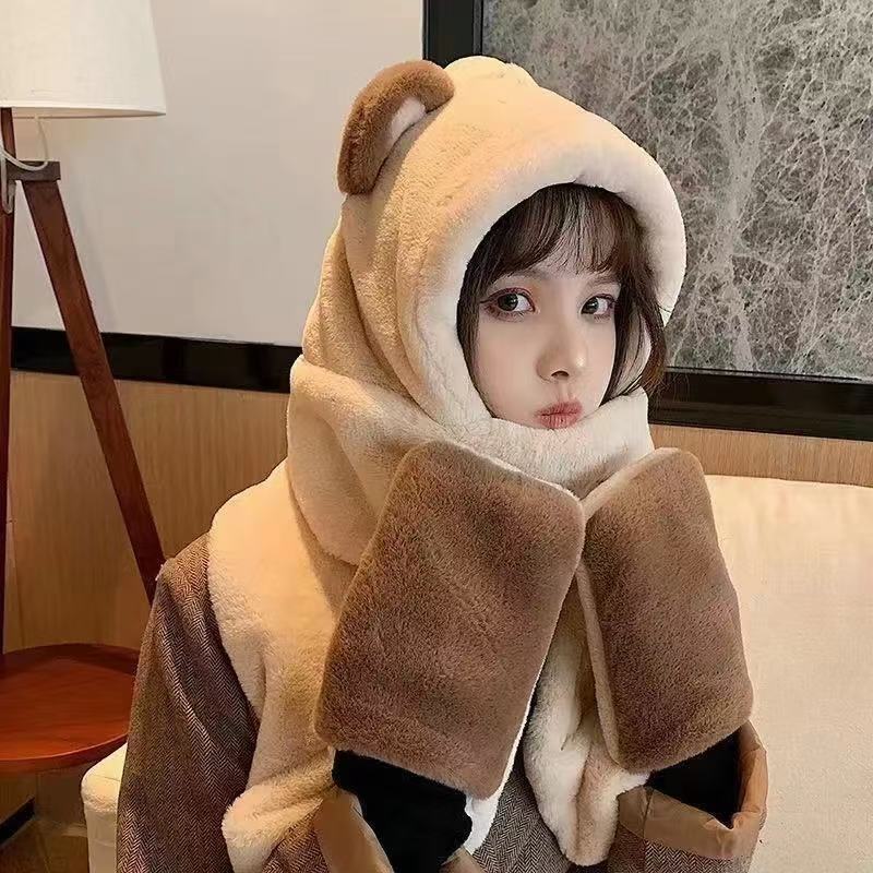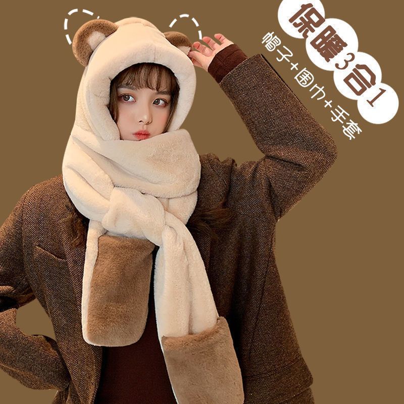 加厚小熊三件套帽子围巾一体女冬季可爱毛绒连帽护耳手套围脖保暖