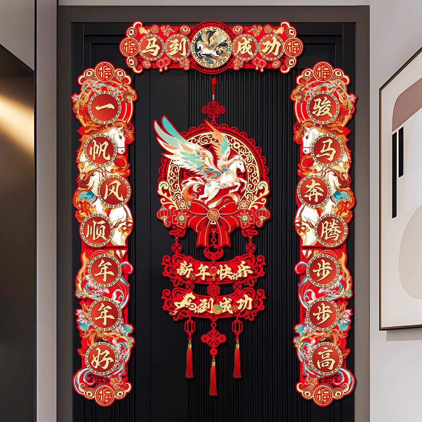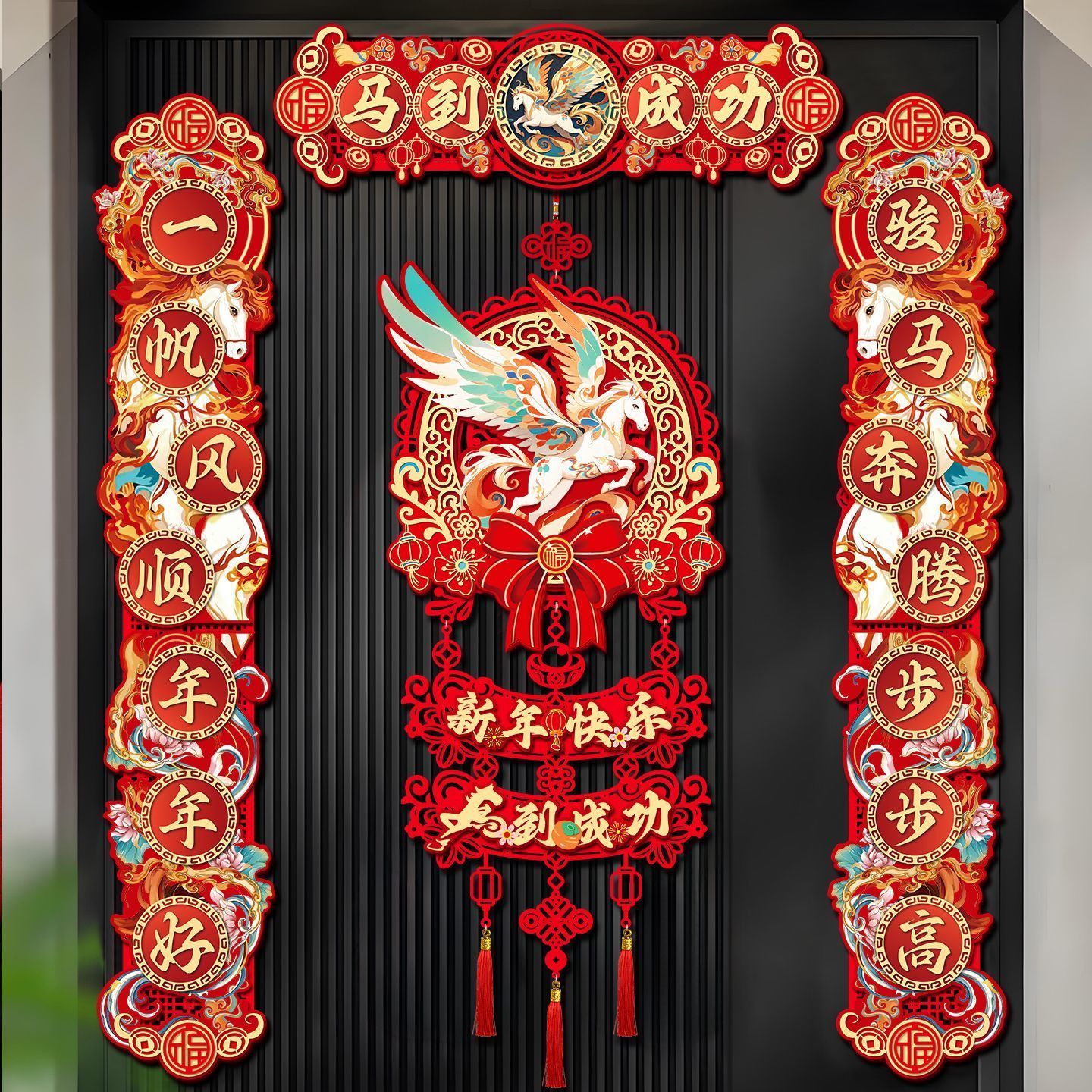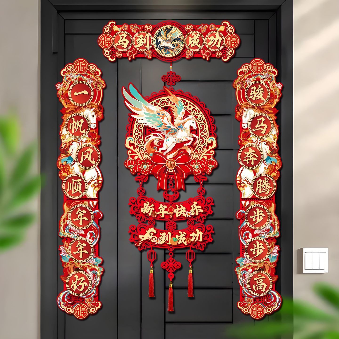 2026马年对联植绒春联门贴门幅磁吸对联家用挂钩垃圾袋工艺扇#011