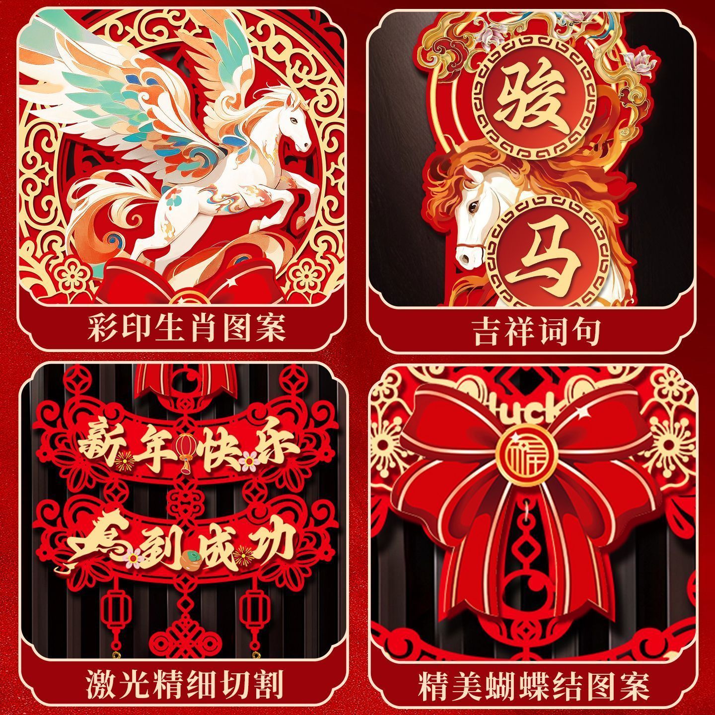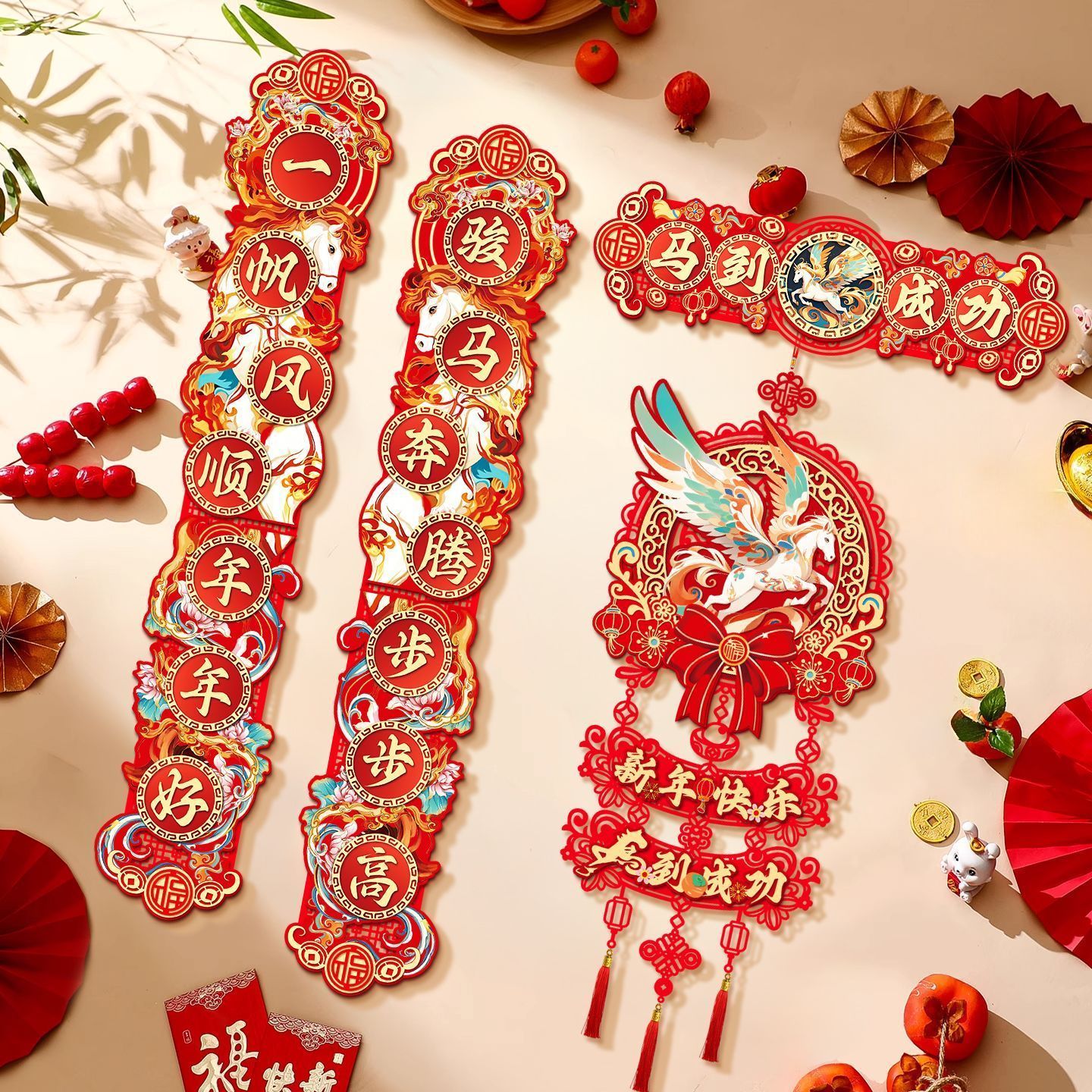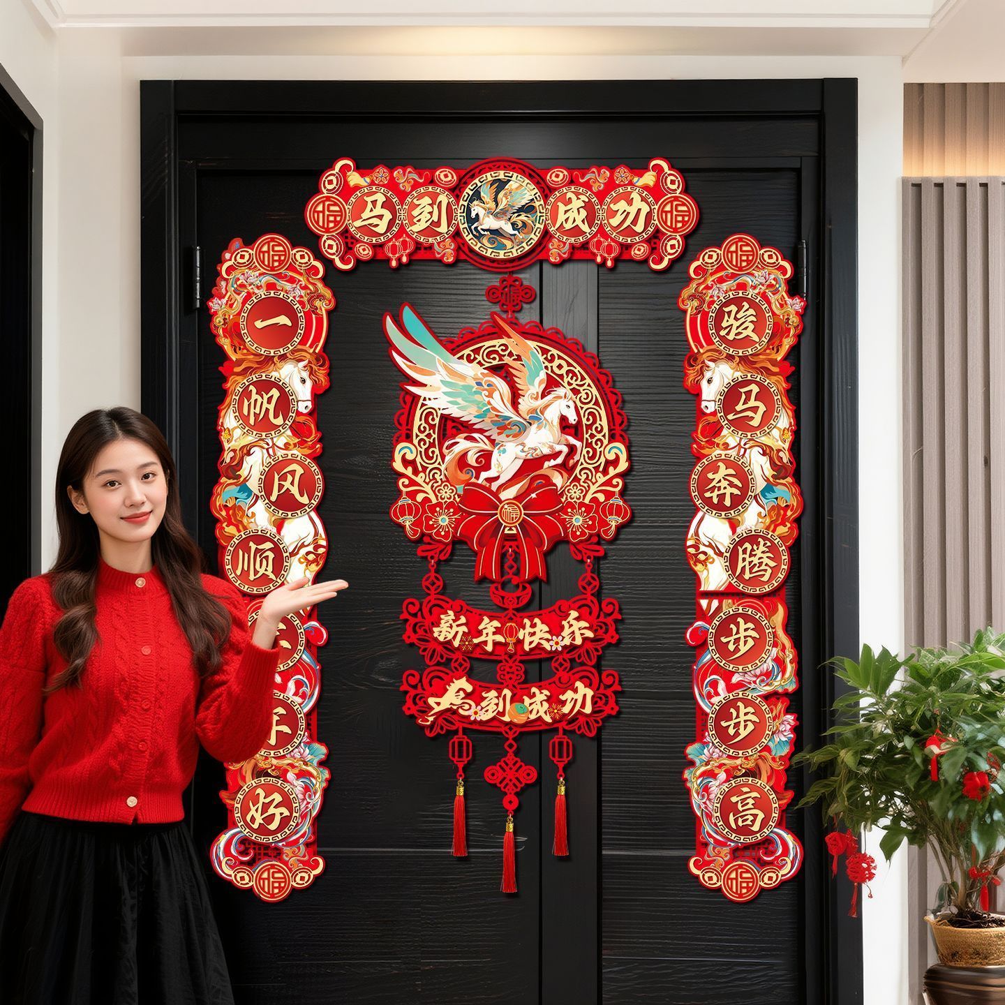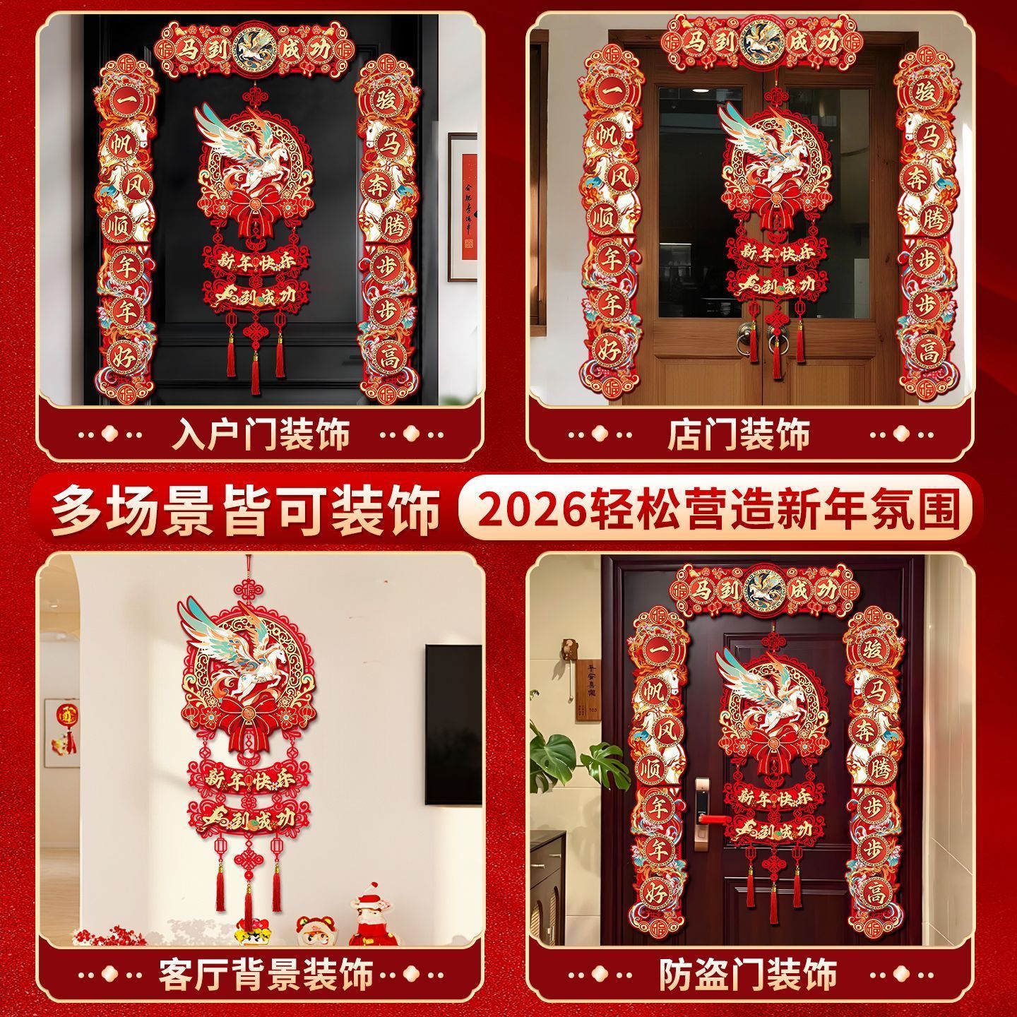 2026马年对联植绒春联门贴门幅磁吸对联家用挂钩垃圾袋工艺扇#011