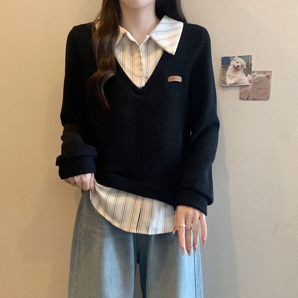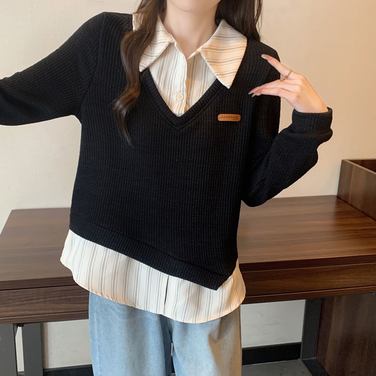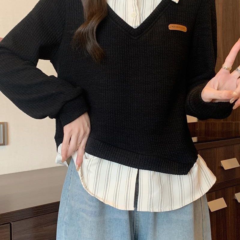 大码春秋新款韩版mm宽松显瘦假两件长袖女装卫衣条纹衬衫拼接上衣