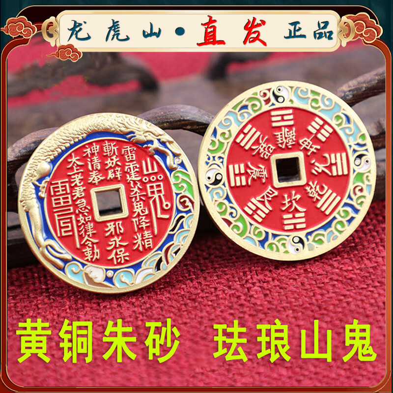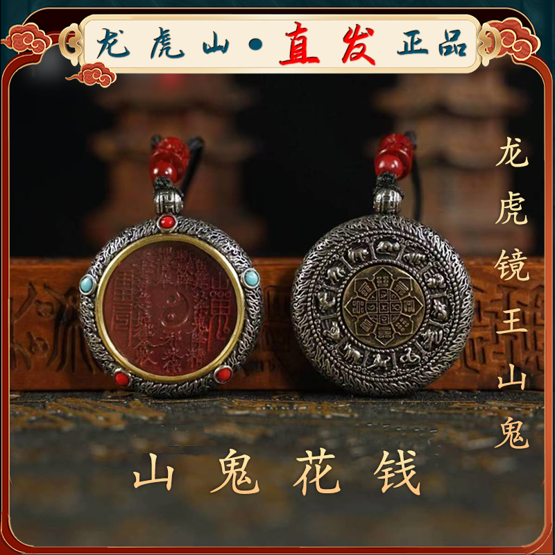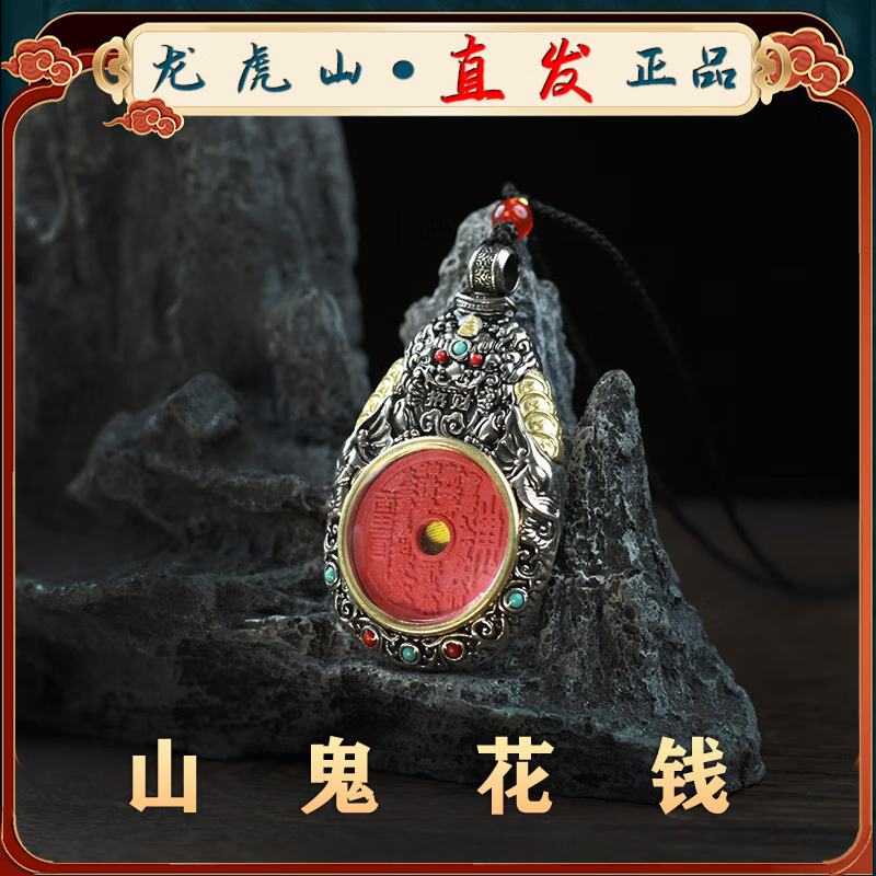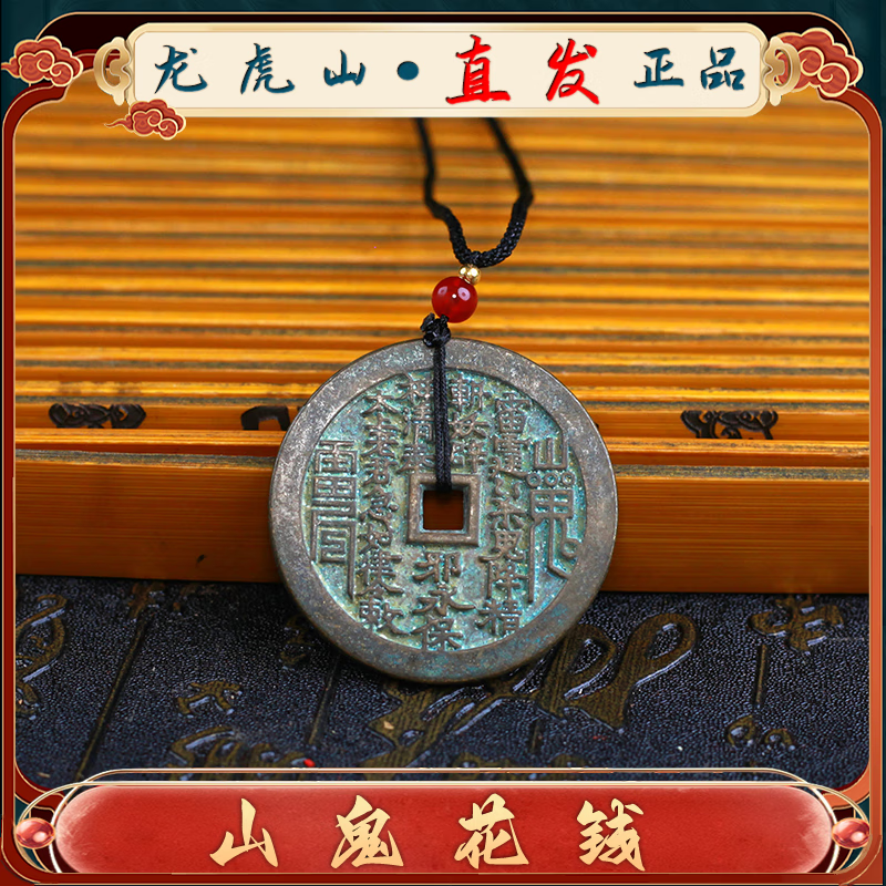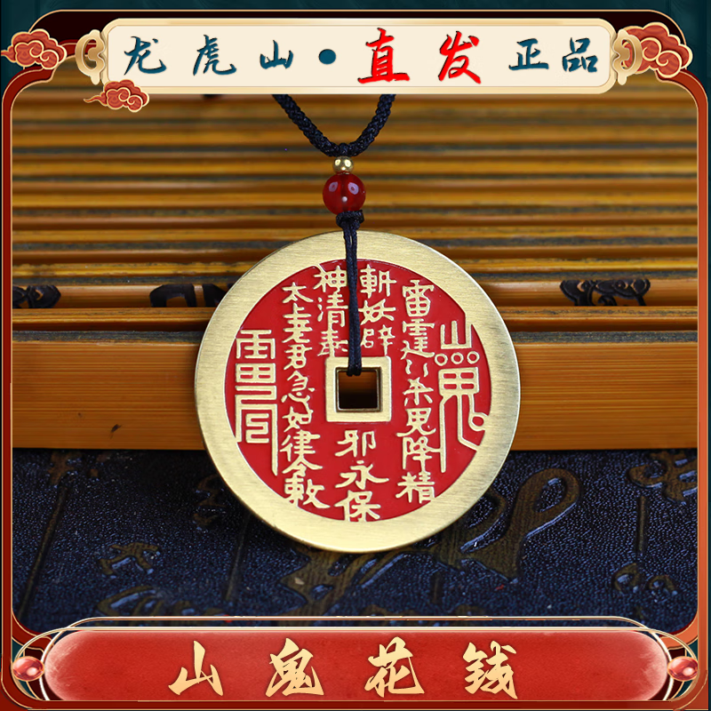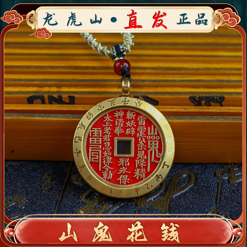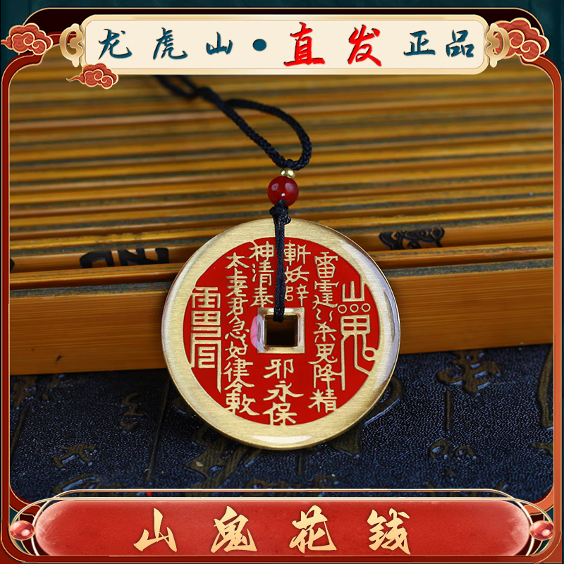 【龙虎山直发】山鬼花钱吊坠道家真品古钱币项链朱砂八卦铜钱饰品 手工填朱砂山鬼花钱3.0cm 配绳子 手工绑好 锦囊包好寄出