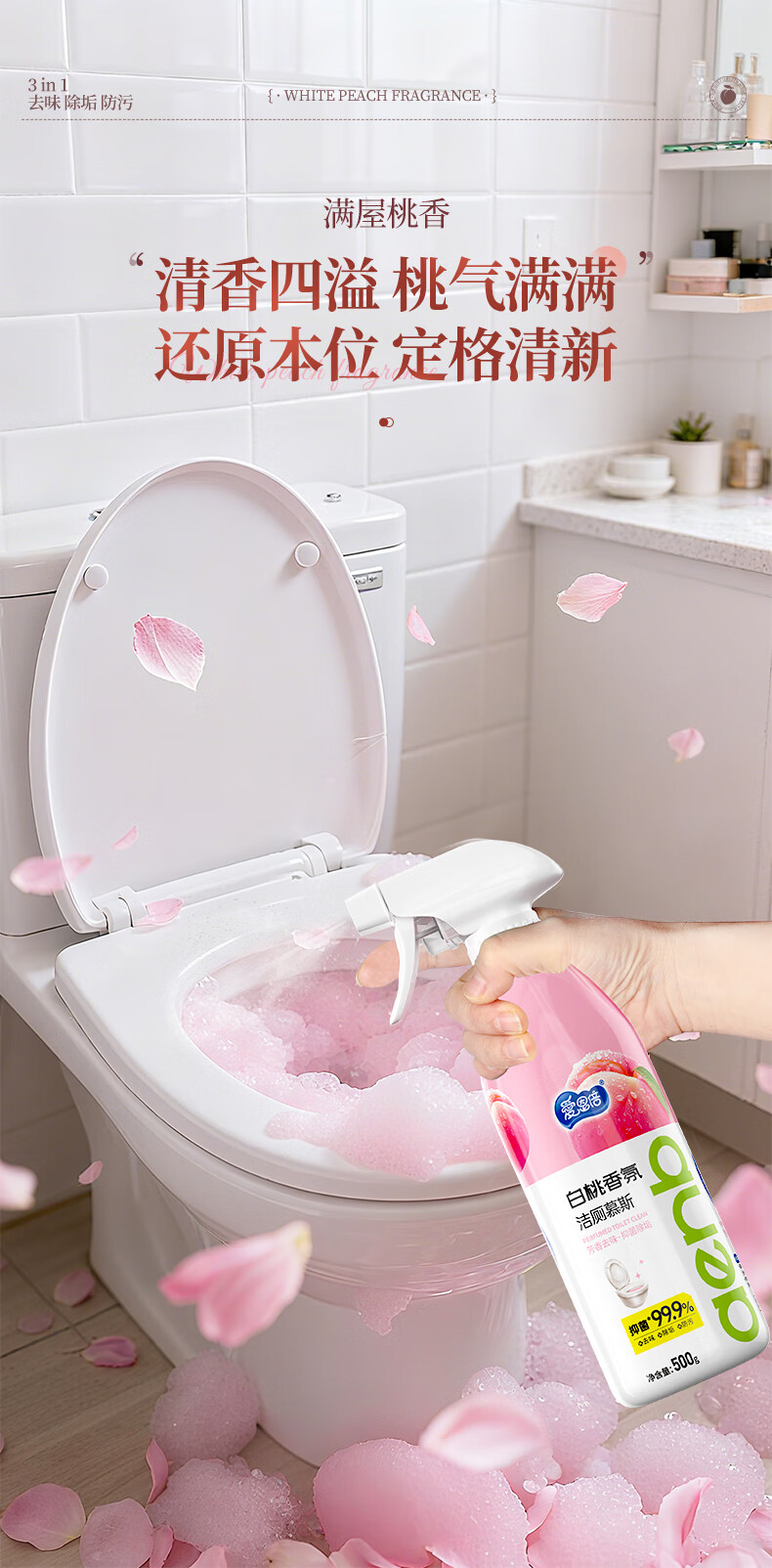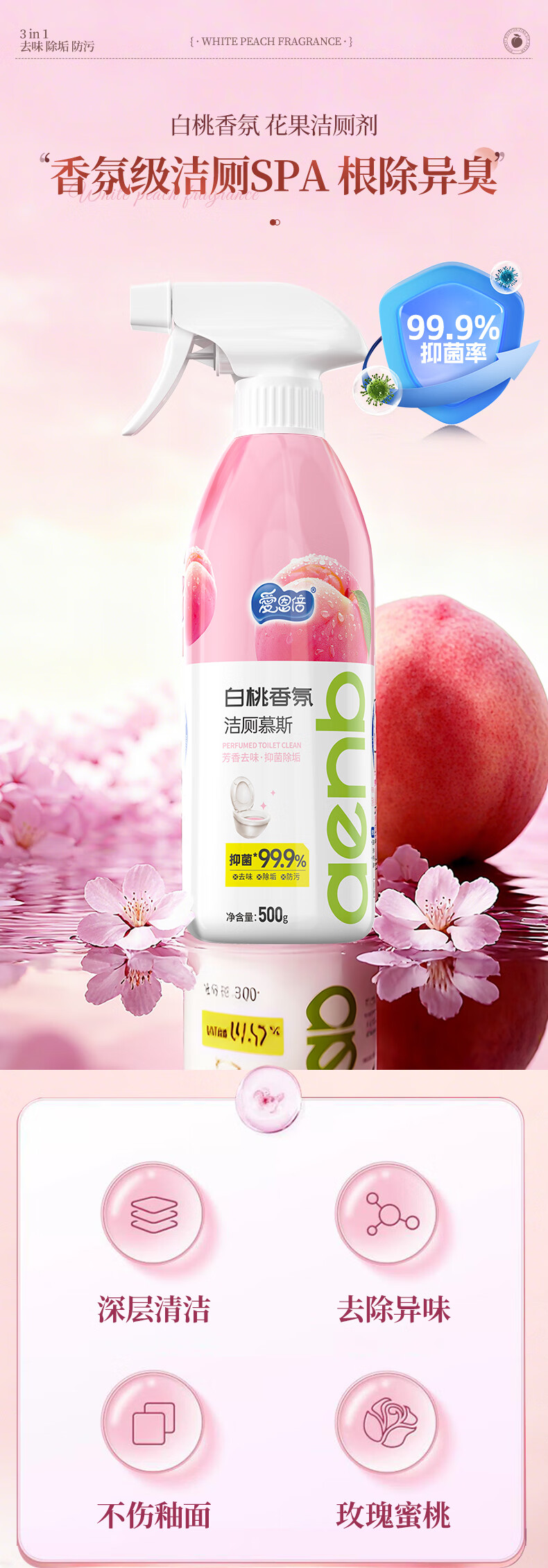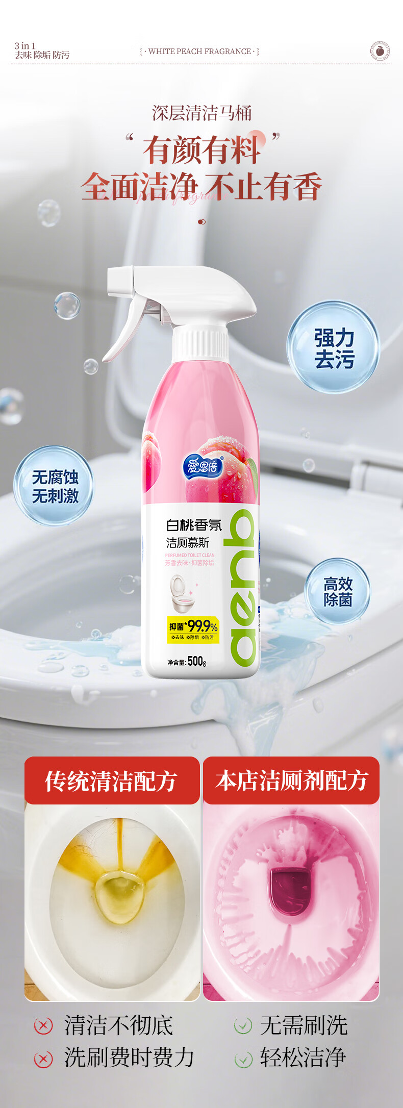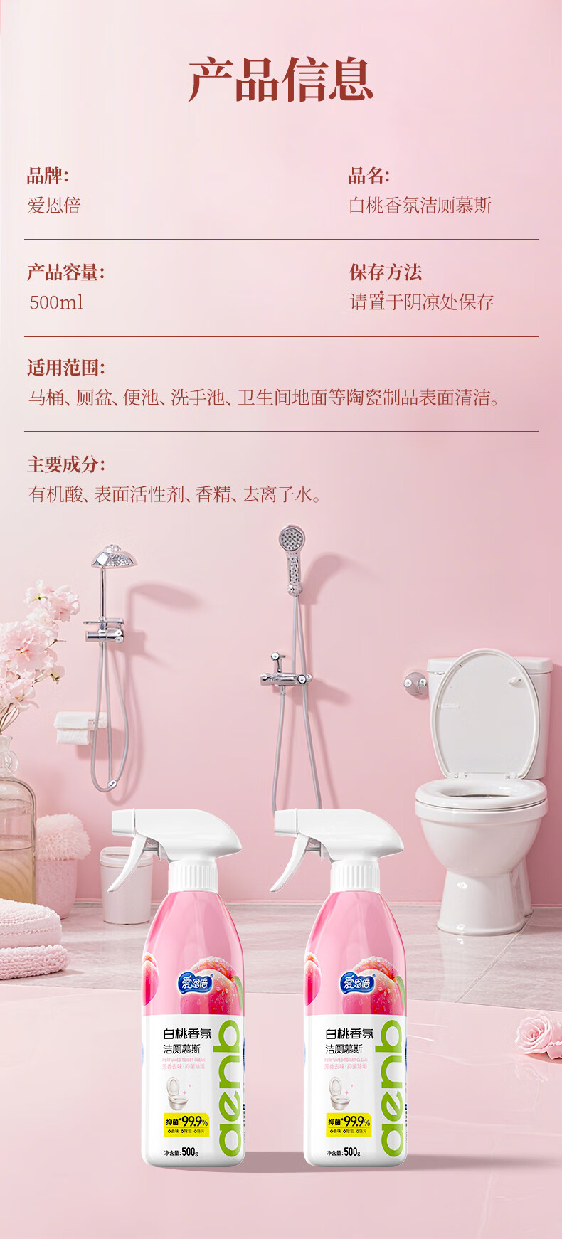 爱恩倍马桶清洁慕斯清洁剂洁厕泡泡厕所洁厕灵泡沫除垢去异味留香 白桃味 500g 2瓶 +1个喷头
