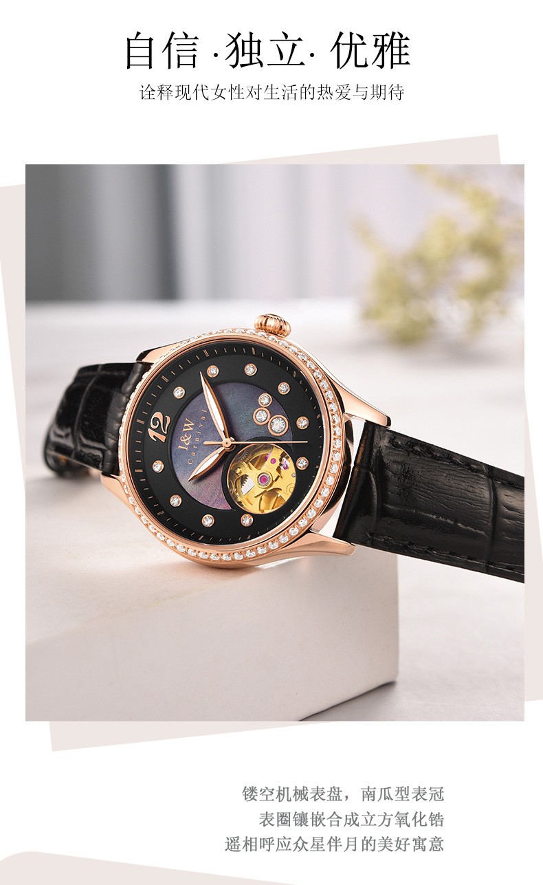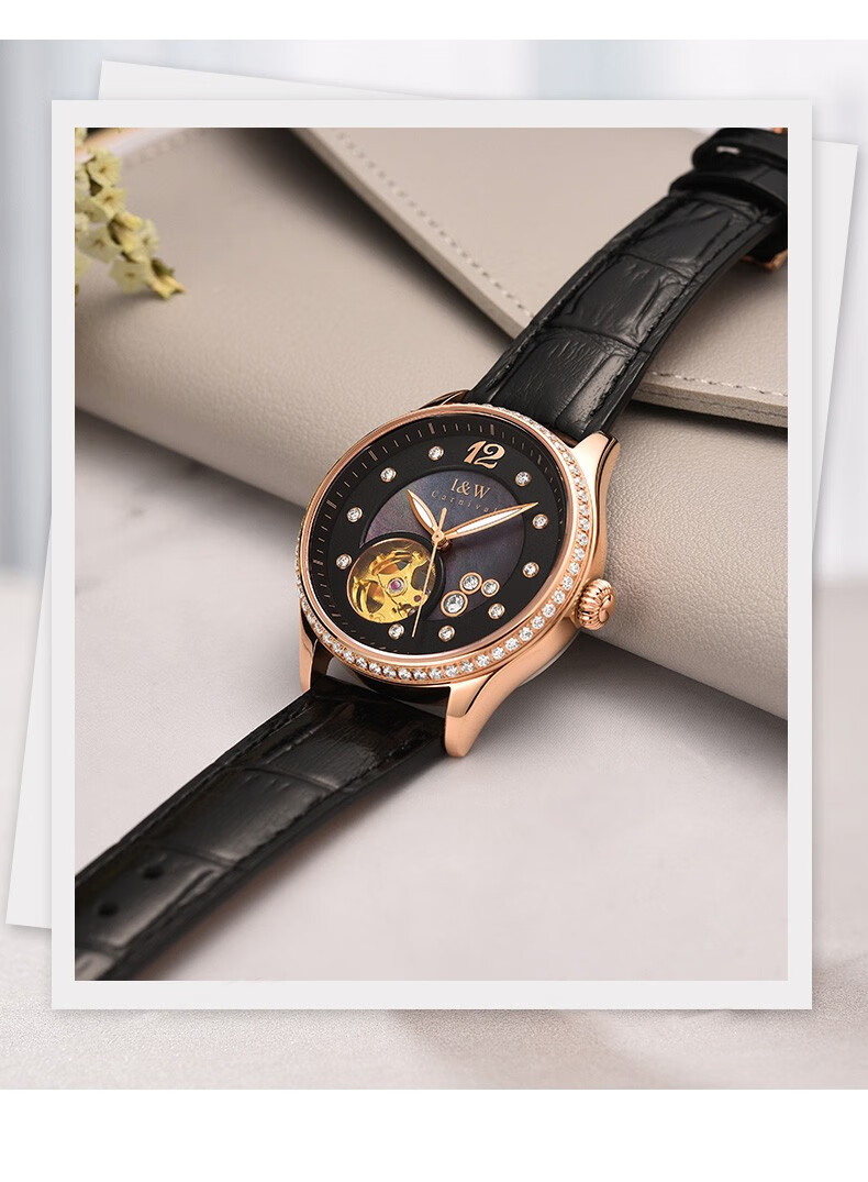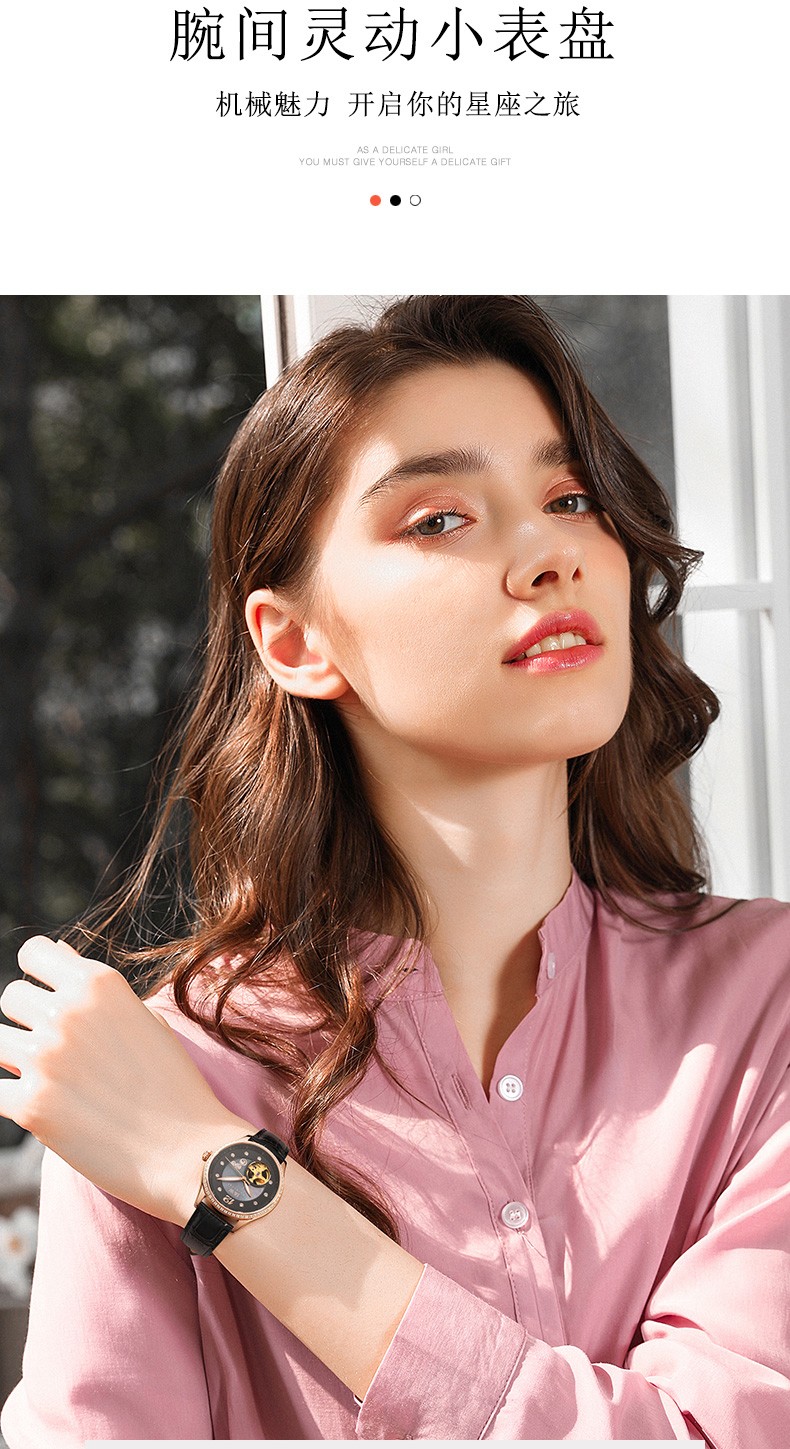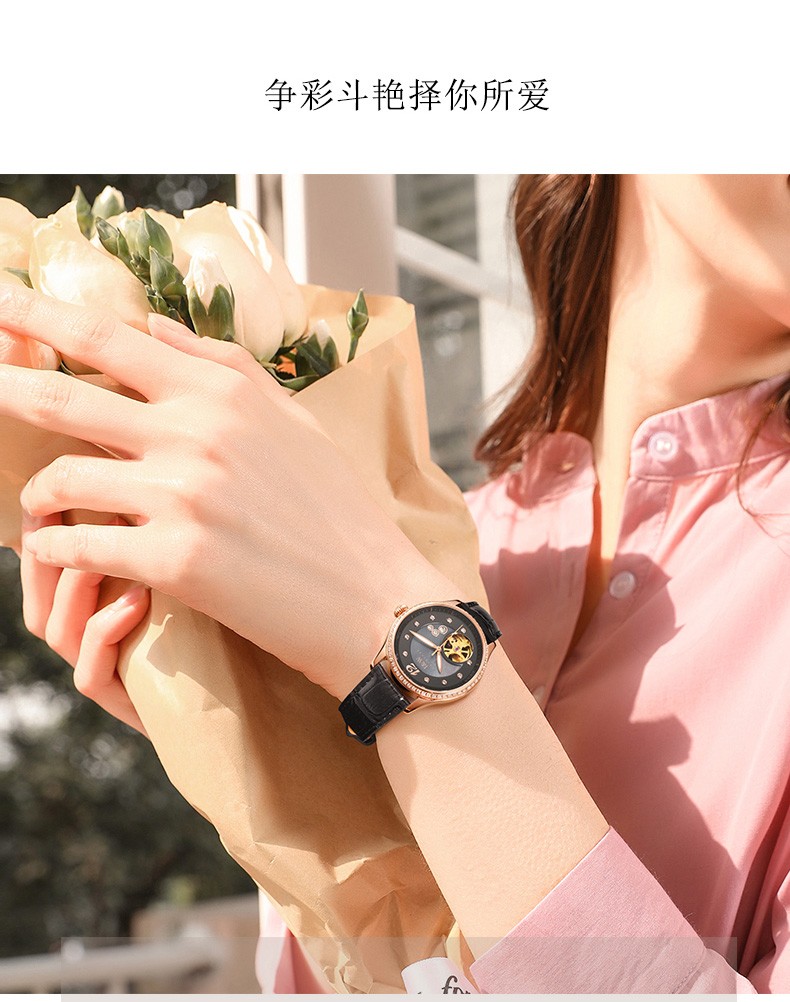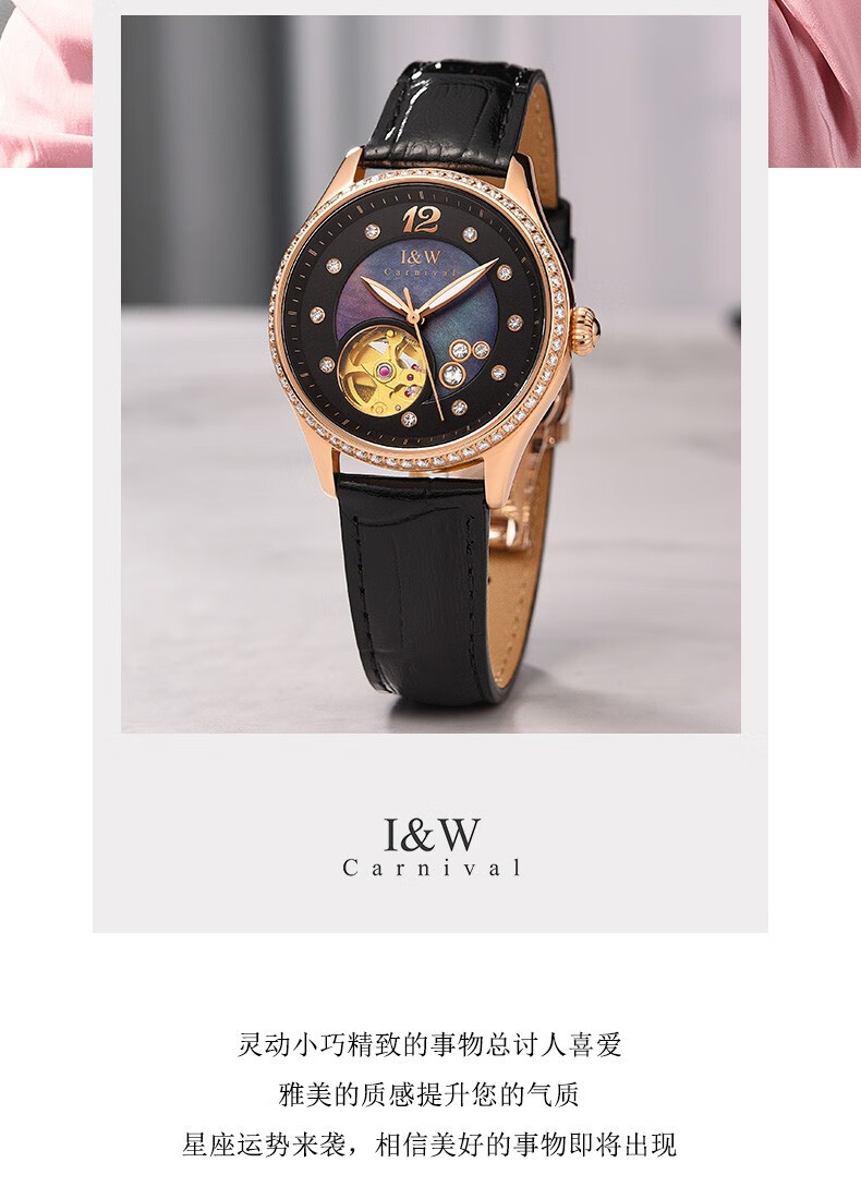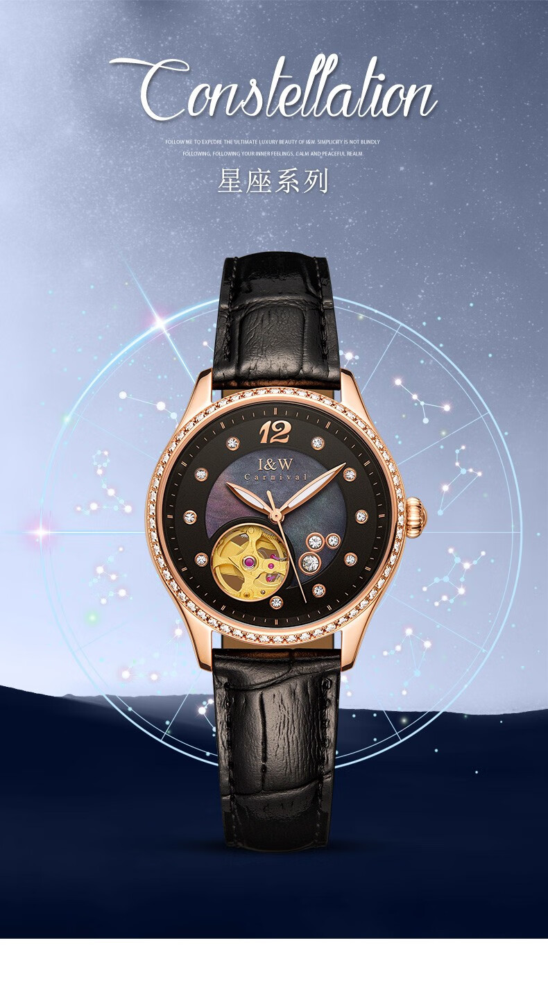 爱沃驰瑞士星座系列时尚镂空防水全自动机械手表女士表七夕生日礼物送女 玫壳白盘黑皮|进口机芯